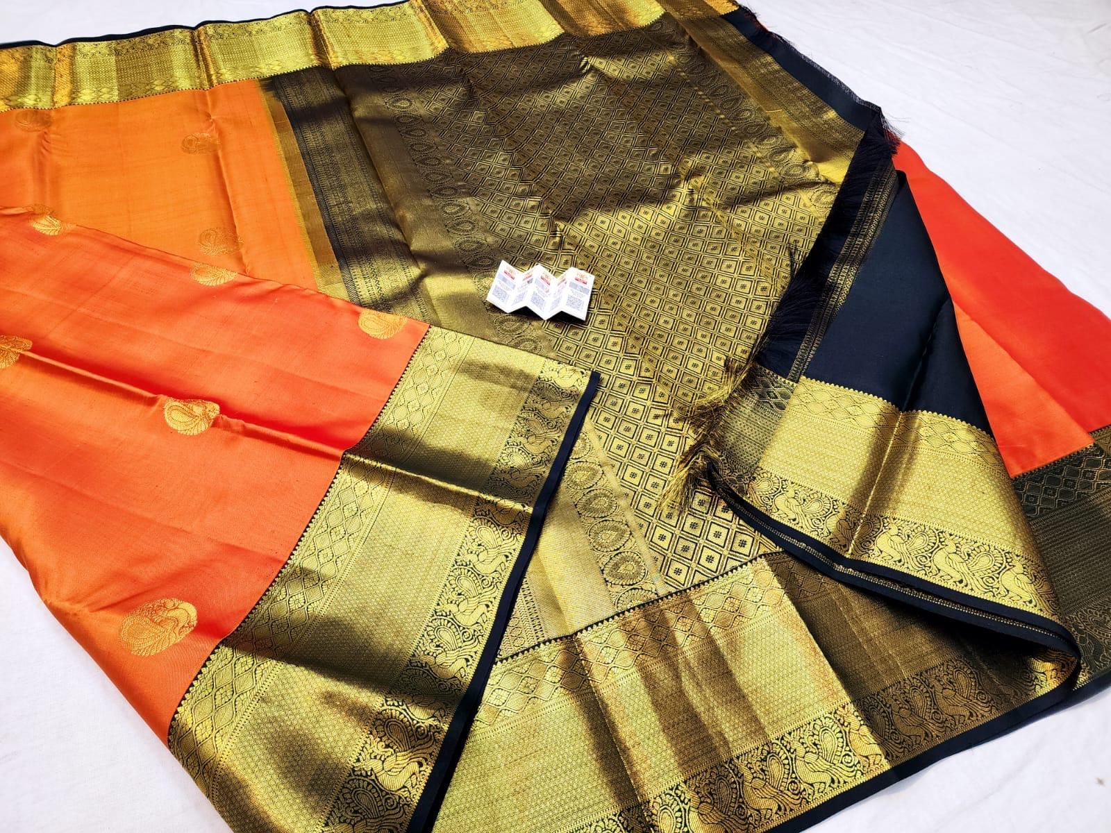 The rich orange body contrasts beautifully with the deep green border, while the delicate 1g gold zari adds a subtle shimmer, enhancing the saree’s festive and regal appeal. Lightweight yet durable, it drapes effortlessly, making it perfect for weddings, cultural celebrations, and traditional functions. A heritage piece designed to be treasured for generations.