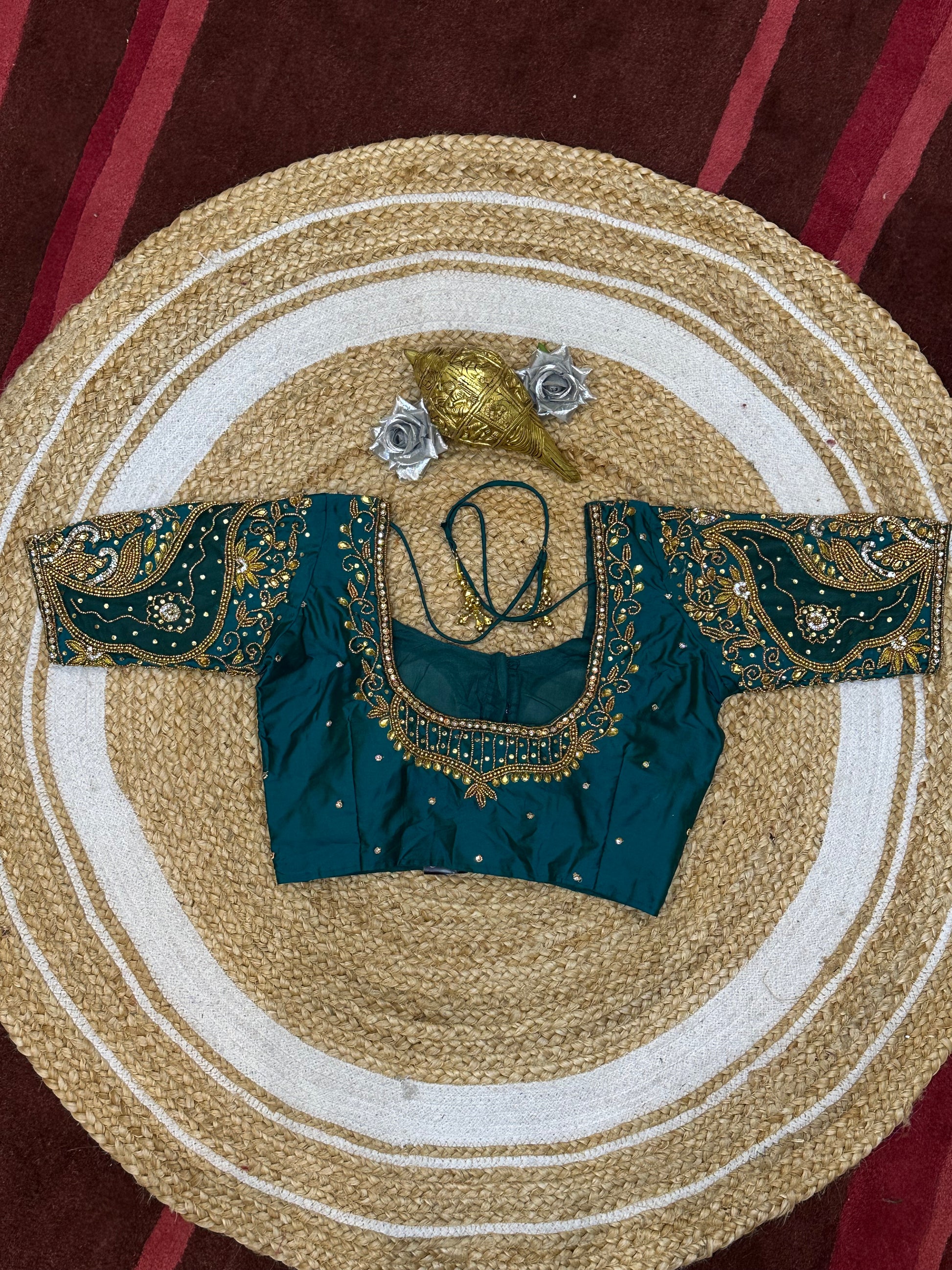 34” XS Aari Worked Sari Blouse Indian Saree Top Silk Turquoise B121