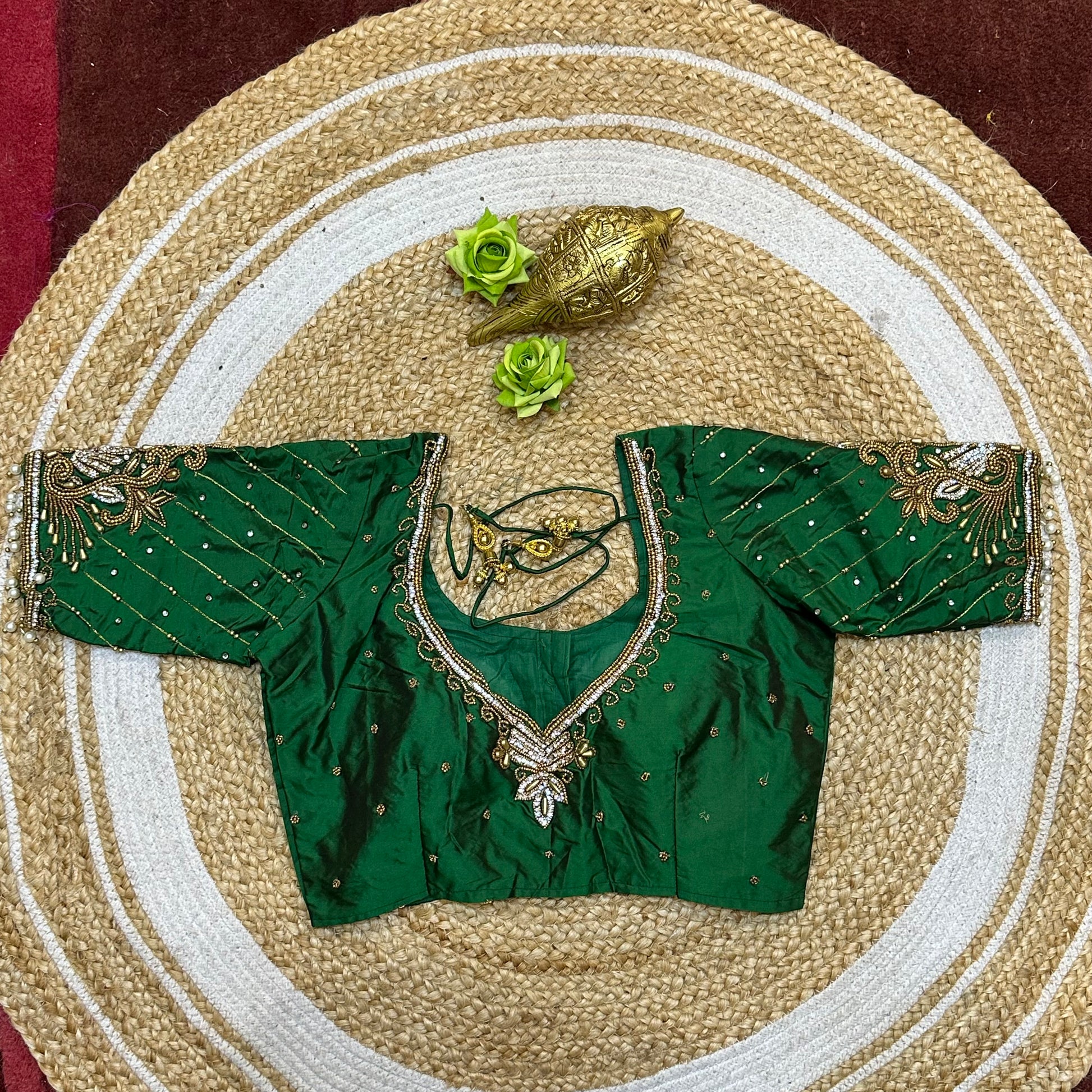 Step into the spotlight with our stunning silk ready-to-wear blouse, a true masterpiece adorned with exquisite hand Aari work featuring Aari/Maggam work on the sleeves and neckline! 💖✨