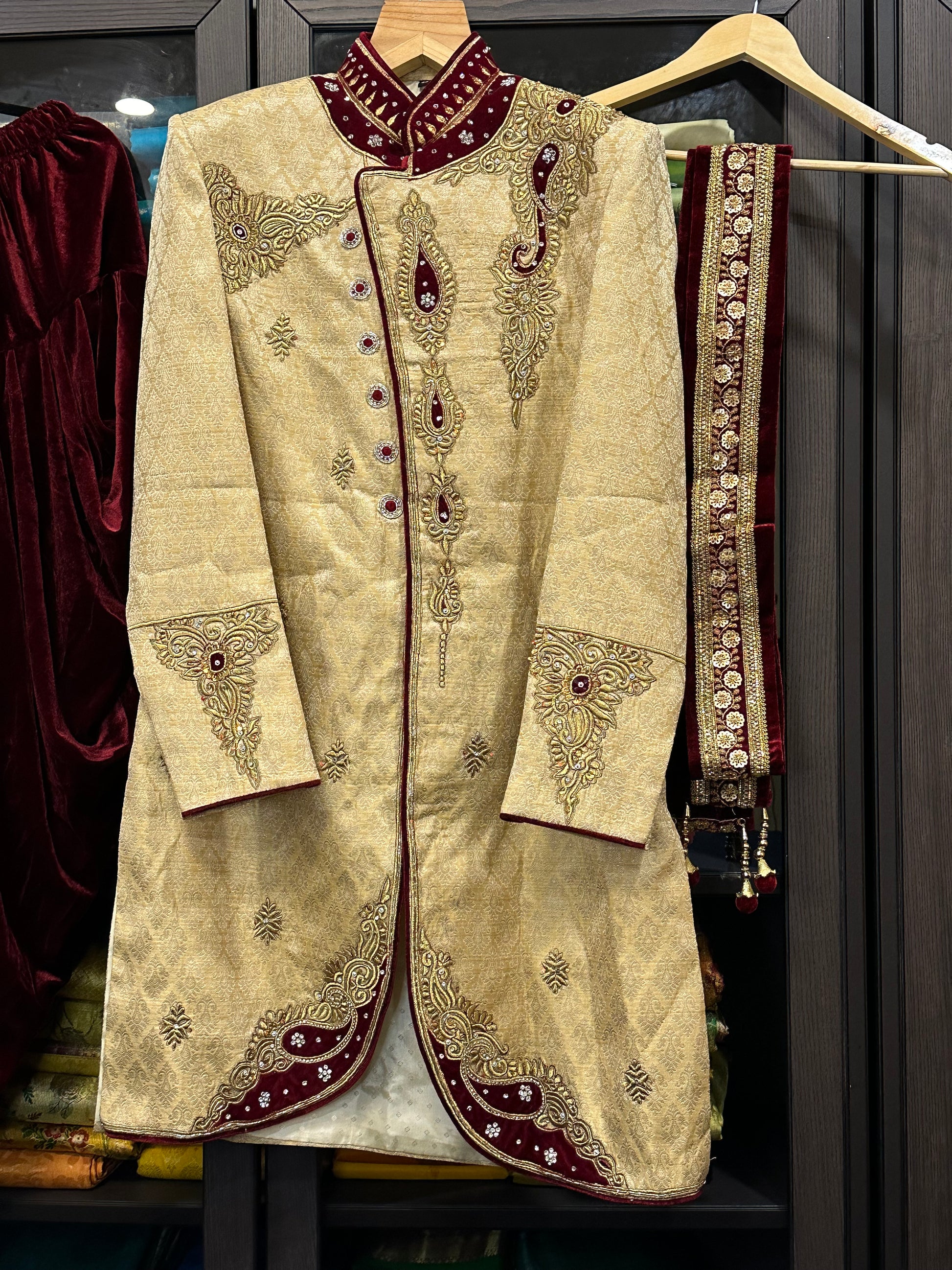 38” Medium size Men’s Kurta Indian Gold & Maroon Sherwani Bollywood outfit M12