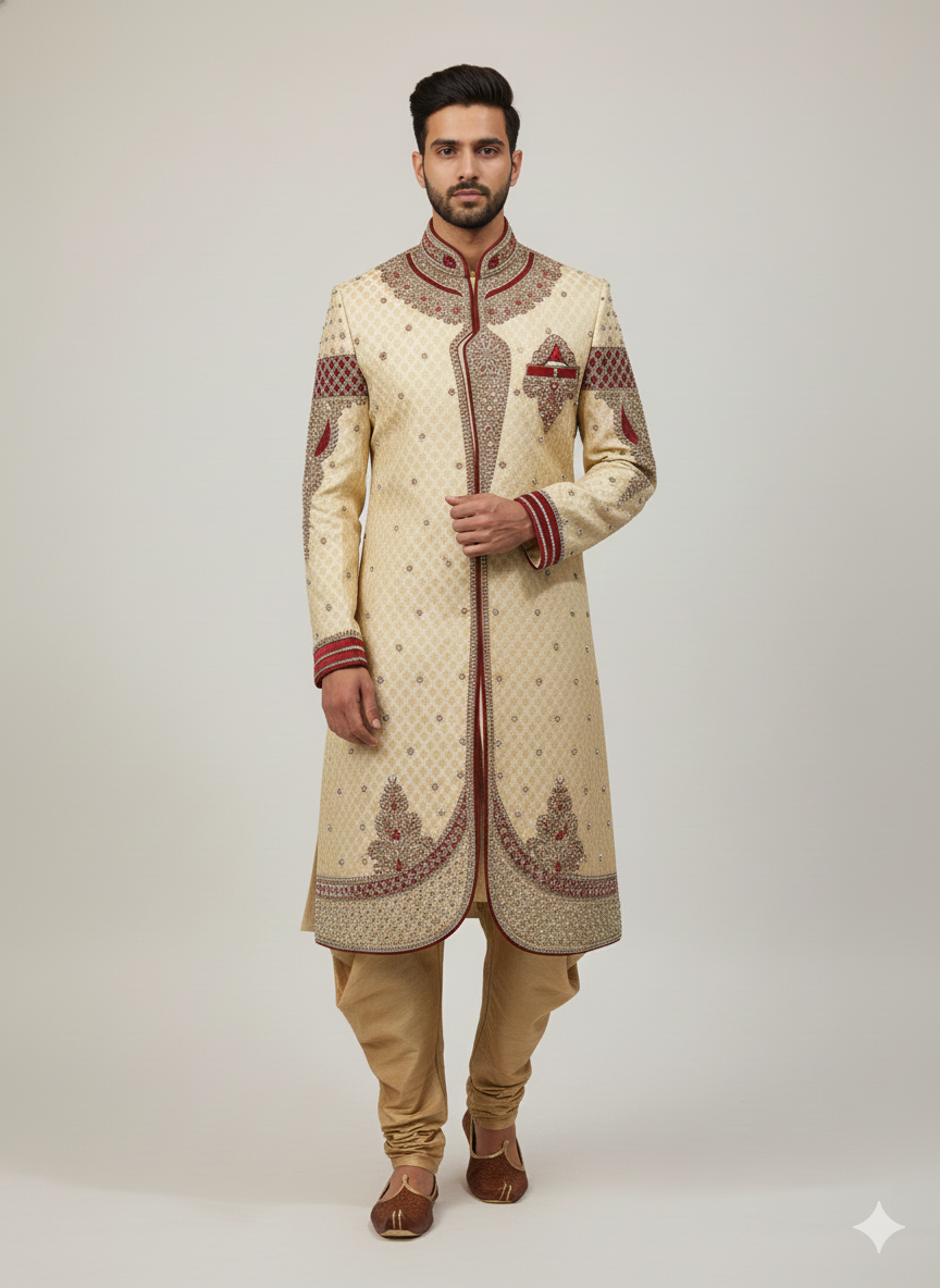38” Medium size Men’s Kurta Indian Ceam & Maroon Sherwani Bollywood outfit M13