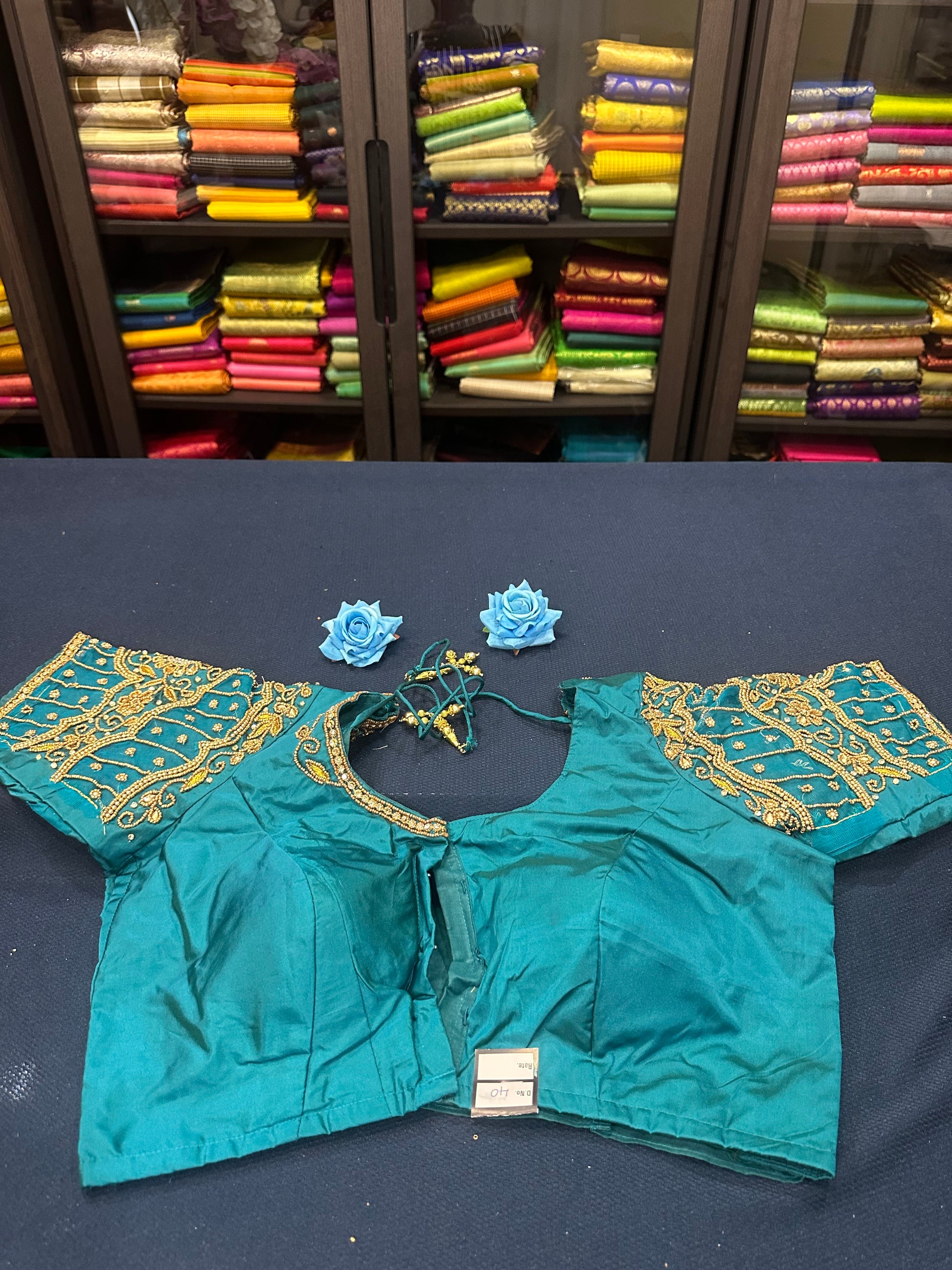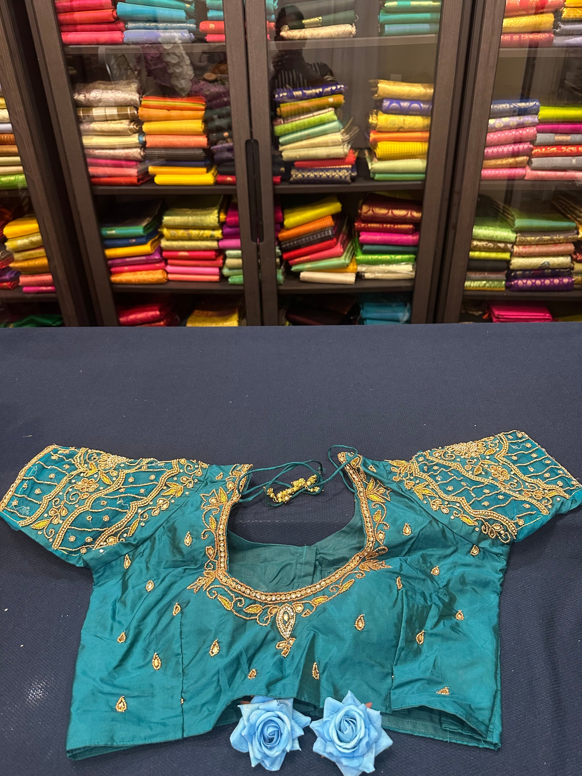 40” Aari hand Worked Sari Blouse Indian Top Choli Silk Teal Green B14