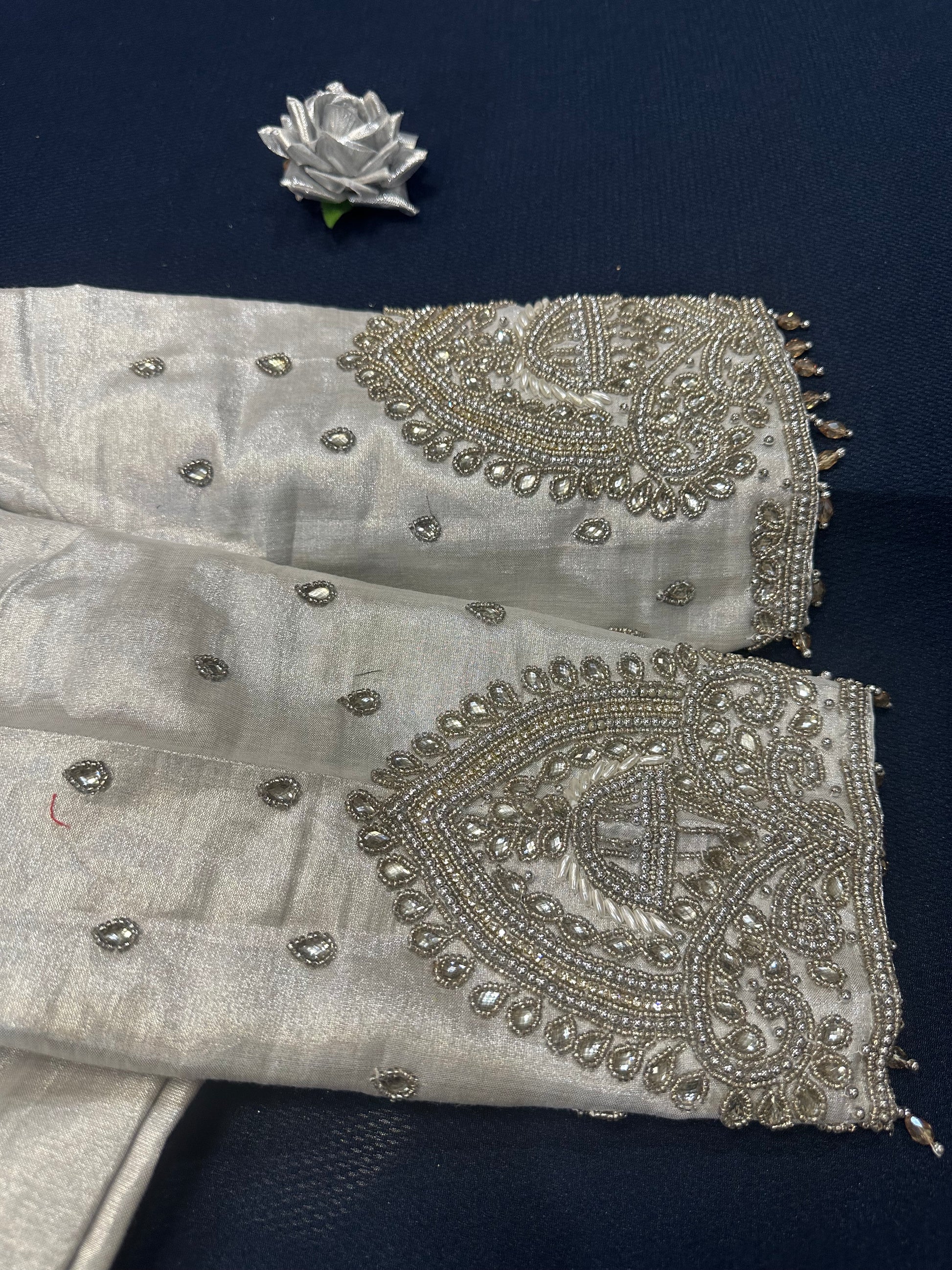 40” Aari hand Worked Sari Blouse Indian Top Choli Silk Silver B23