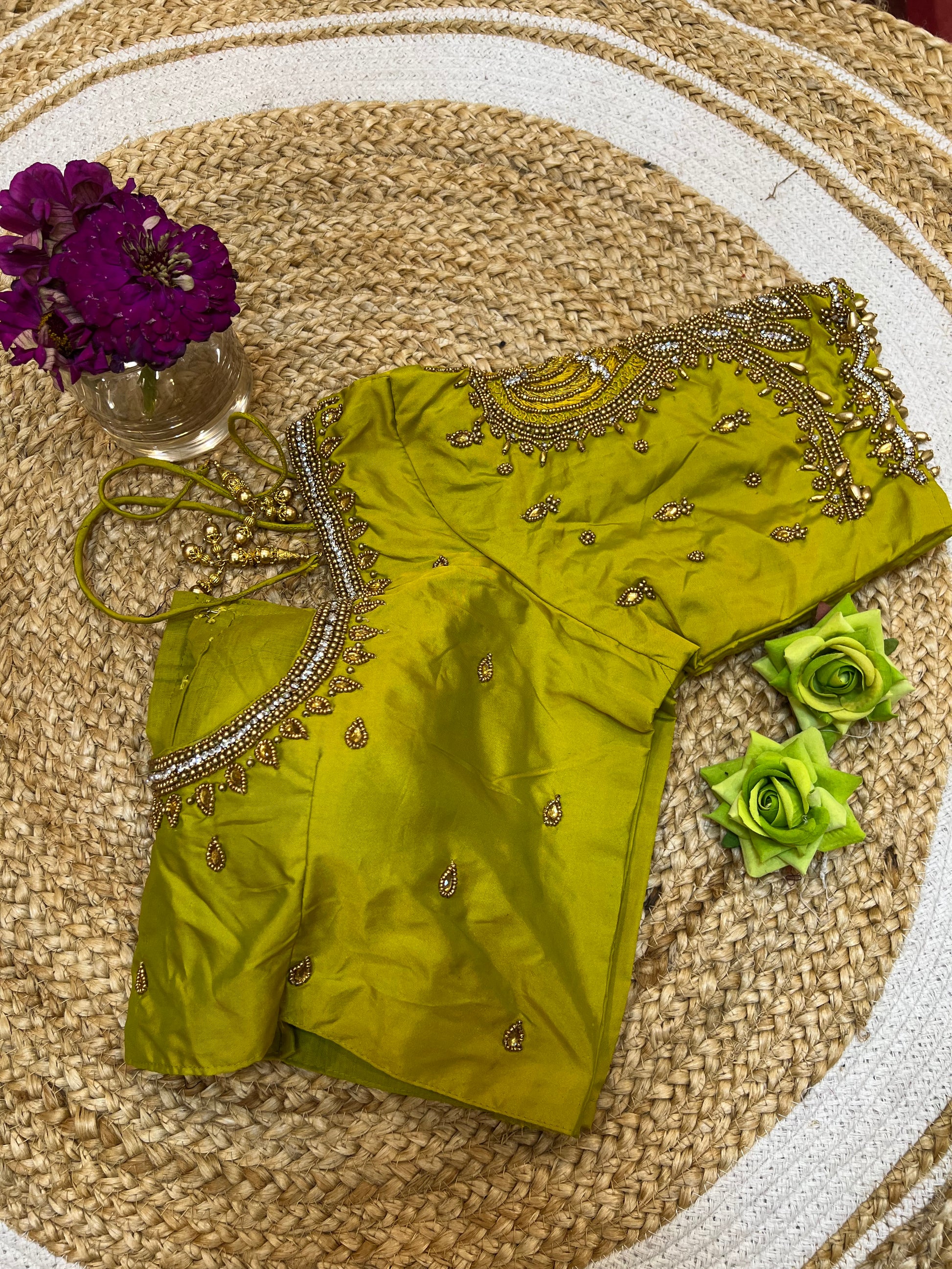 40” Aari hand Worked Sari Blouse Indian Top Choli Silk Lime Green B13