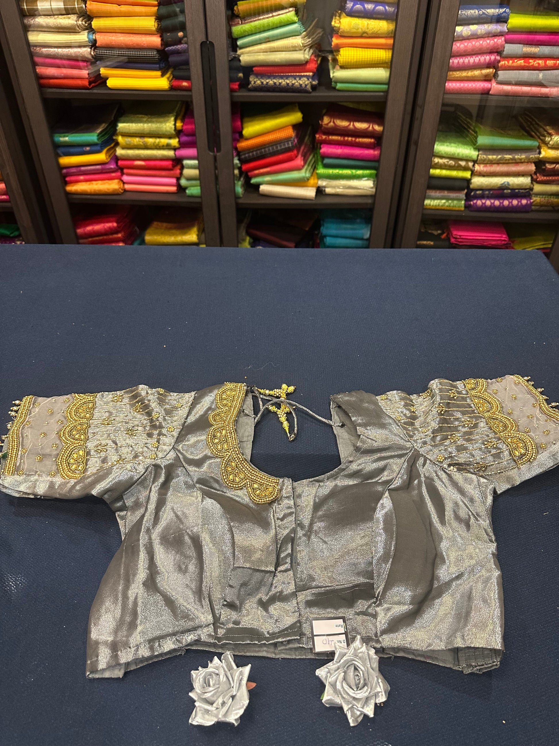 40” Aari hand Worked Sari Blouse Indian Top Choli Silk Metallic Antique Gold B15