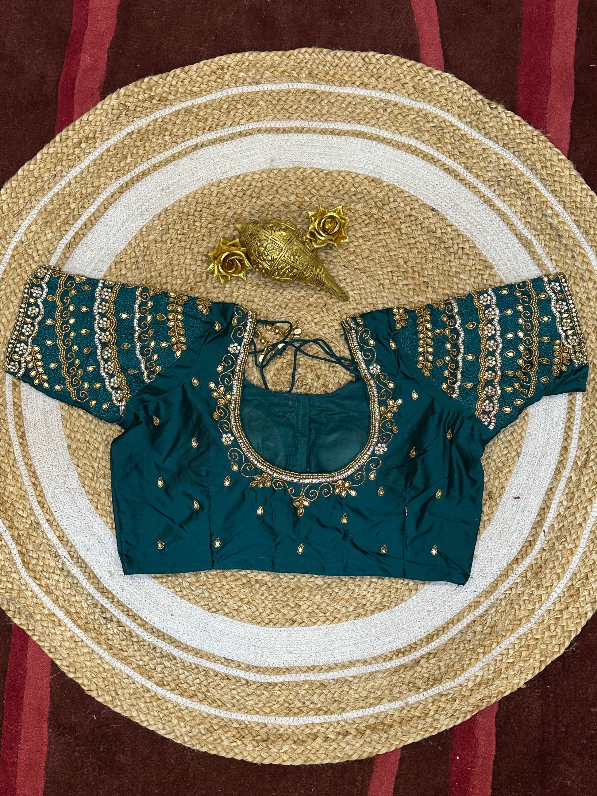 40” Size 10 Aari Worked Sari Blouse Indian Saree Top Silk Teal B69