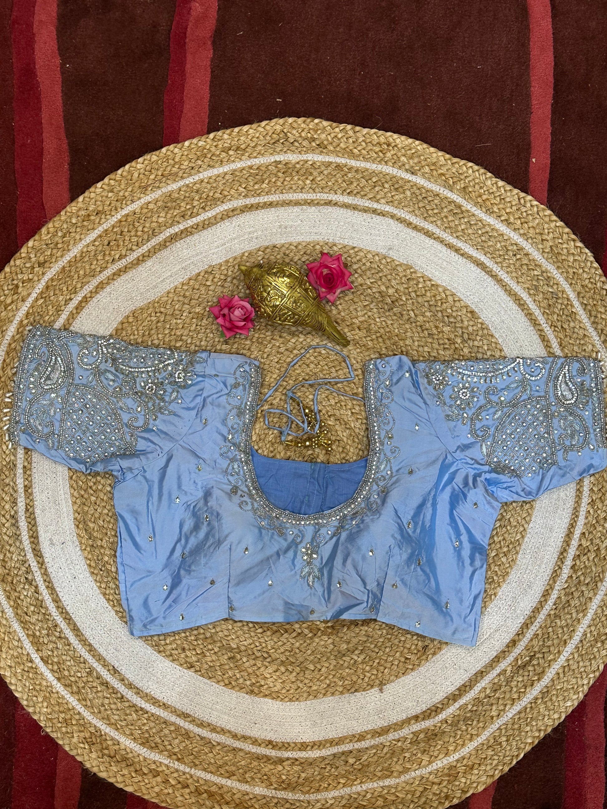 40” Size 10 Aari Worked Sari Blouse Indian Saree Top Silk Light Blue B94