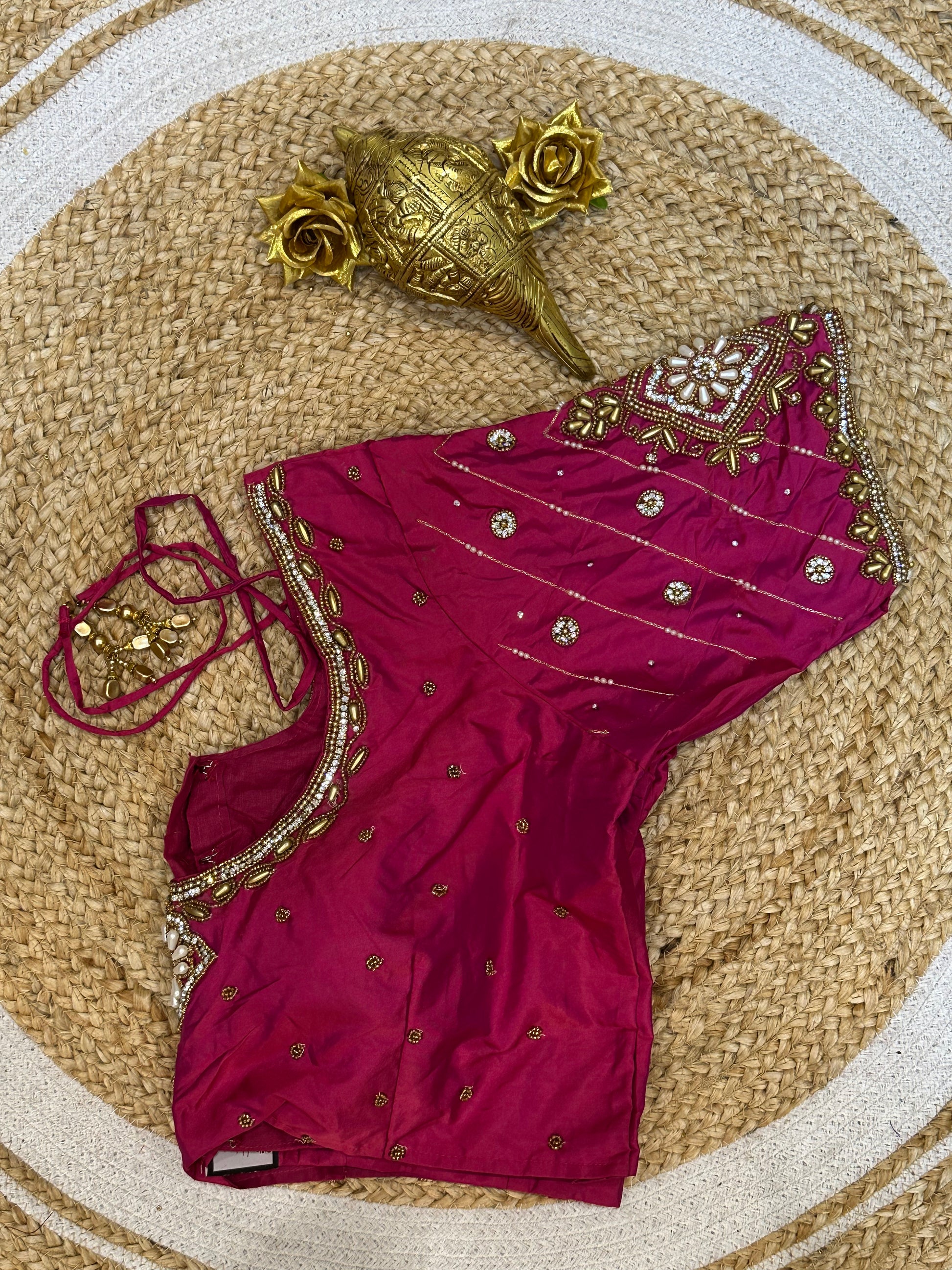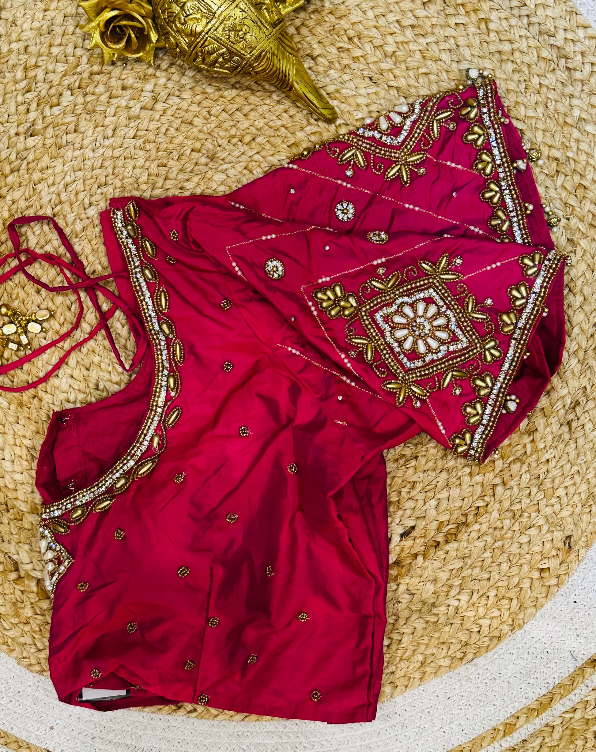 Step into the spotlight with our stunning silk ready-to-wear blouse, a true masterpiece adorned with exquisite hand embroidery featuring Aari/Maggam work on the sleeves and neckline! 💖✨