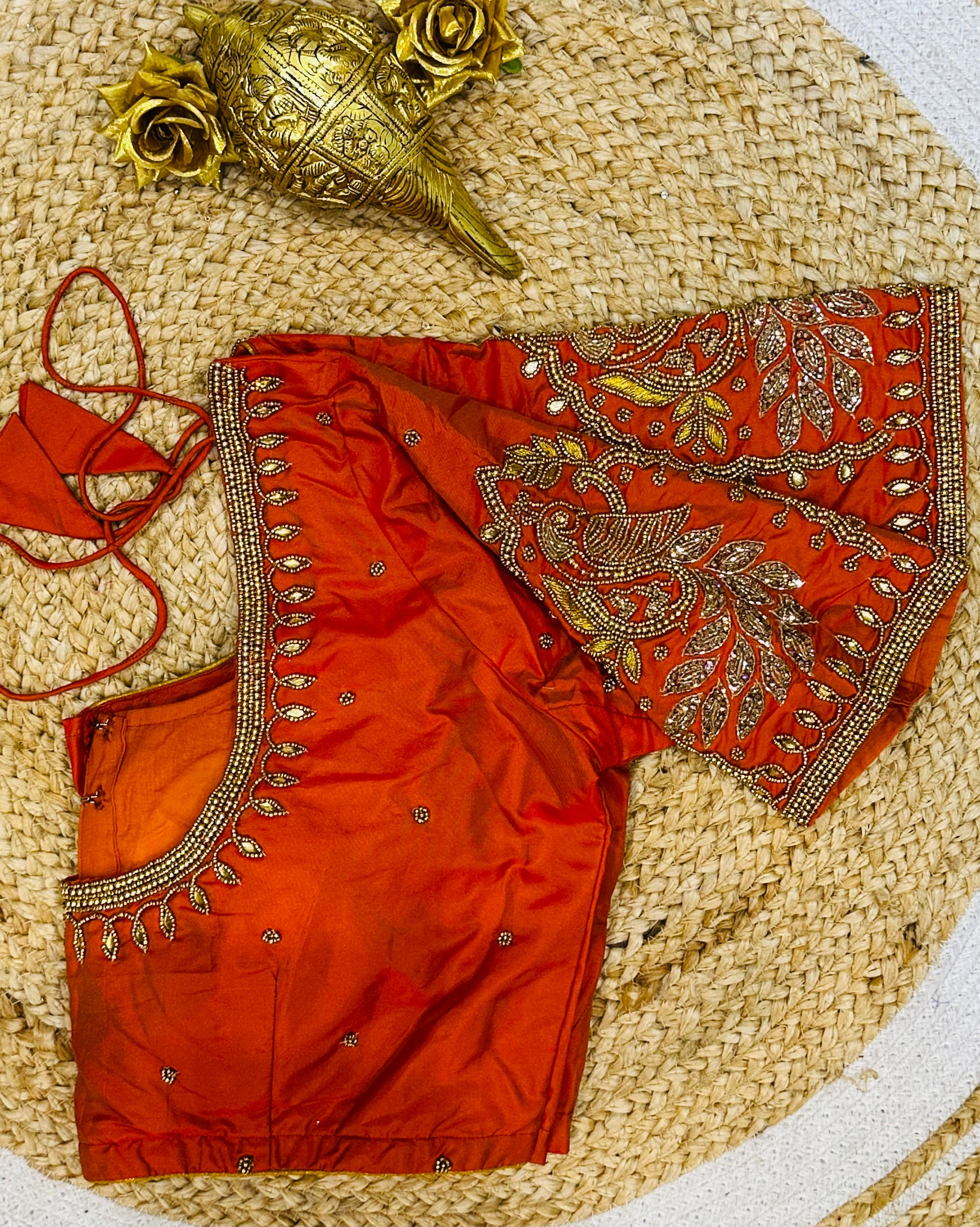 Step into the spotlight with our stunning silk ready-to-wear blouse, a true masterpiece adorned with exquisite hand embroidery featuring Aari/Maggam work on the sleeves and neckline! 💖✨