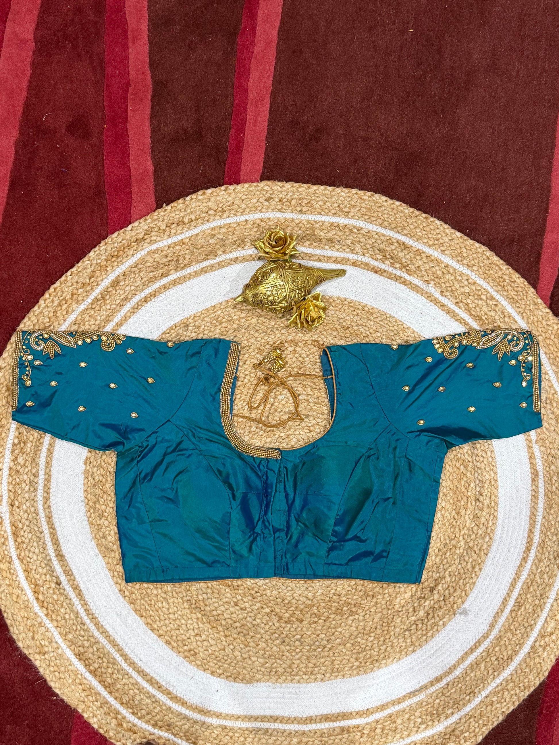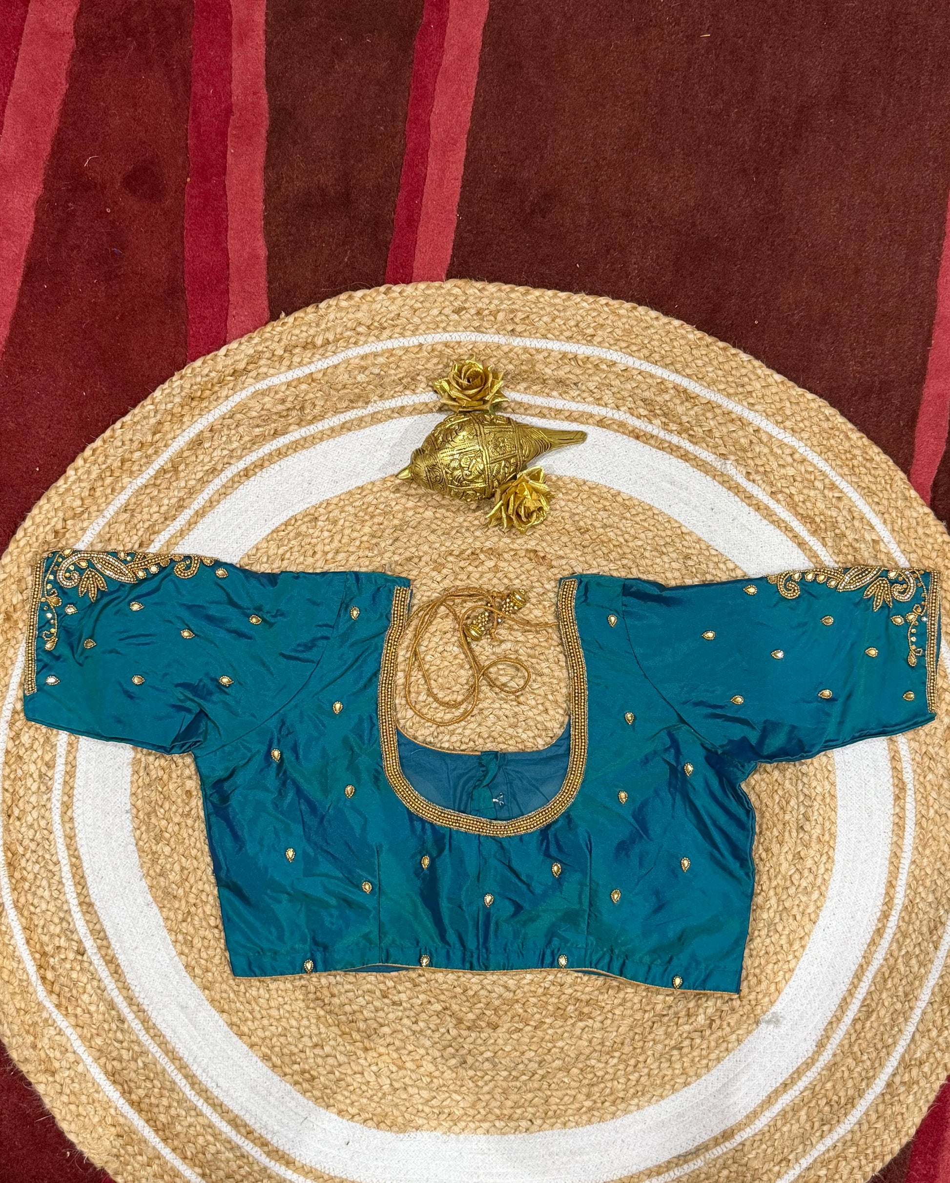 Step into the spotlight with our stunning silk ready-to-wear blouse, a true masterpiece adorned with exquisite hand Aari work featuring Aari/Maggam work on the sleeves and neckline! 💖✨