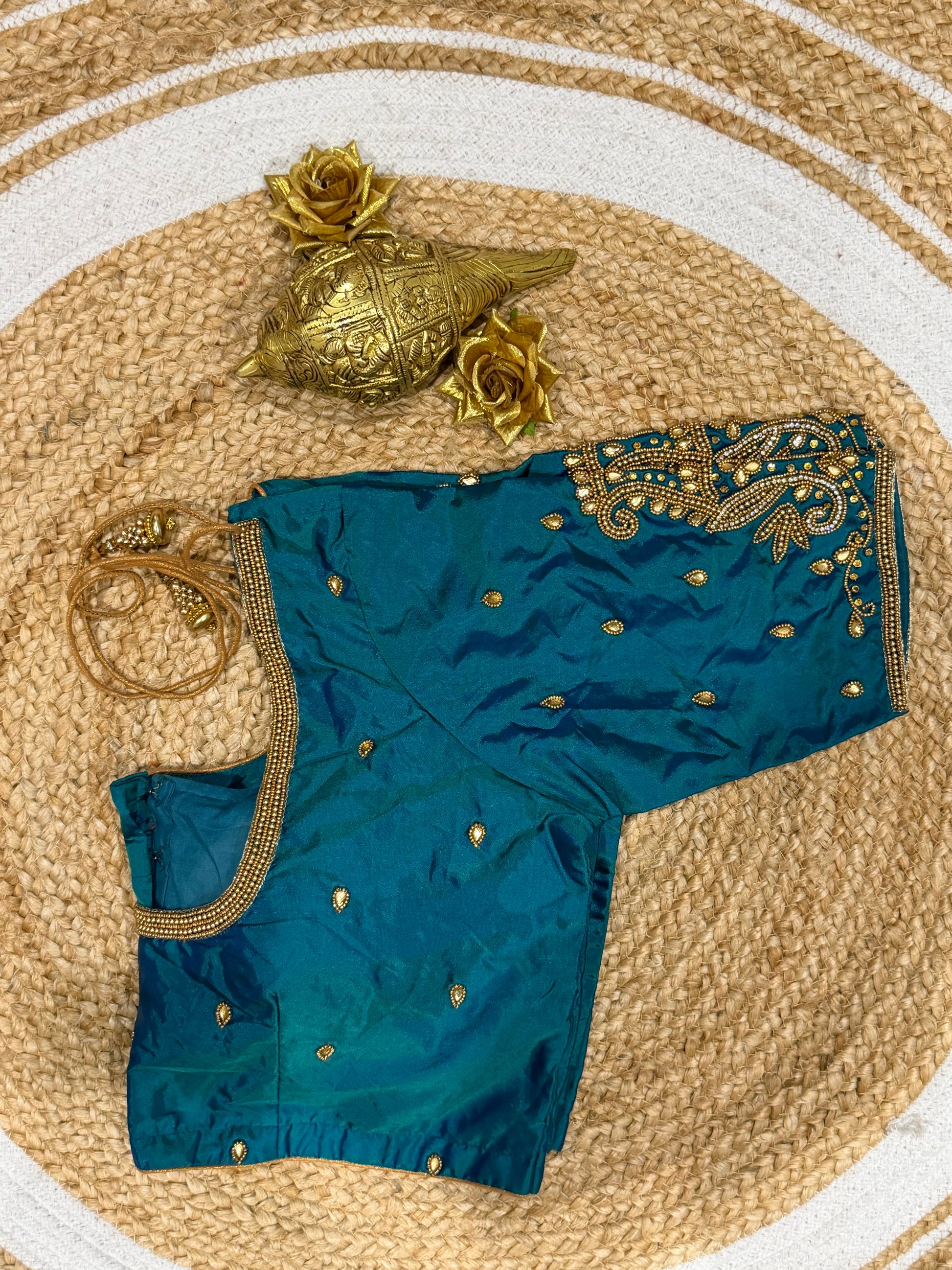 Designed to pair beautifully with your favorite lehenga or sari, this hand-worked delight boasts intricate detailing on one side of the front neck, elegantly draped by your sari on the other. The back neckline and sleeves are elegantly adorned, creating a harmonious look for any occasion! 🎉