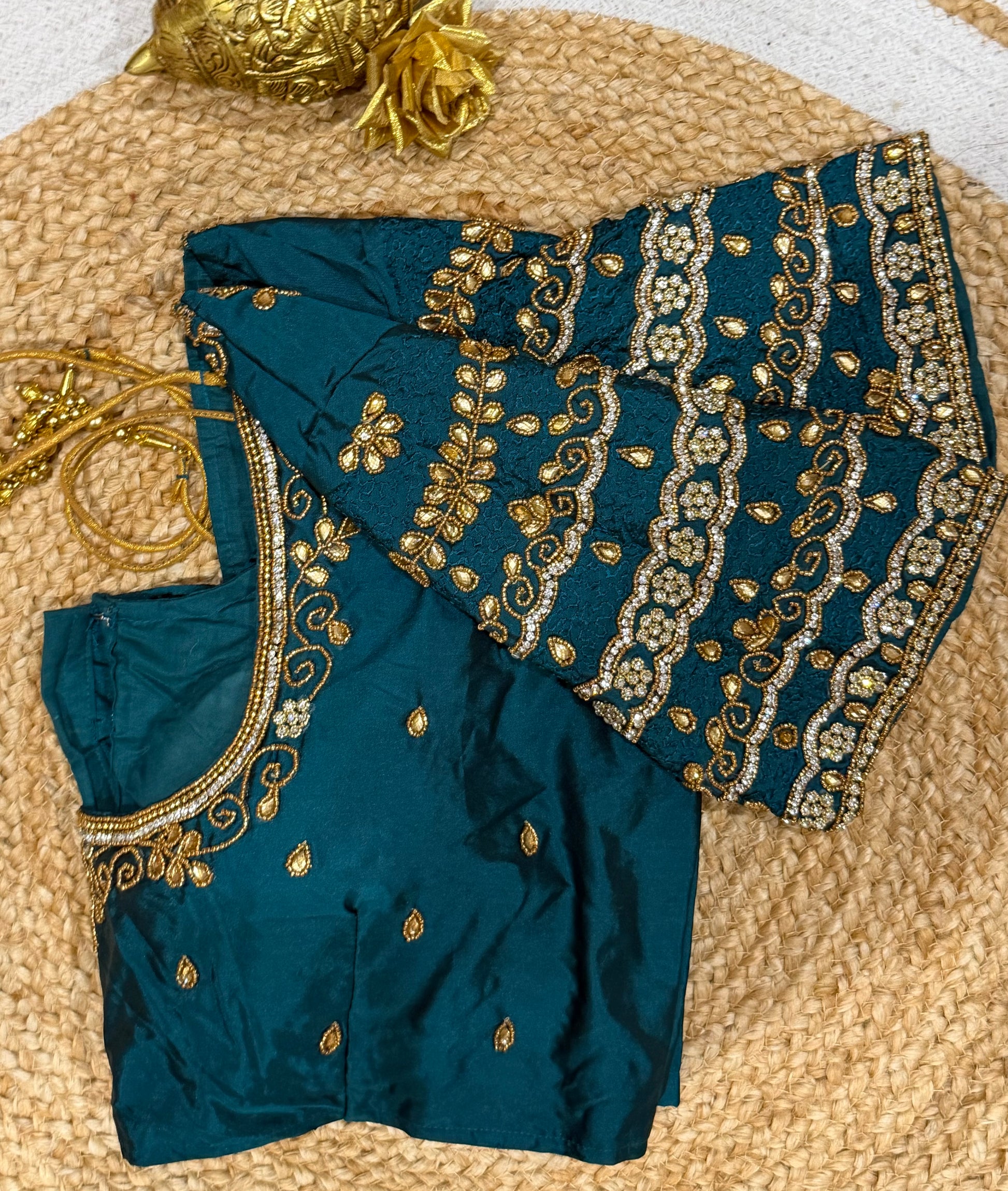 Designed to pair beautifully with your favorite lehenga or sari, this hand-worked delight boasts intricate detailing on one side of the front neck, elegantly draped by your sari on the other. The back neckline and sleeves are elegantly adorned, creating a harmonious look for any occasion! 🎉