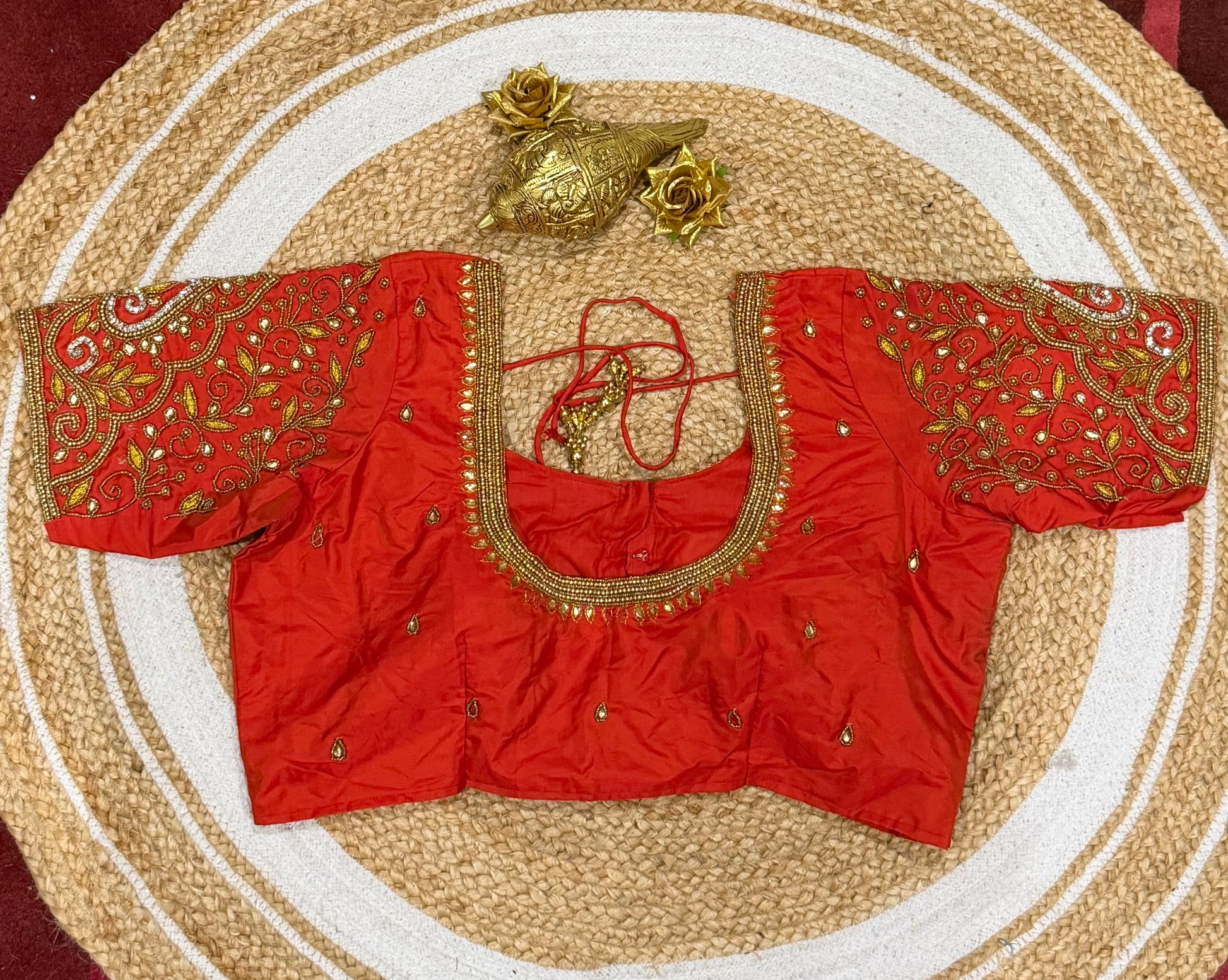 Step into the spotlight with our stunning silk ready-to-wear blouse, a true masterpiece adorned with exquisite hand Aari work featuring Aari/Maggam work on the sleeves and neckline! 💖✨