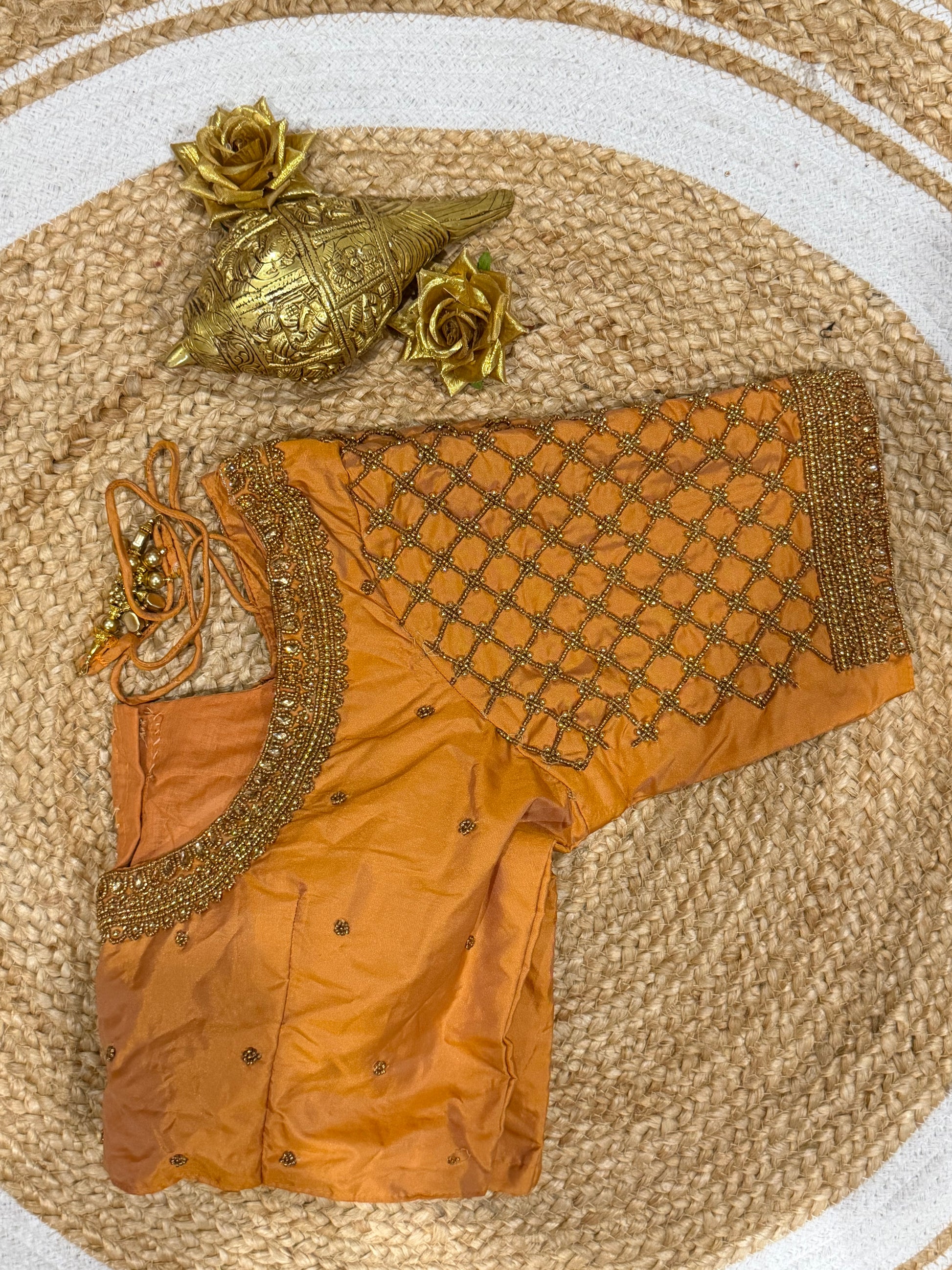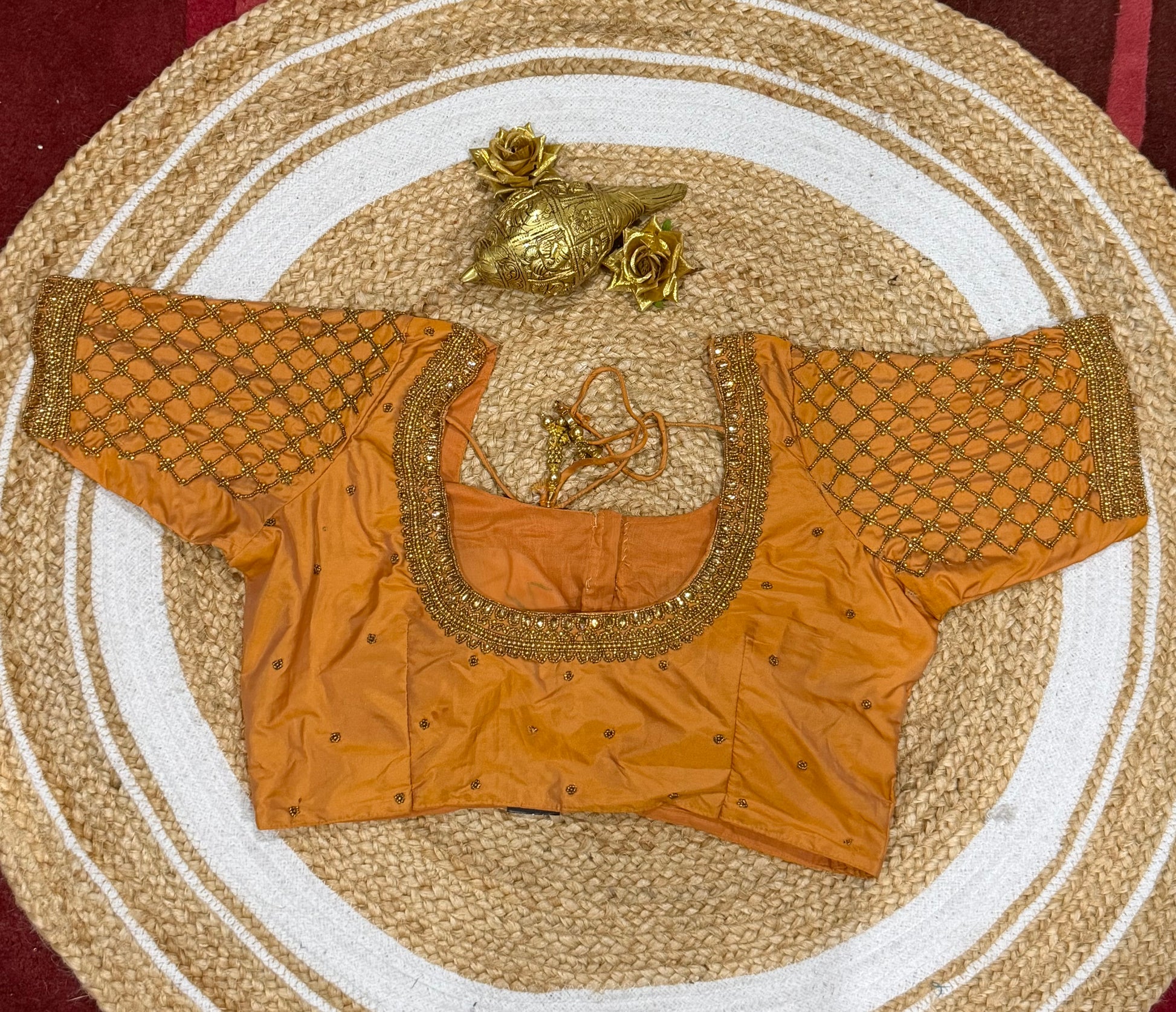 Step into the spotlight with our stunning silk ready-to-wear blouse, a true masterpiece adorned with exquisite hand Aari work featuring Aari/Maggam work on the sleeves and neckline! 💖✨