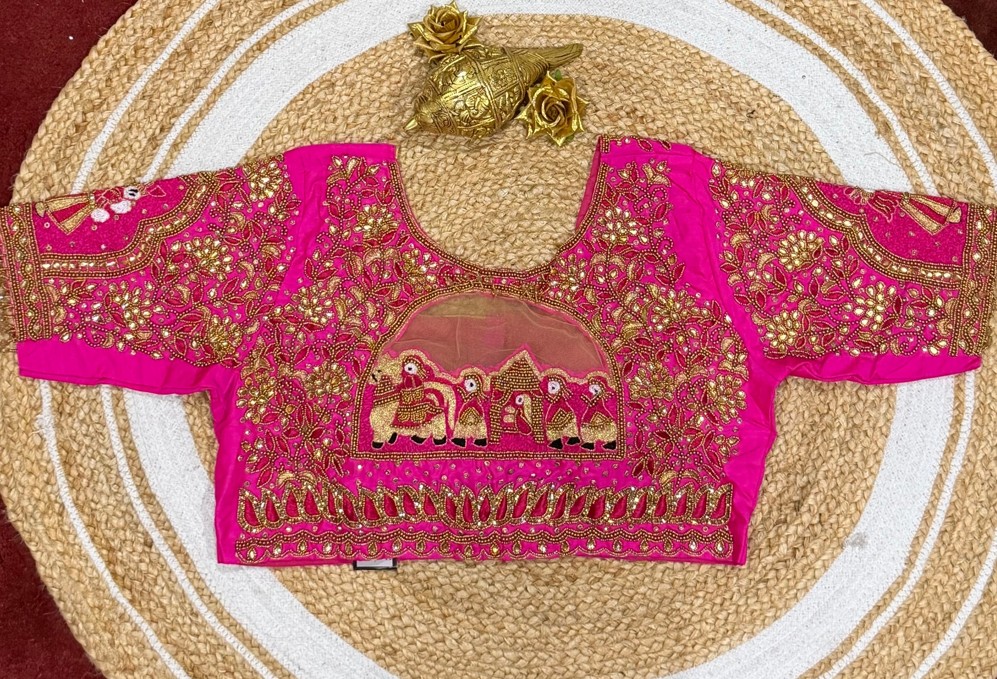 Designed to pair beautifully with your favorite lehenga or sari, this hand-worked delight boasts intricate detailing on one side of the front neck, elegantly draped by your sari on the other. The back neckline and sleeves are elegantly adorned, creating a harmonious look for any occasion! 🎉