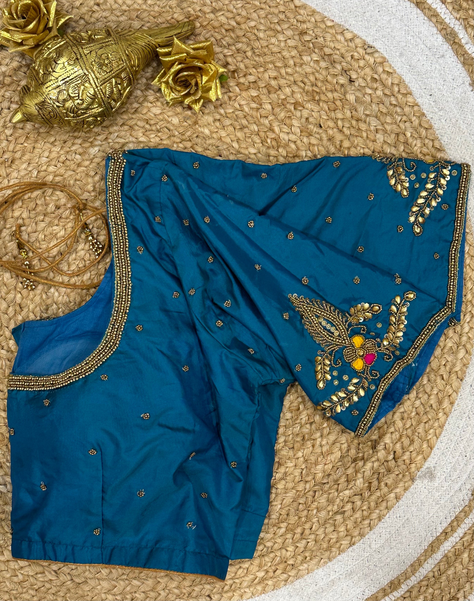 Step into the spotlight with our stunning silk ready-to-wear blouse, a true masterpiece adorned with exquisite hand Aari work featuring Aari/Maggam work on the sleeves and neckline! 💖✨
