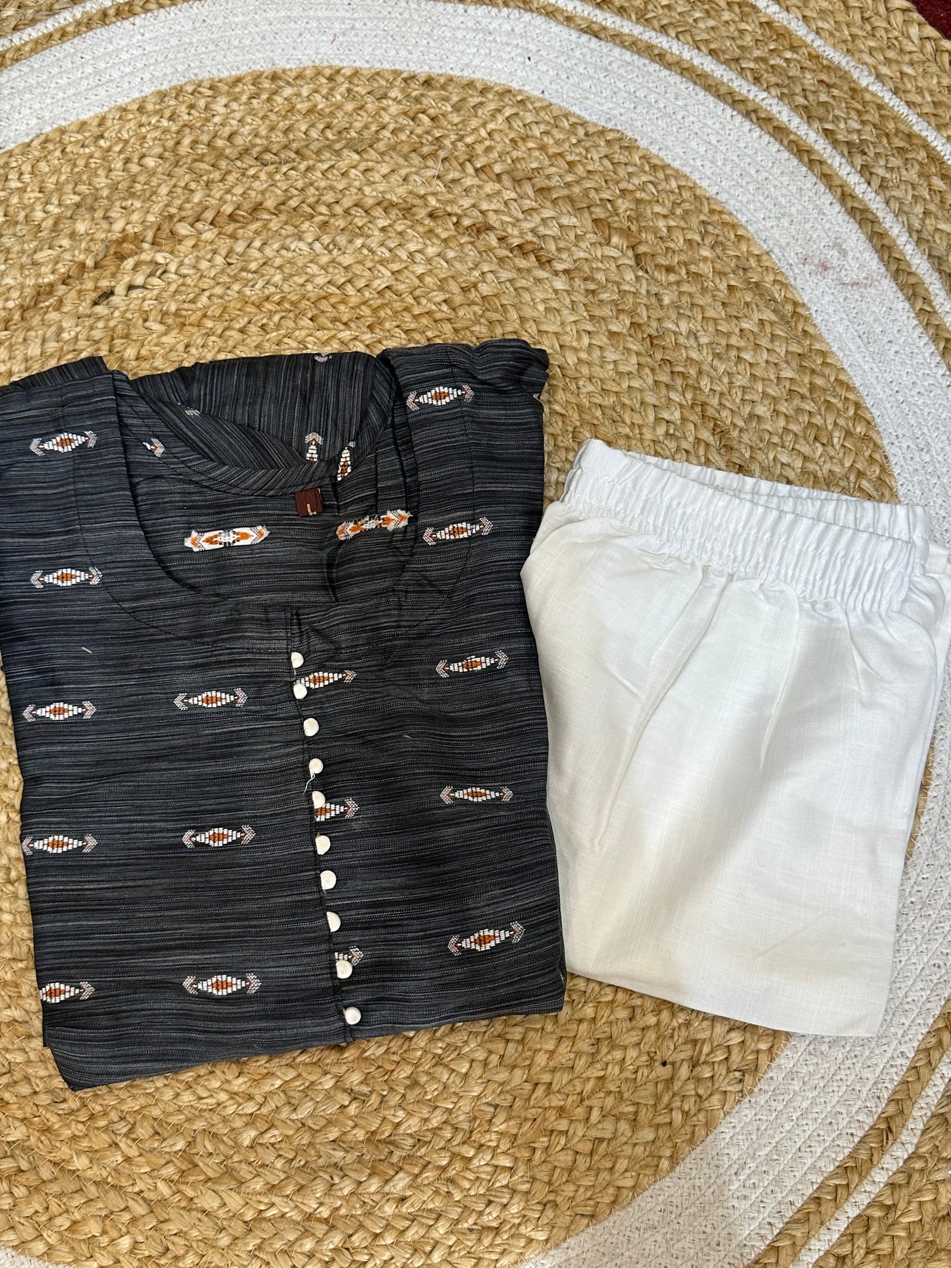 • Style: Anarkali-style or gathered long Kurti with side slits, featuring 3/4 sleeves and a round neckline with button detailing.