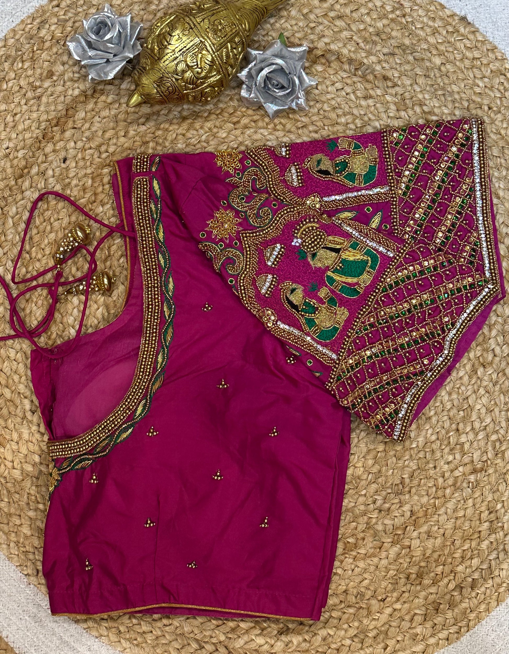 Step into the spotlight with our stunning silk ready-to-wear blouse, a true masterpiece adorned with exquisite hand Aari work featuring Aari/Maggam work on the sleeves and neckline! 💖✨