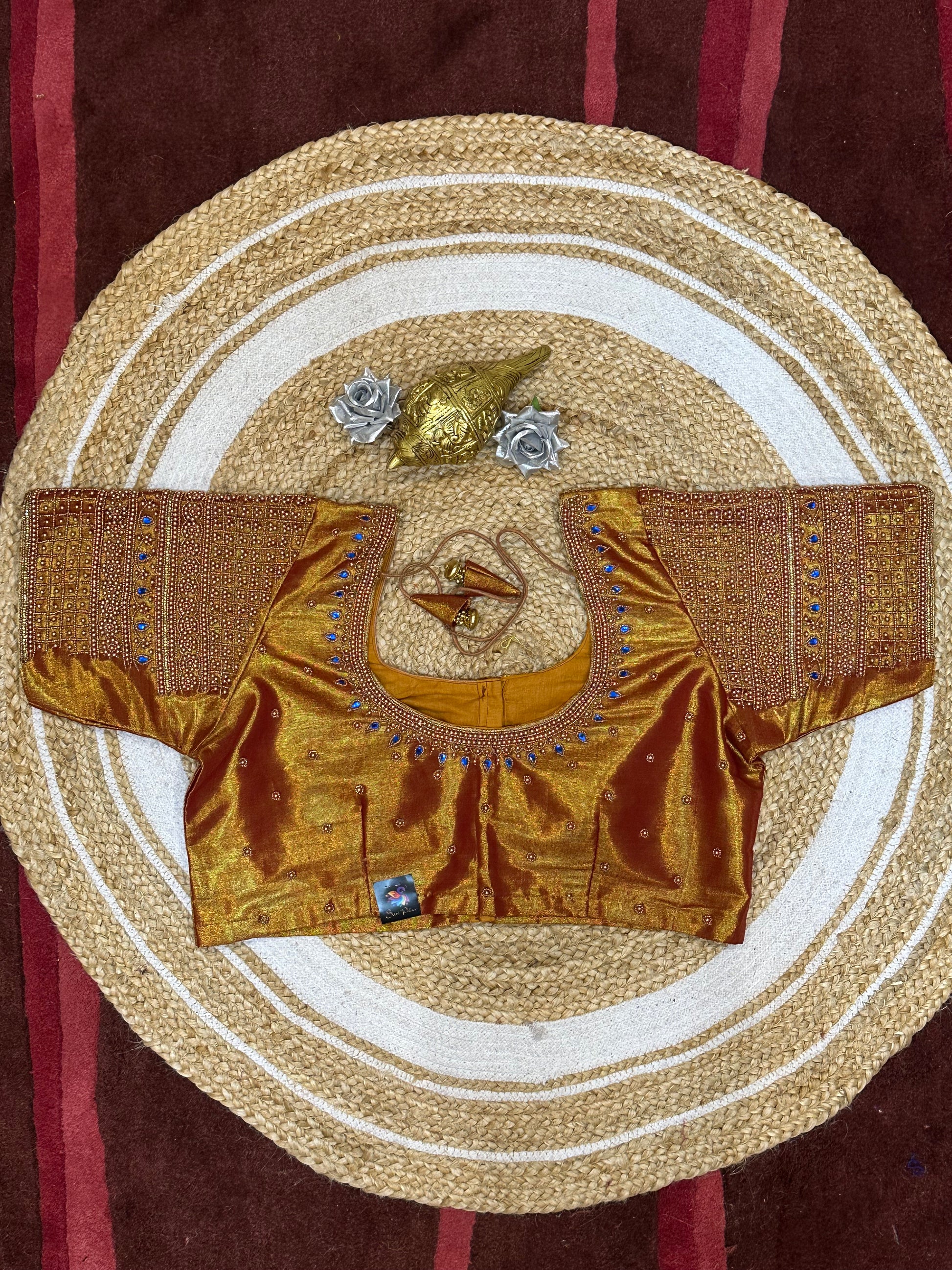 lStep into the spotlight with our stunning silk ready-to-wear blouse, a true masterpiece adorned with exquisite hand Aari work featuring Aari/Maggam work on the sleeves and neckline! 💖✨