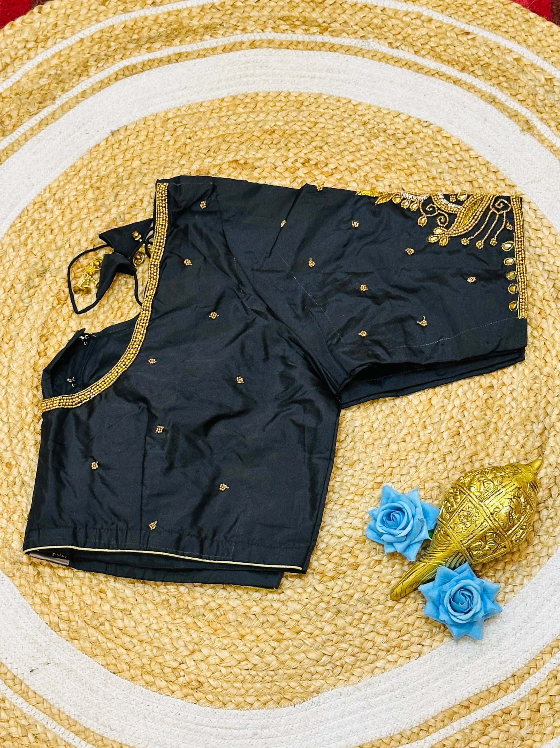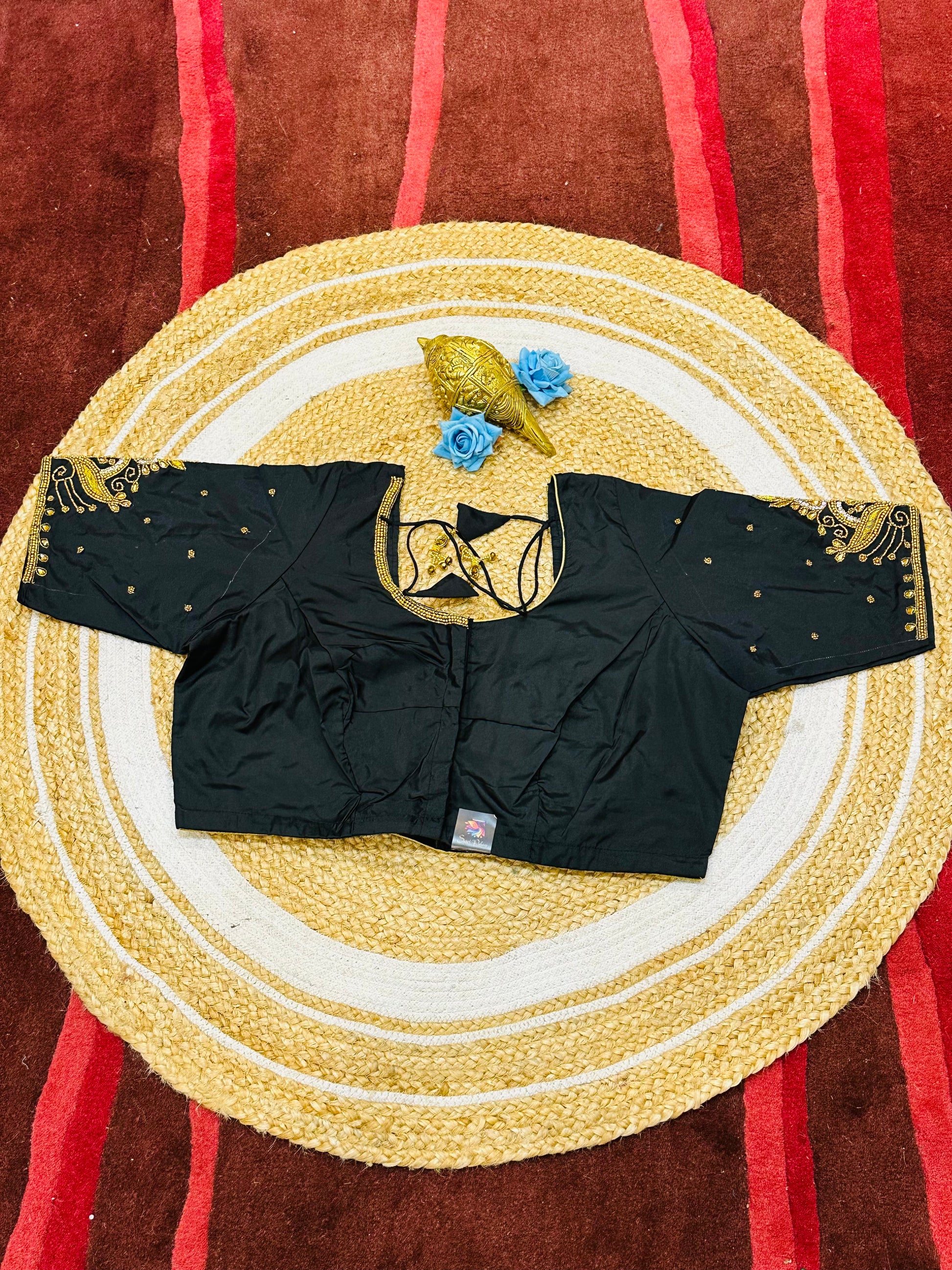 Step into the spotlight with our stunning silk ready-to-wear blouse, a true masterpiece adorned with exquisite hand Aari work featuring Aari/Maggam work on the sleeves and neckline! 💖✨