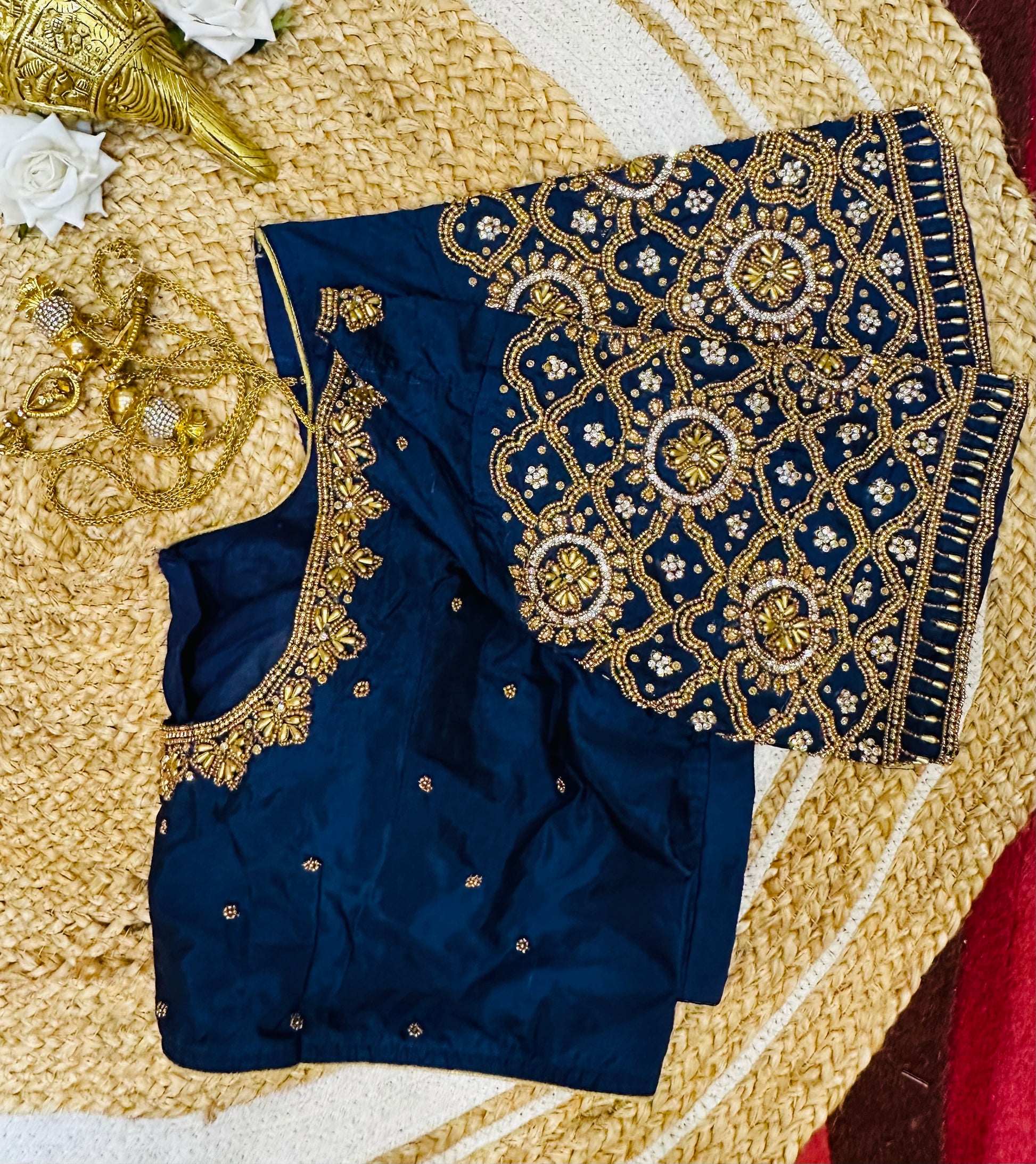 Designed to pair beautifully with your favorite lehenga or sari, this hand-worked delight boasts intricate detailing on one side of the front neck, elegantly draped by your sari on the other. The back neckline and sleeves are elegantly adorned, creating a harmonious look for any occasion! 🎉