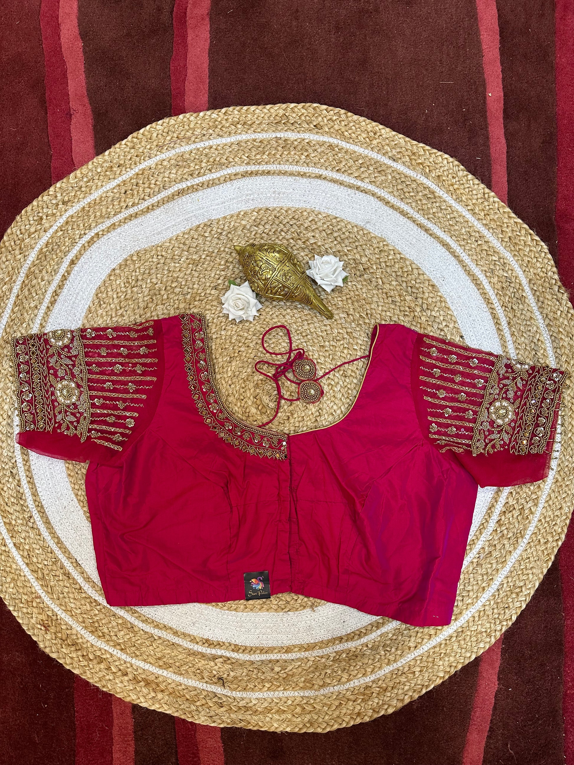 Step into the spotlight with our stunning silk ready-to-wear blouse, a true masterpiece adorned with exquisite hand embroidery featuring Aari/Maggam work on the sleeves and neckline! 💖✨ The sleeves on this blouse is made in net material.