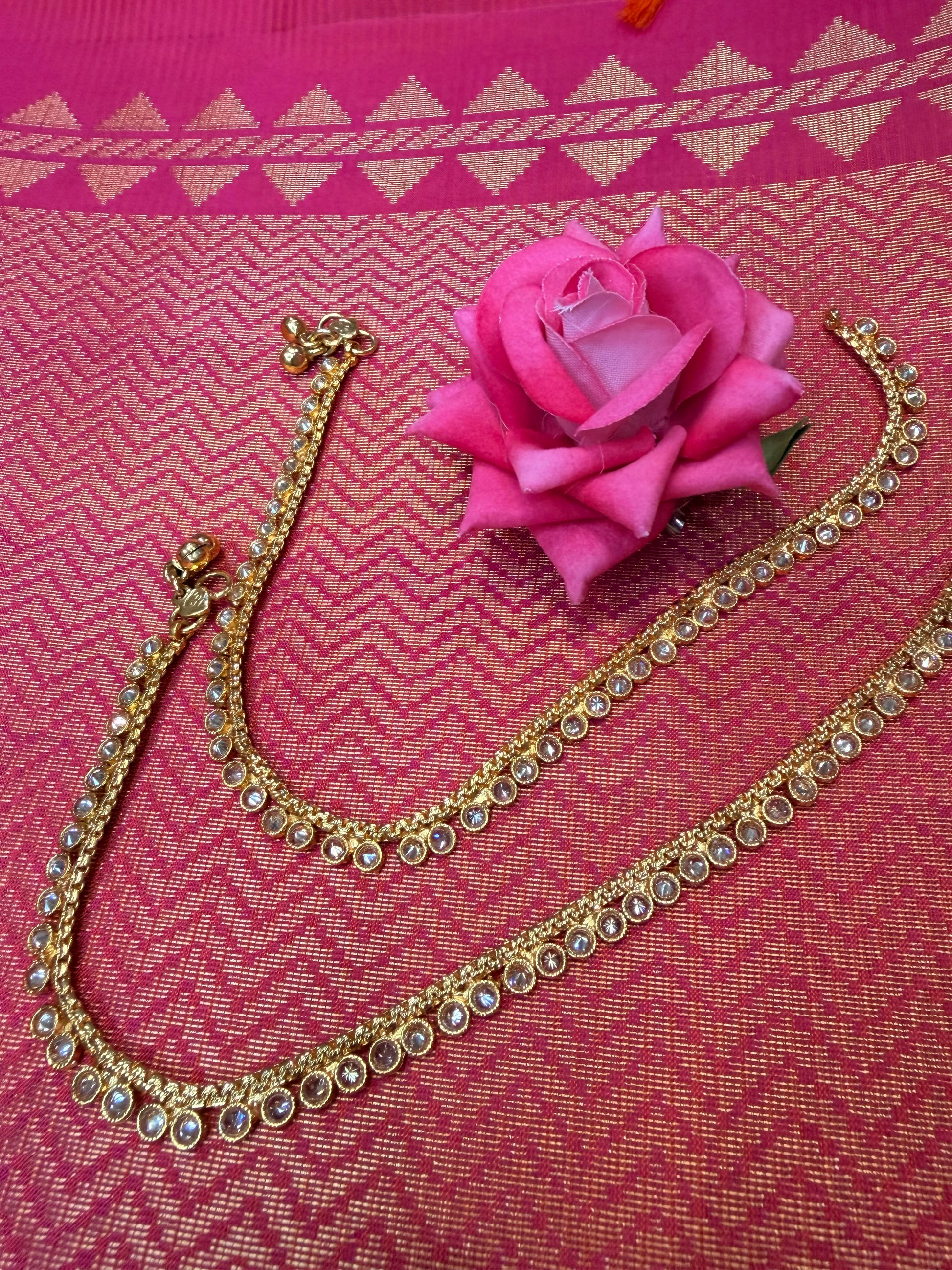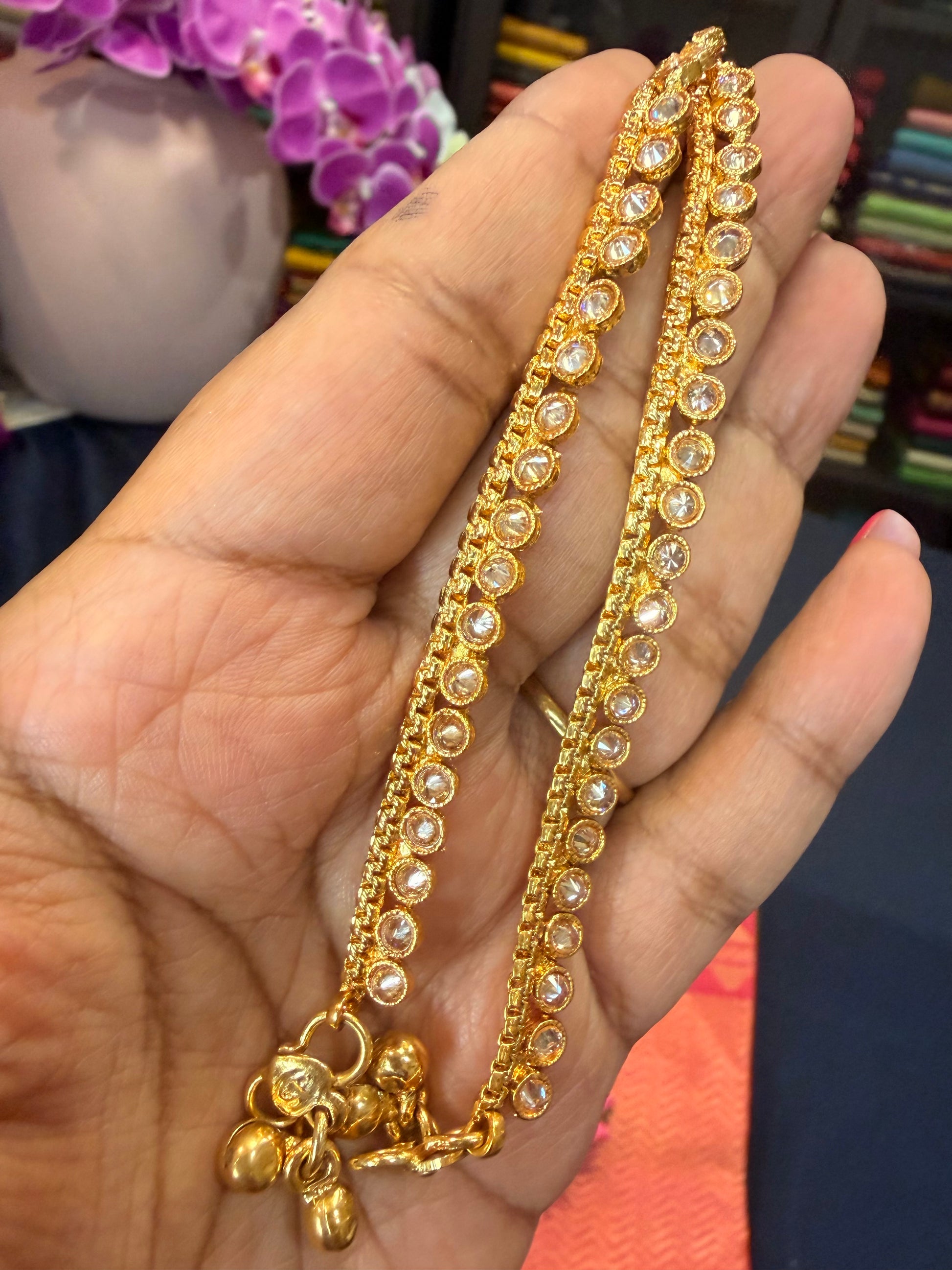 These are a pair of modern and stylish style gold-toned, brass anklets, also known as payal or golusu, featuring intricate stonework and dangling embellishments.