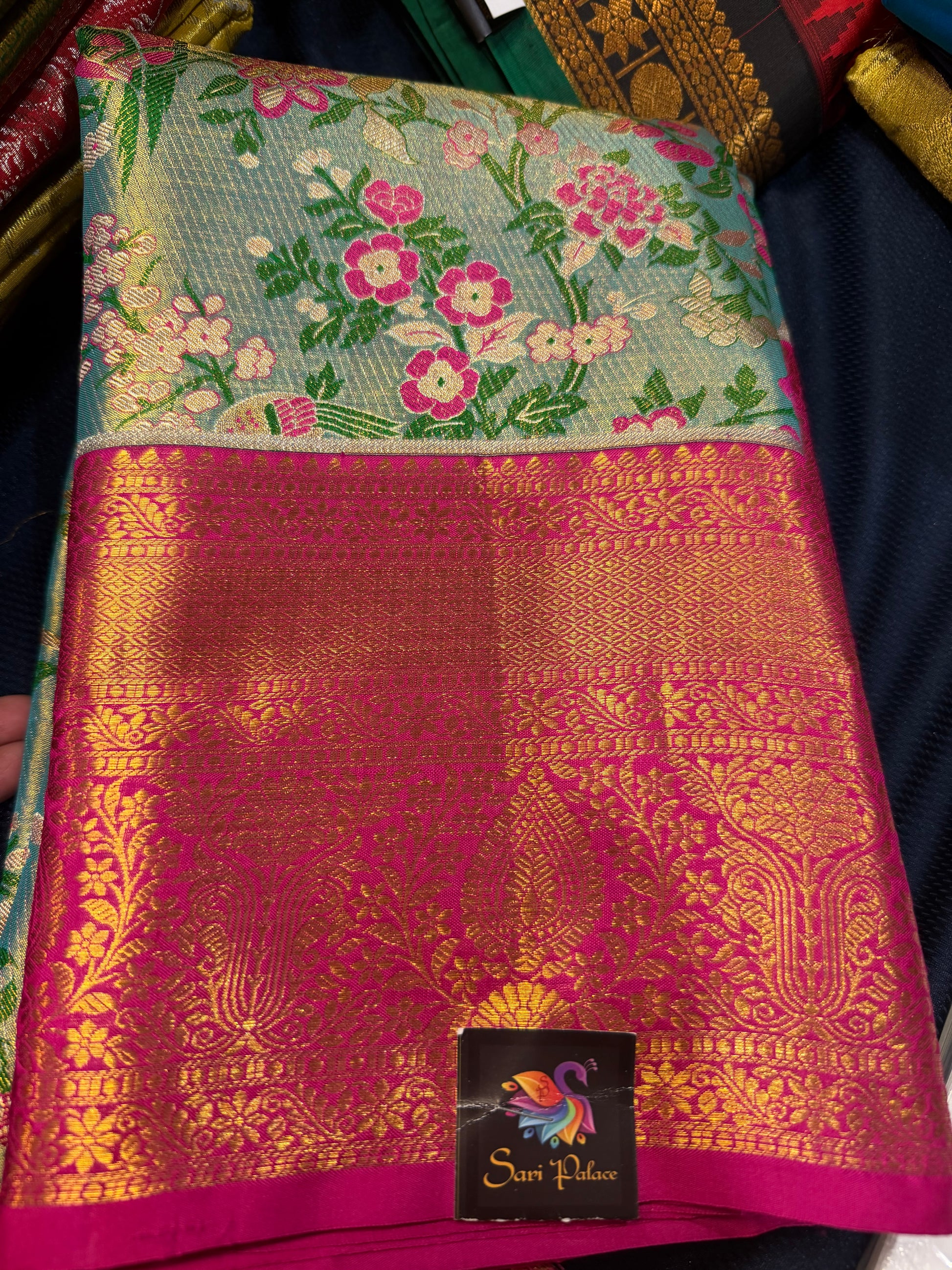 Prepare to turn heads with this exquisite sari in a breathtaking colour of Golden Tissue with Green and Pink designs woven with Pink & Gold Zari border . Perfect for any occasion, this piece radiates elegance and sophistication! 😍💖