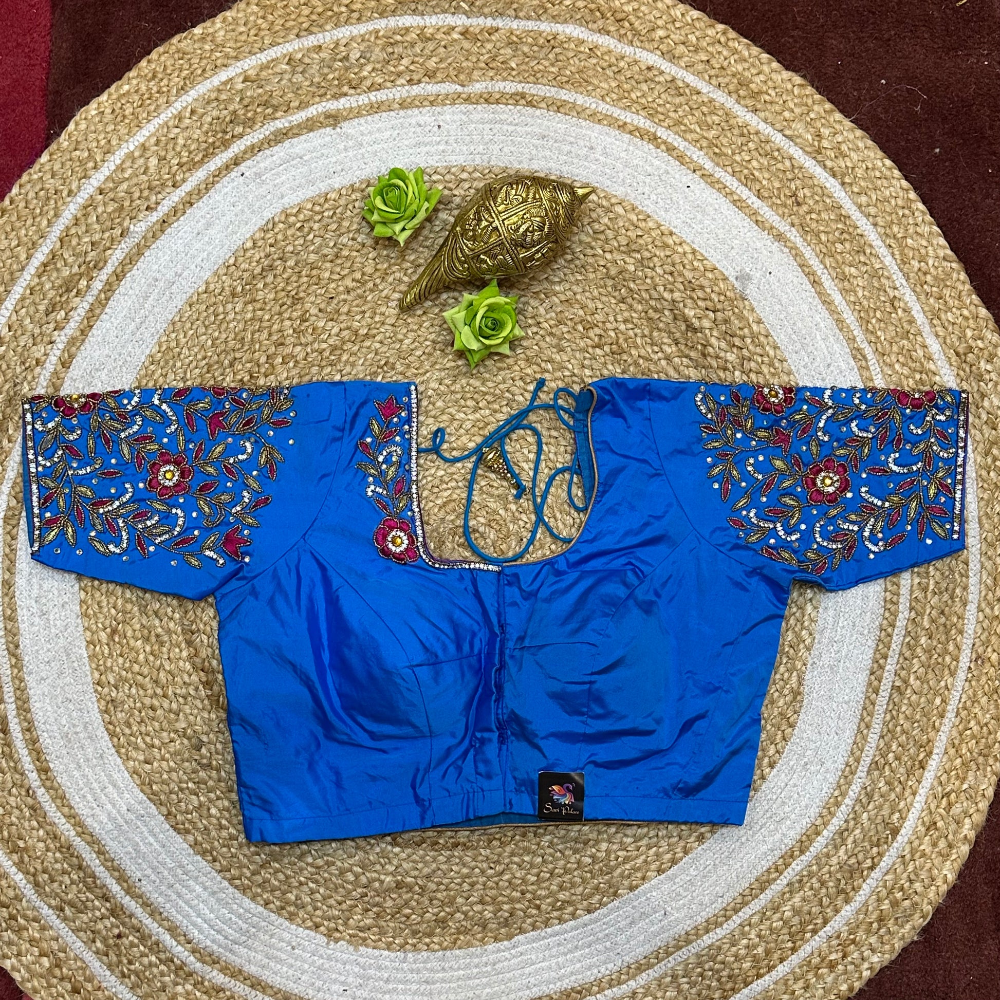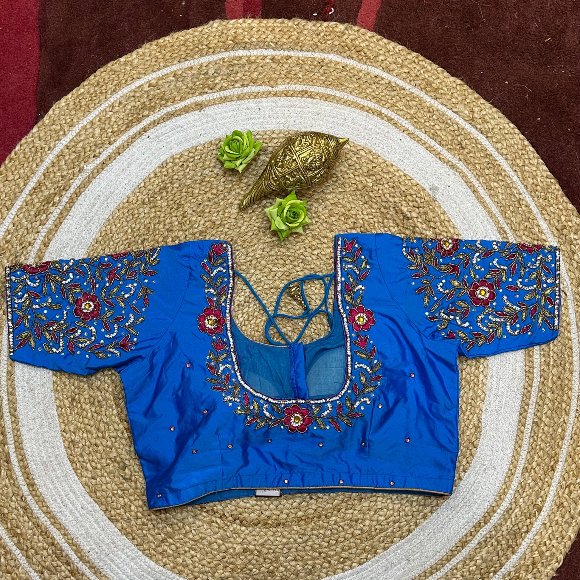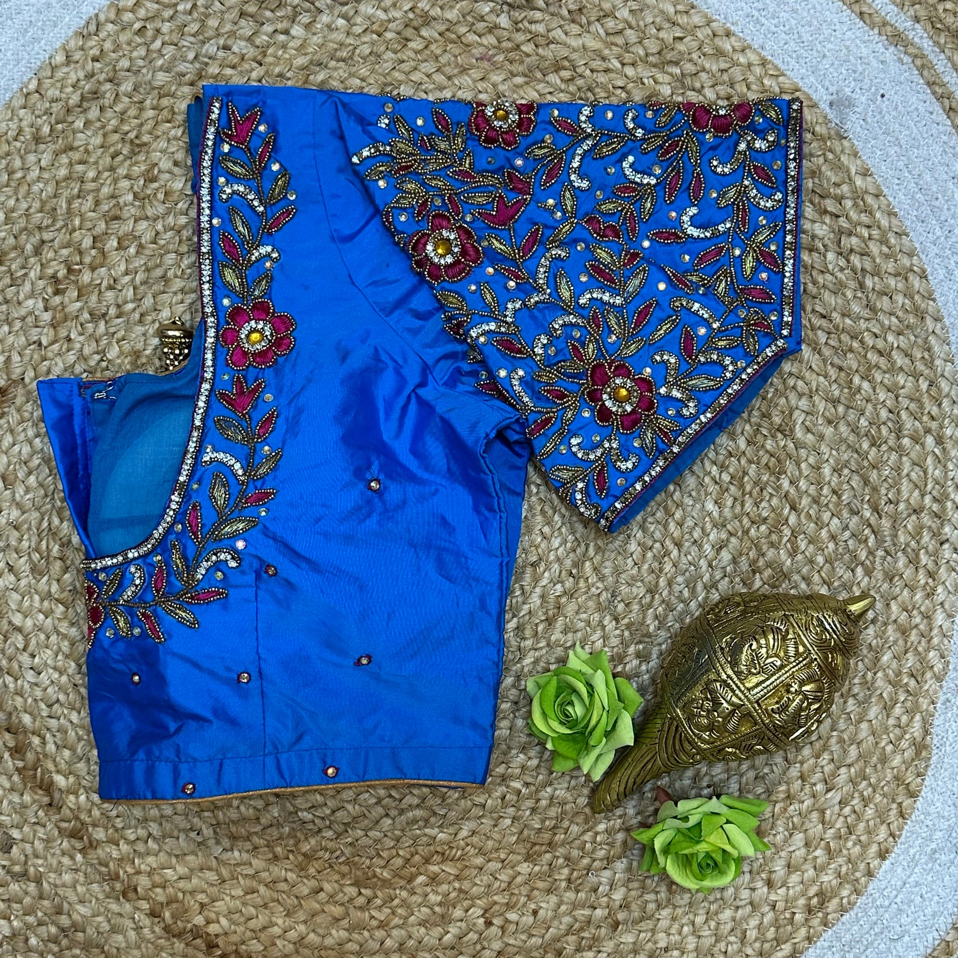 Step into the spotlight with our stunning silk ready-to-wear blouse, a true masterpiece adorned with exquisite hand Aari work featuring Aari/Maggam work on the sleeves and neckline! 💖✨