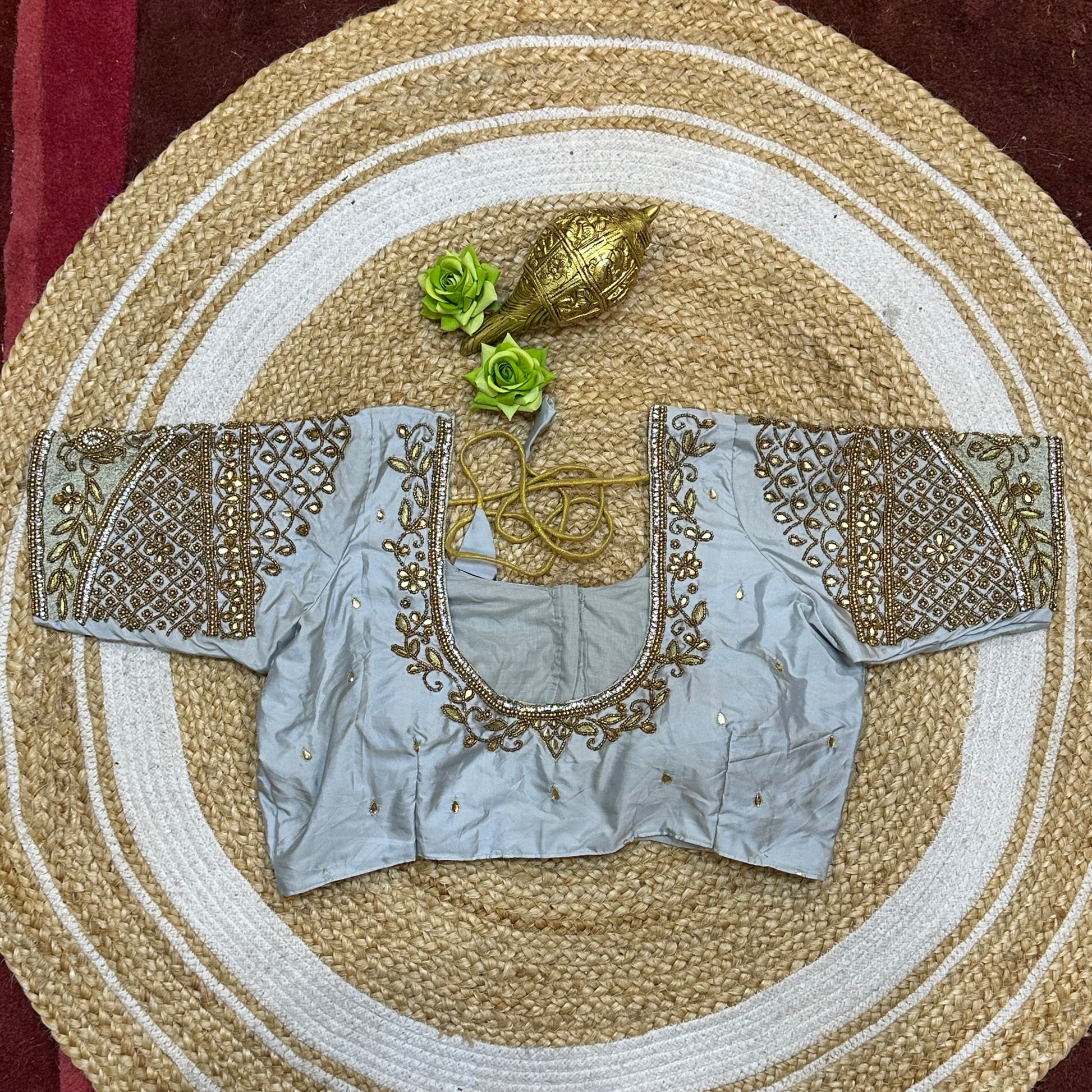 Designed to pair beautifully with your favorite lehenga or sari, this hand-worked delight boasts intricate detailing on one side of the front neck, elegantly draped by your sari on the other. The back neckline and sleeves are elegantly adorned, creating a harmonious look for any occasion! 🎉