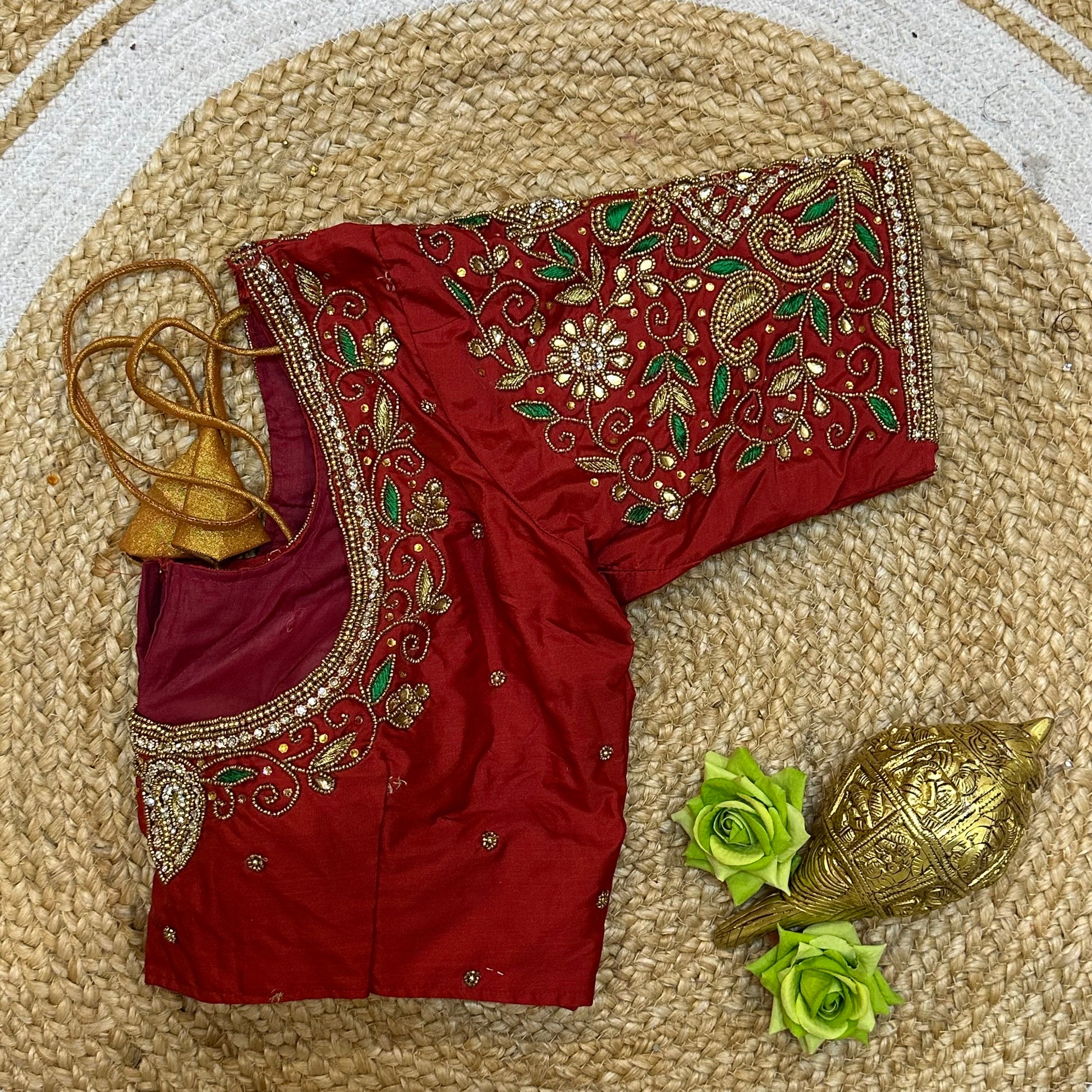 Step into the spotlight with our stunning silk ready-to-wear blouse, a true masterpiece adorned with exquisite hand Aari work featuring Aari/Maggam work on the sleeves and neckline! 💖✨