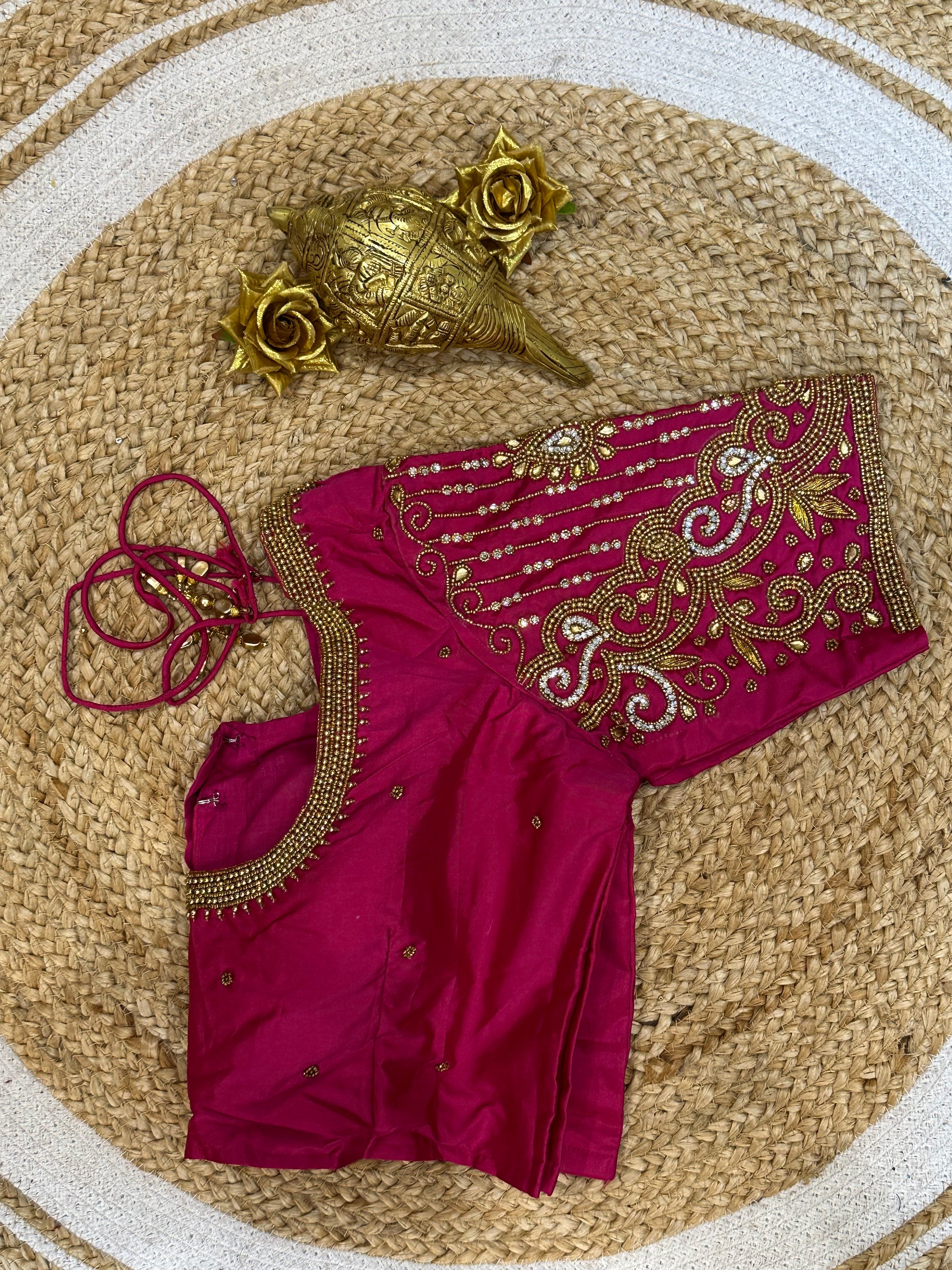 Step into the spotlight with our stunning silk ready-to-wear blouse, a true masterpiece adorned with exquisite hand embroidery featuring Aari/Maggam work on the sleeves and neckline! 💖✨