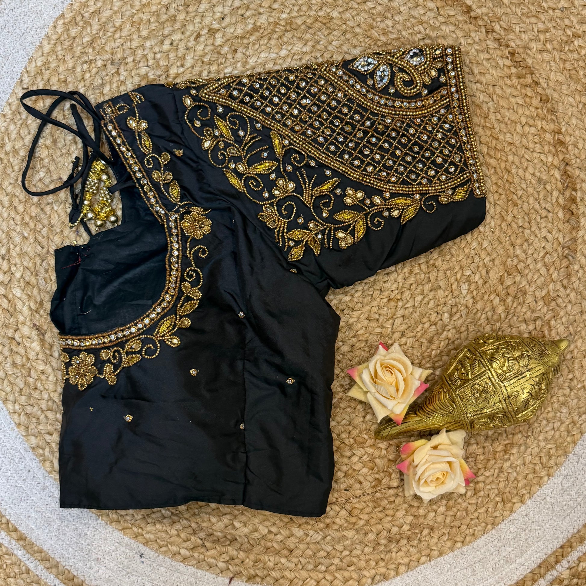 Step into the spotlight with our stunning silk ready-to-wear blouse, a true masterpiece adorned with exquisite hand Aari work featuring Aari/Maggam work on the sleeves and neckline! 💖✨