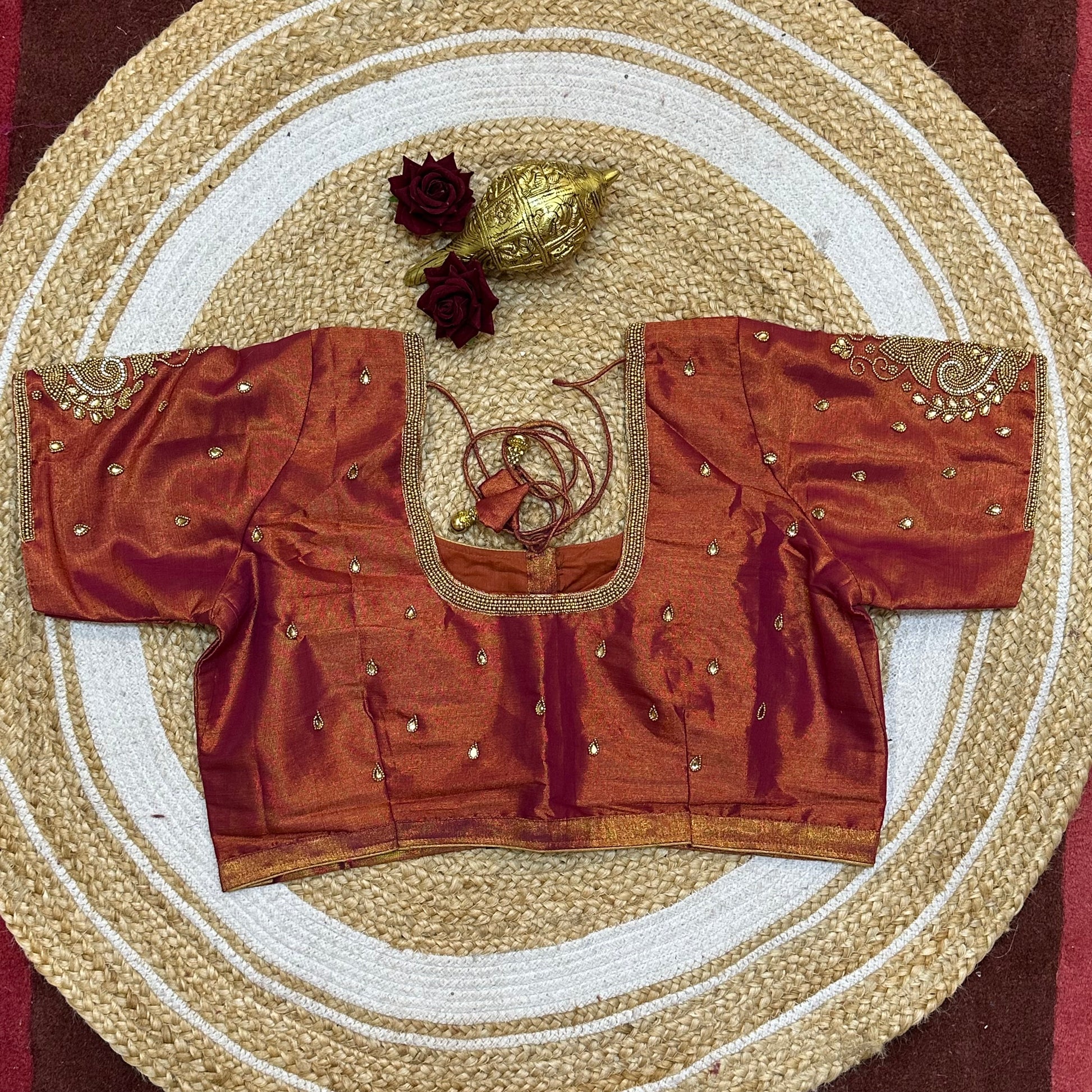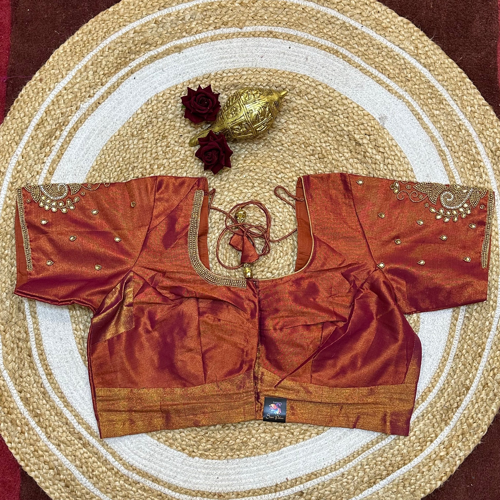 Step into the spotlight with our stunning silk ready-to-wear blouse, a true masterpiece adorned with exquisite hand Aari work featuring Aari/Maggam work on the sleeves and neckline! 💖✨