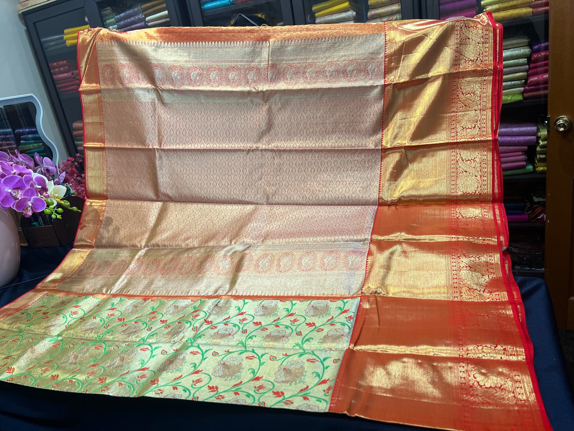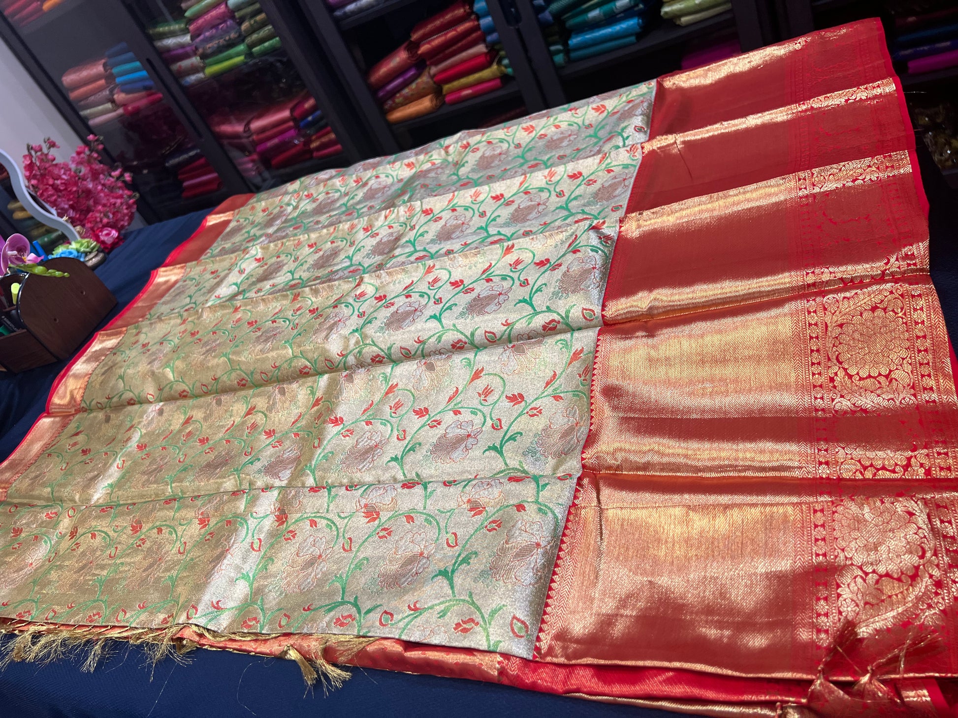 Prepare to turn heads with this exquisite sari in a breathtaking colour of Golden Tissue with Green and Red Flowers woven with Red & Gold Zari border . Perfect for any occasion, this piece radiates elegance and sophistication! 😍💖