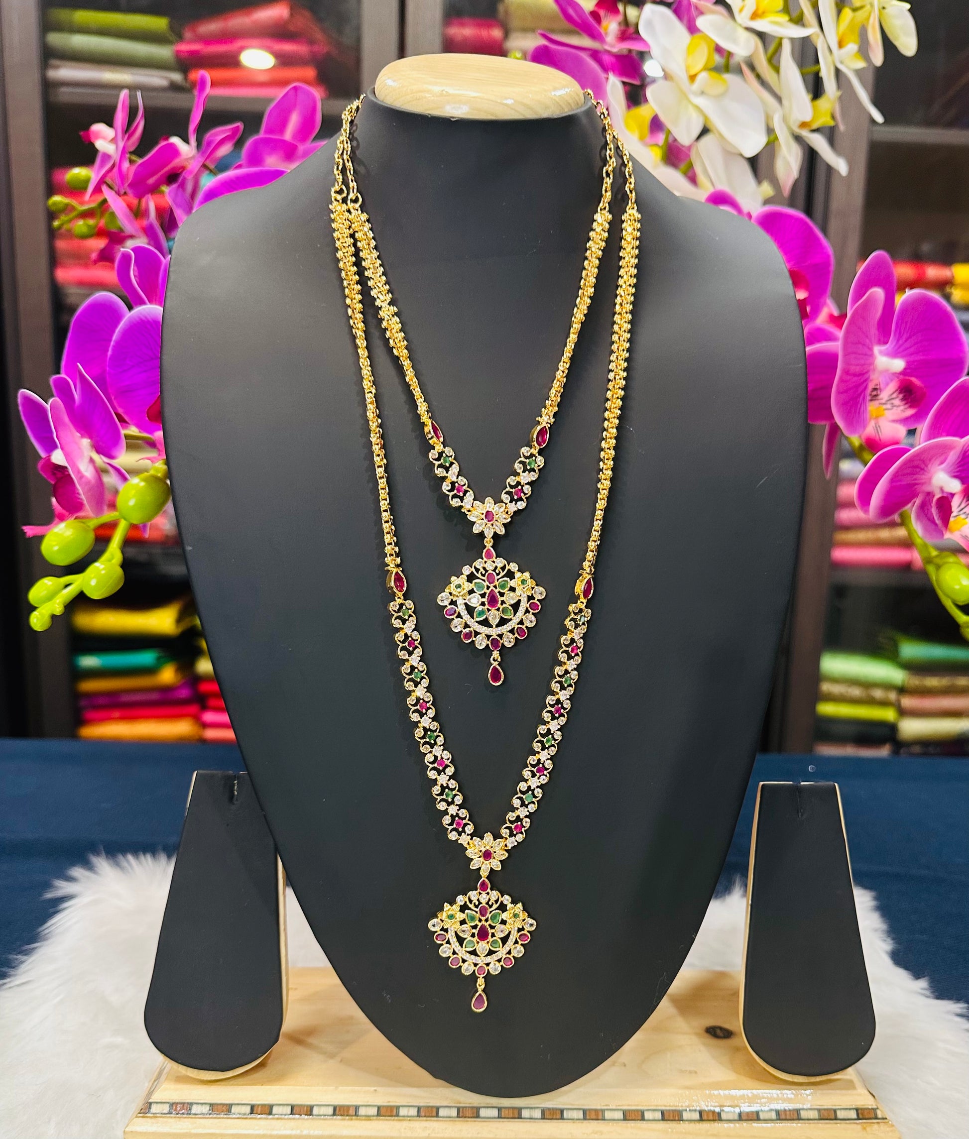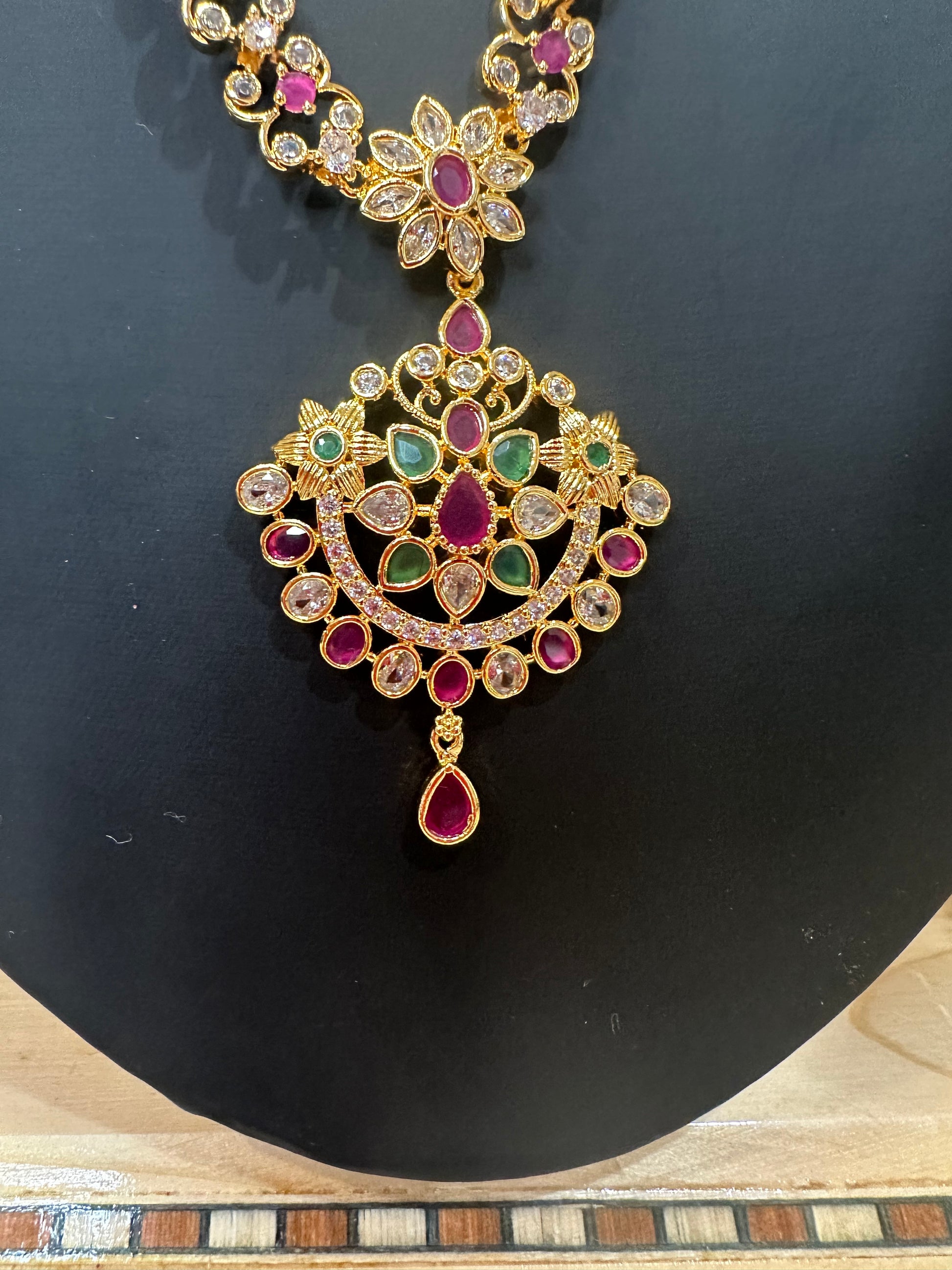 This is a Forming Gold necklace combo set. The jewellery have White, pink & Green stones. The gorgeous set looks like real gold and made with superior quality stones and workmanship.