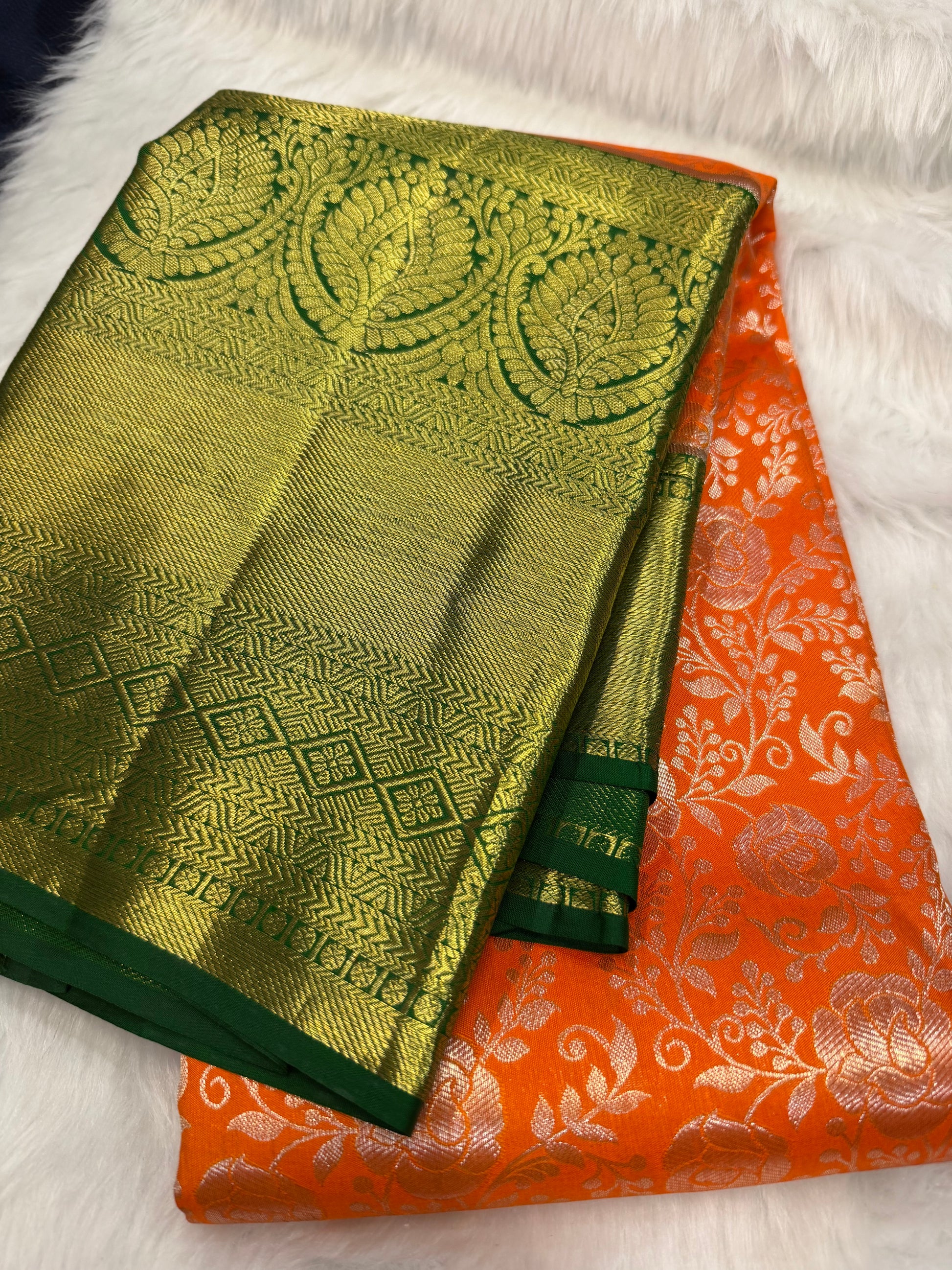 Gorgeous Orange Kanchipuram/ Kanjivaram Pure silk sari with Green Border. Celebrate timeless elegance with this exquisite Kanchipuram Pure Silk Saree, beautifully woven with rich gold zari work. Handcrafted by master weavers of Kanchipuram using 100% pure silk, this saree reflects the grandeur, durability, and heritage of traditional South Indian craftsmanship.