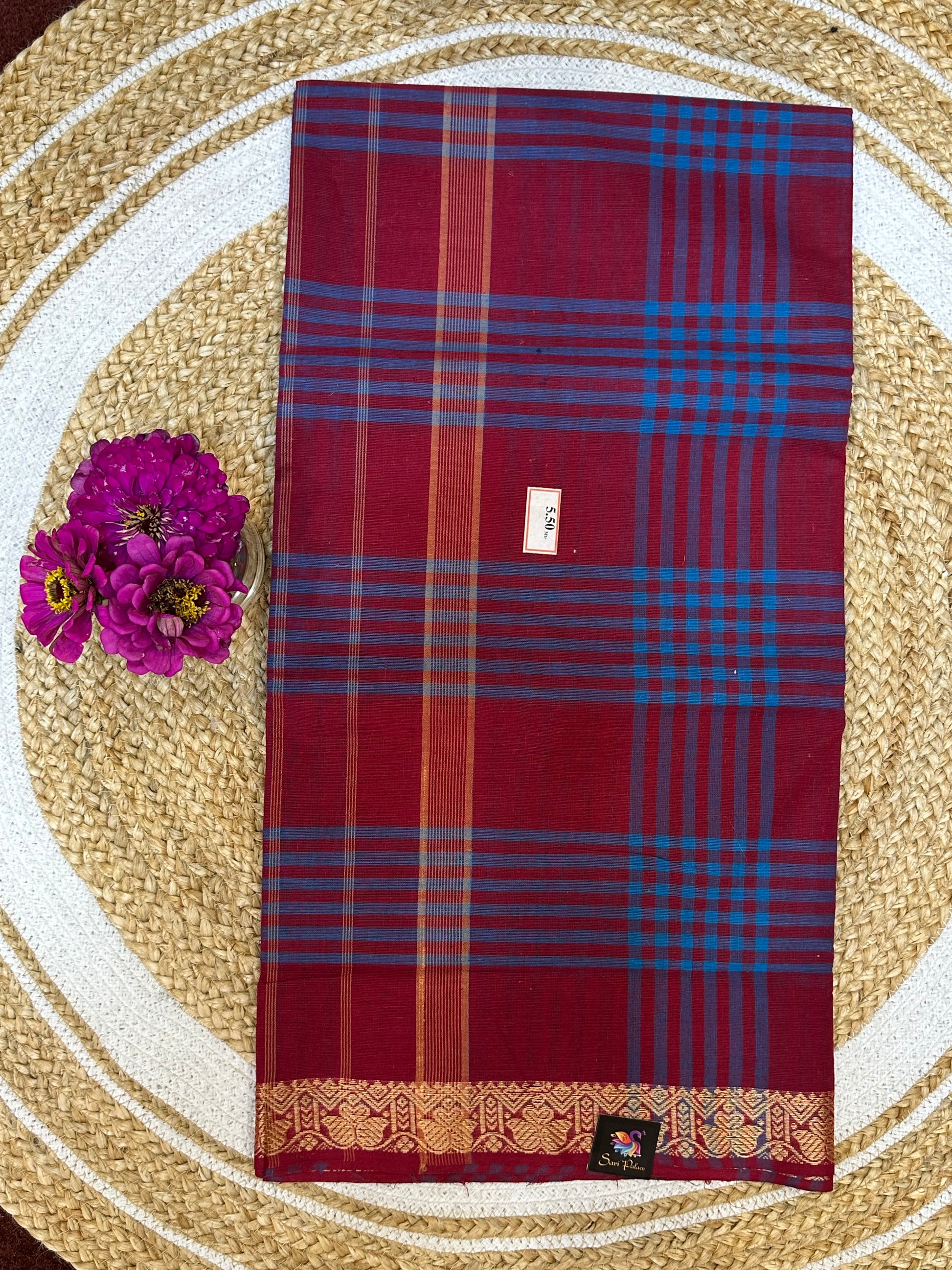 This item is a Chettinad cotton saree featuring a vibrant checked pattern with a traditional gold zari border. These sarees, also known as Kandangi or Sungudi sarees, are handwoven in Tamil Nadu, India, and are renowned for their bold colors and geometric designs.