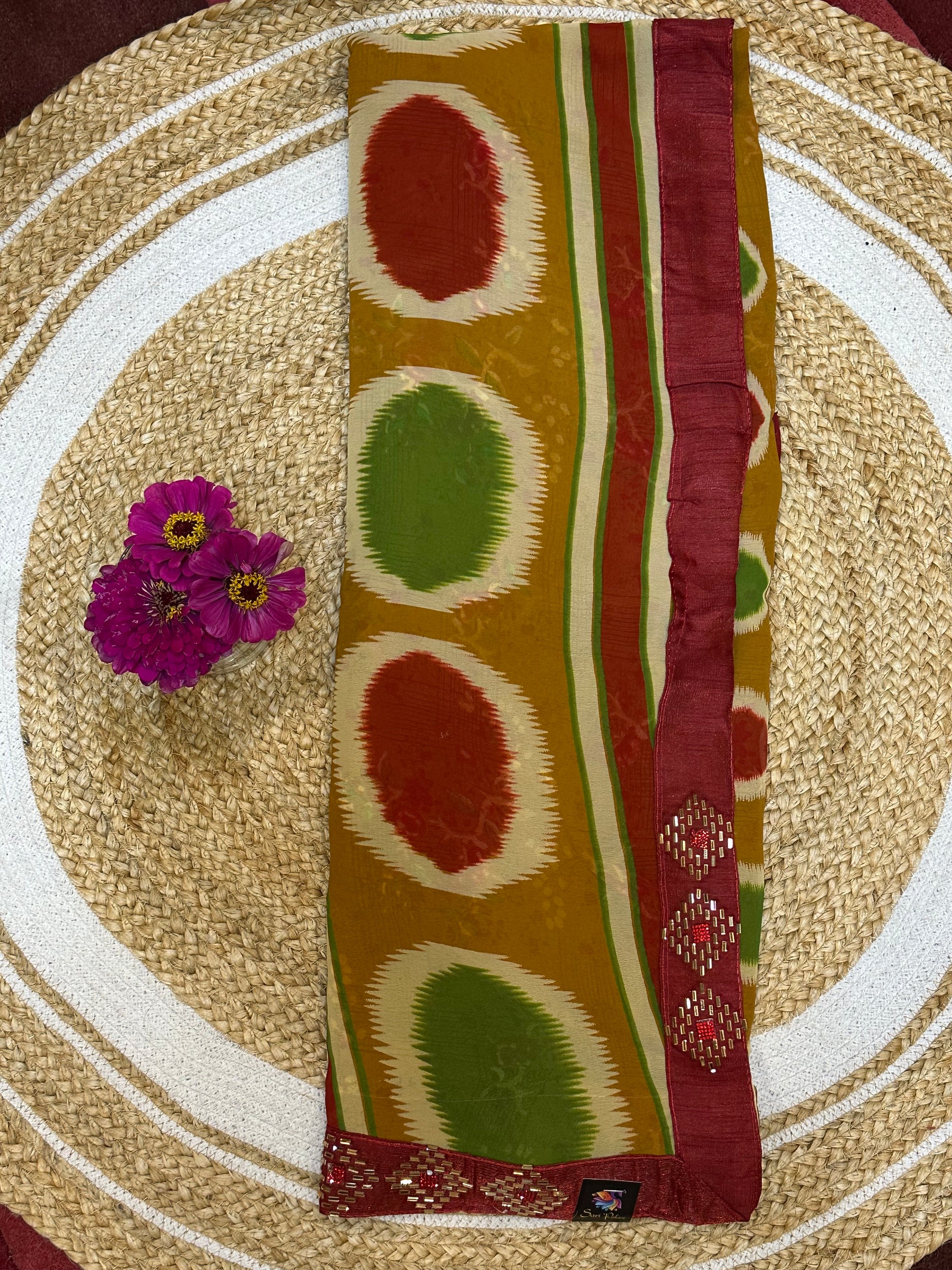 This listing is for a gorgeous printed chiffon/ Georgette Sari. The big circles are in the pallu and the blouse material is shown in the last photo.