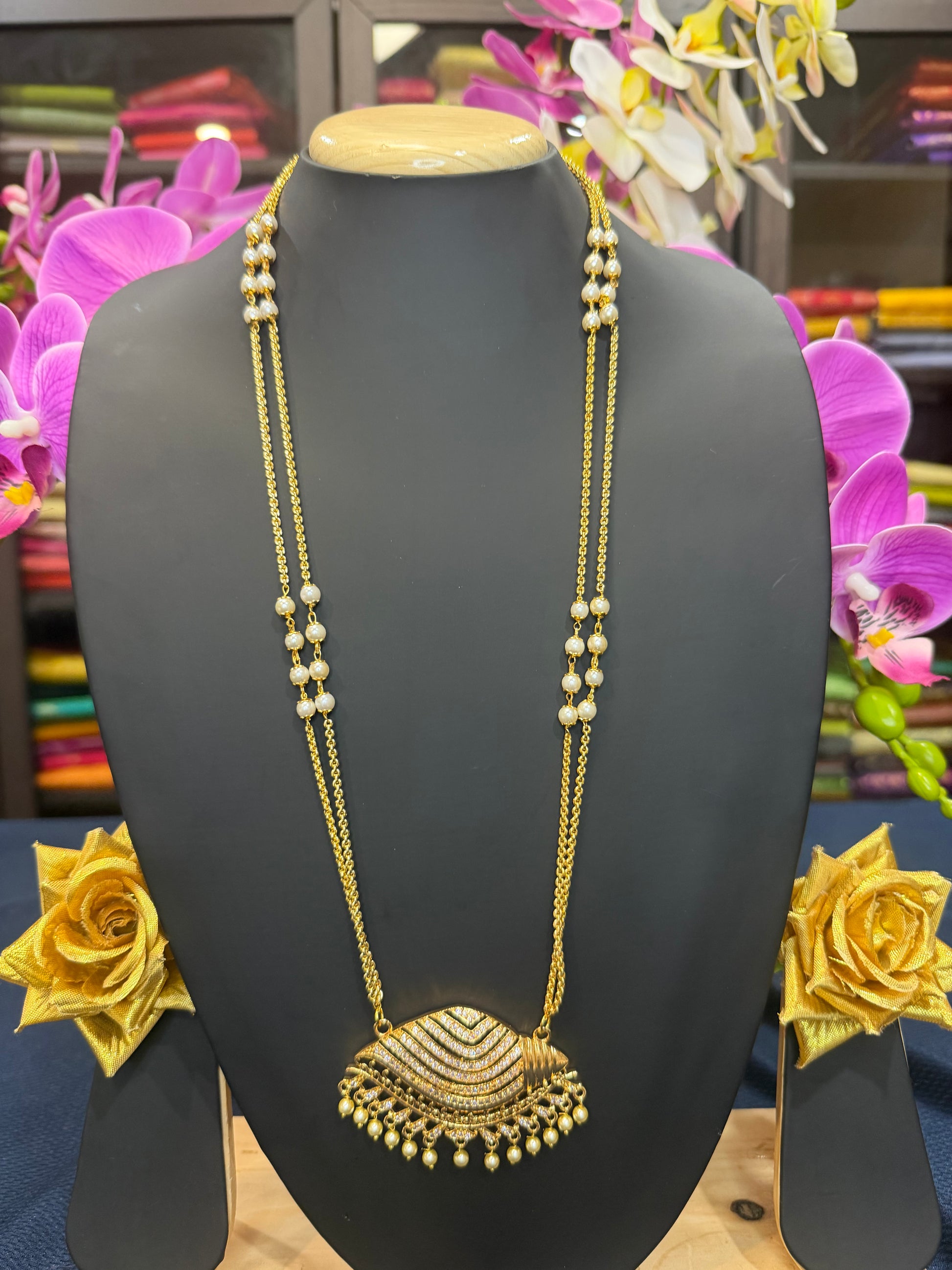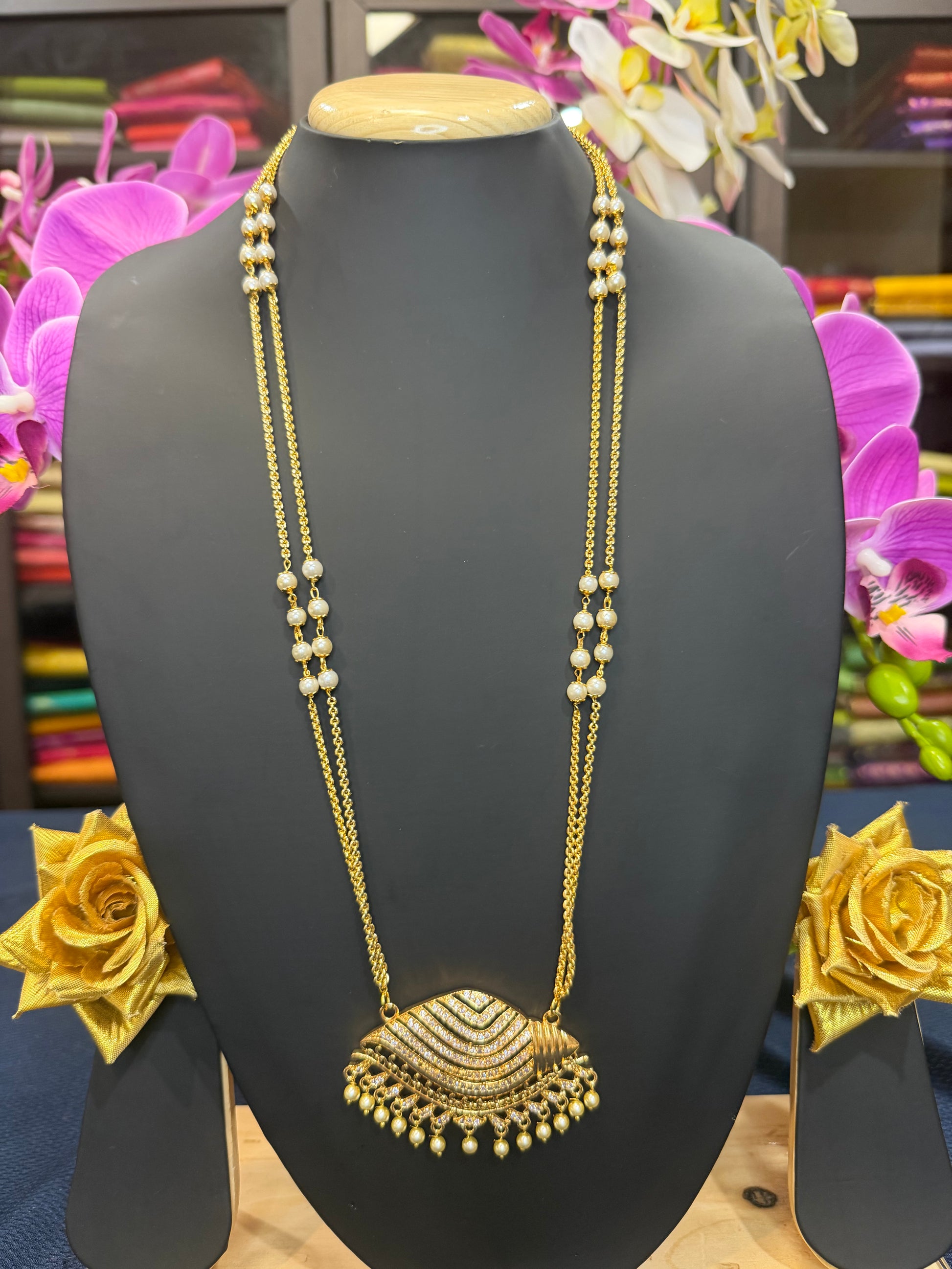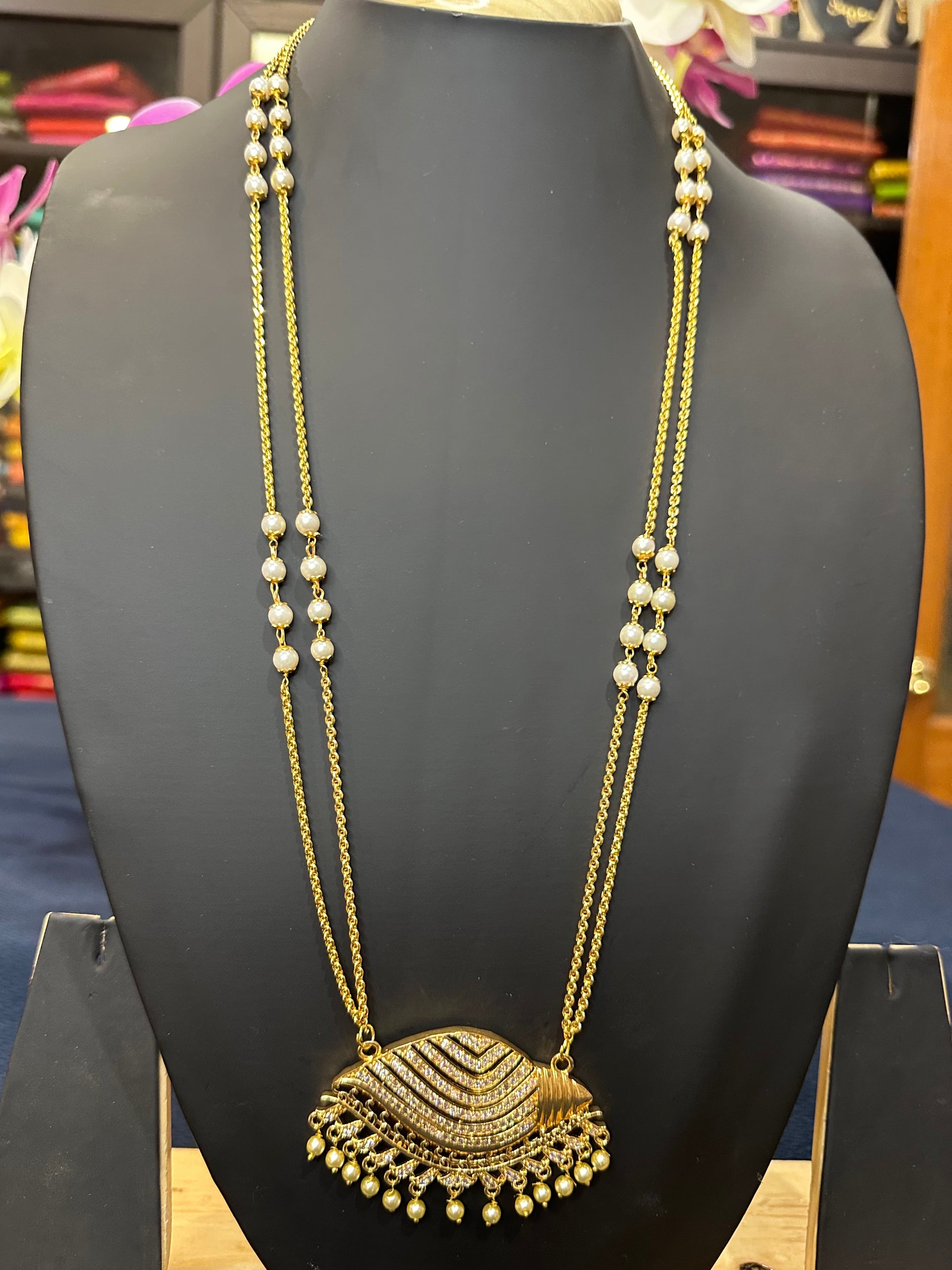 Impon Bridal Pendant has White stones. The pendant is handmade in Impon metals with superior quality stones and workmanship. This is a gorgeous piece of handmade jewellery. The chain is gold polished and has pearls.