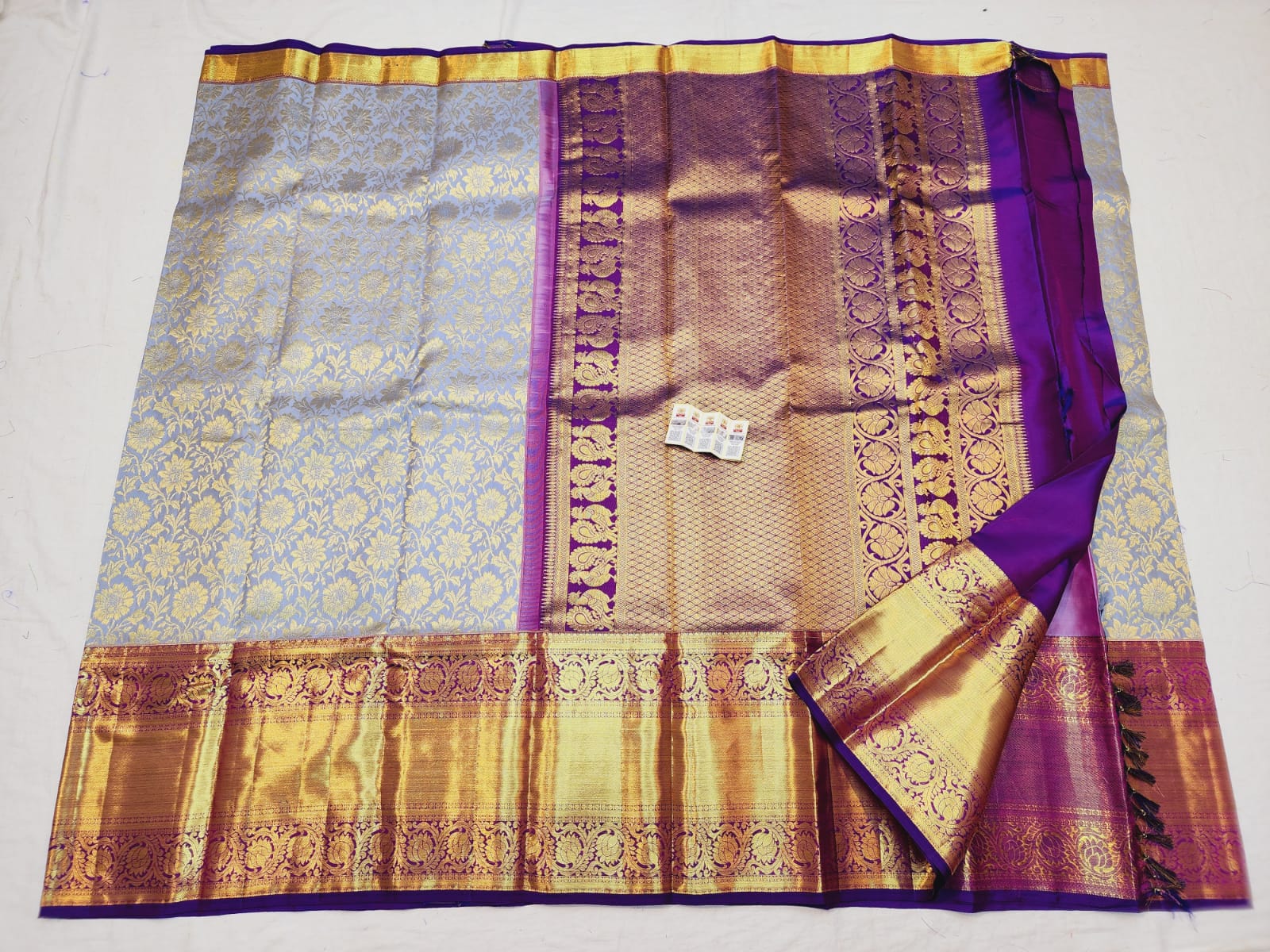 Gorgeous Bluish Grey Bridal Kanchipuram/ Kanjivaram Pure silk sari with stunning Purple Border with Gold Jari. Celebrate timeless elegance with this exquisite Kanchipuram Pure Silk Saree, beautifully woven with rich gold zari work. Handcrafted by master weavers of Kanchipuram using 100% pure silk, this saree reflects the grandeur, durability, and heritage of traditional South Indian craftsmanship.