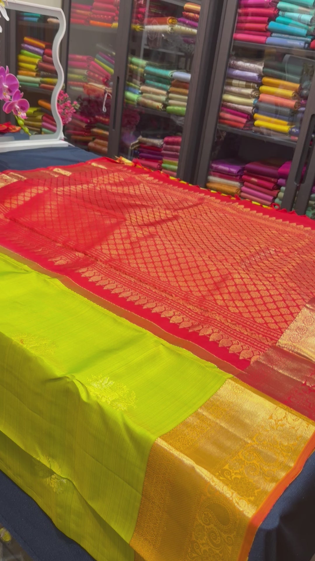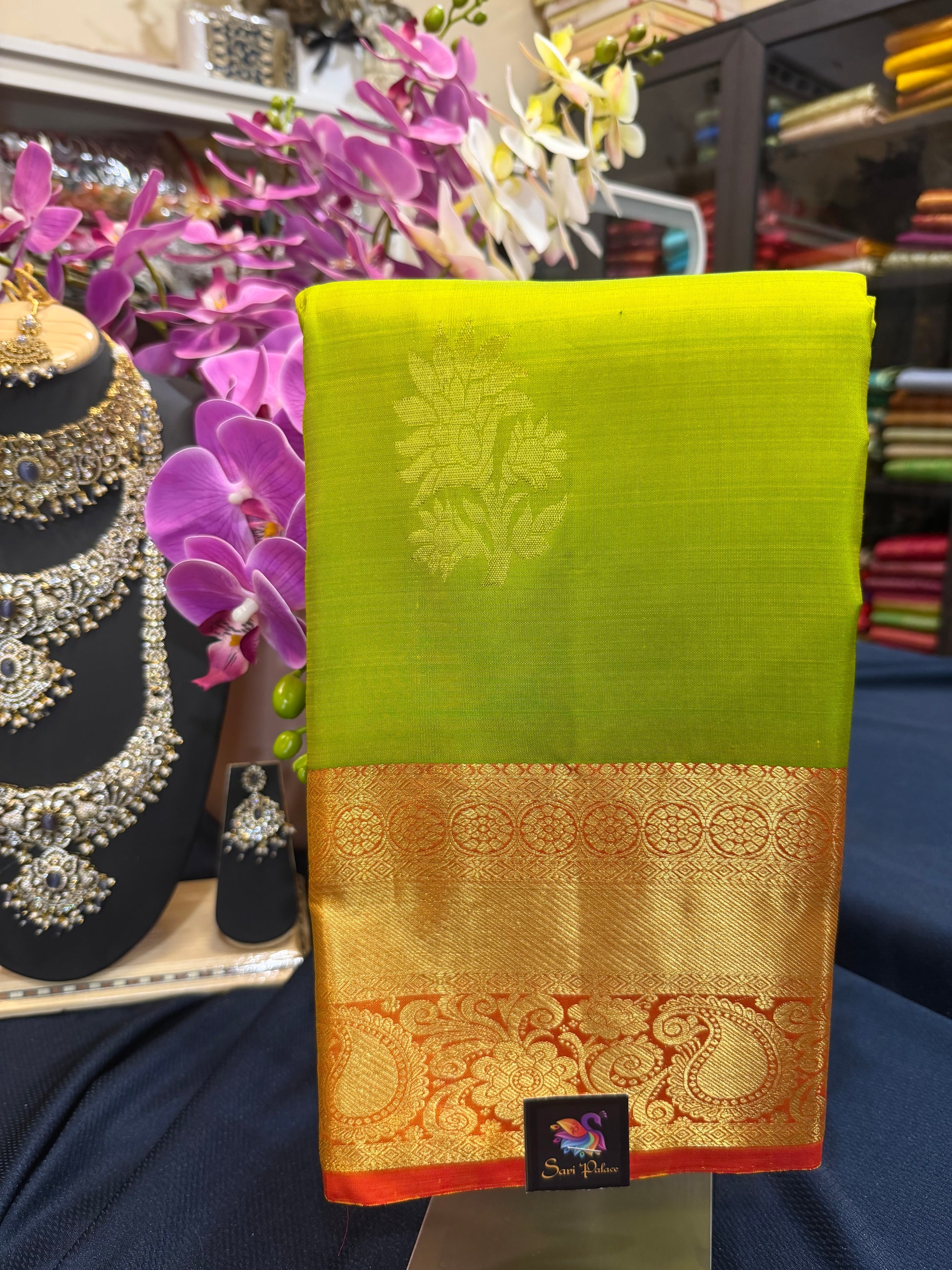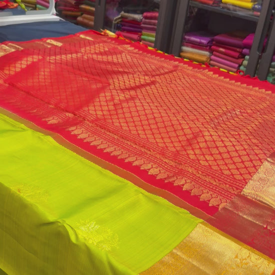 Gorgeous Green, Kanchipuram/ Kanjivaram Pure silk sari with stunning Orange Border. This is a gorgeous shade of green and looks superb with the Orange border and the Red Rich Pallu and Red Blouse material. Celebrate timeless elegance with this exquisite Kanchipuram Pure Silk Saree, beautifully woven with rich gold zari work. Handcrafted by master weavers of Kanchipuram using 100% pure silk, this saree reflects the grandeur, durability, and heritage of traditional South Indian craftsmanship.