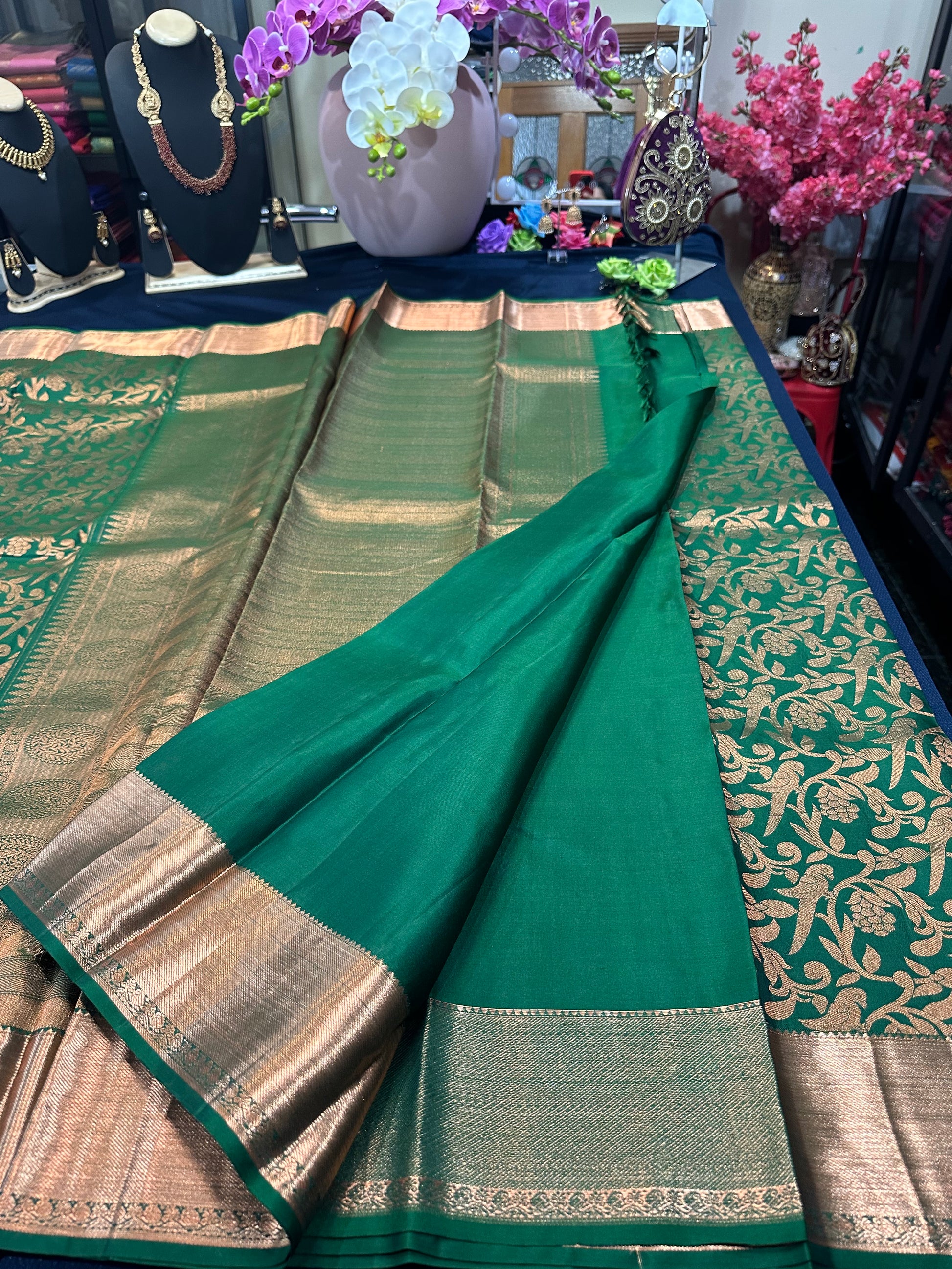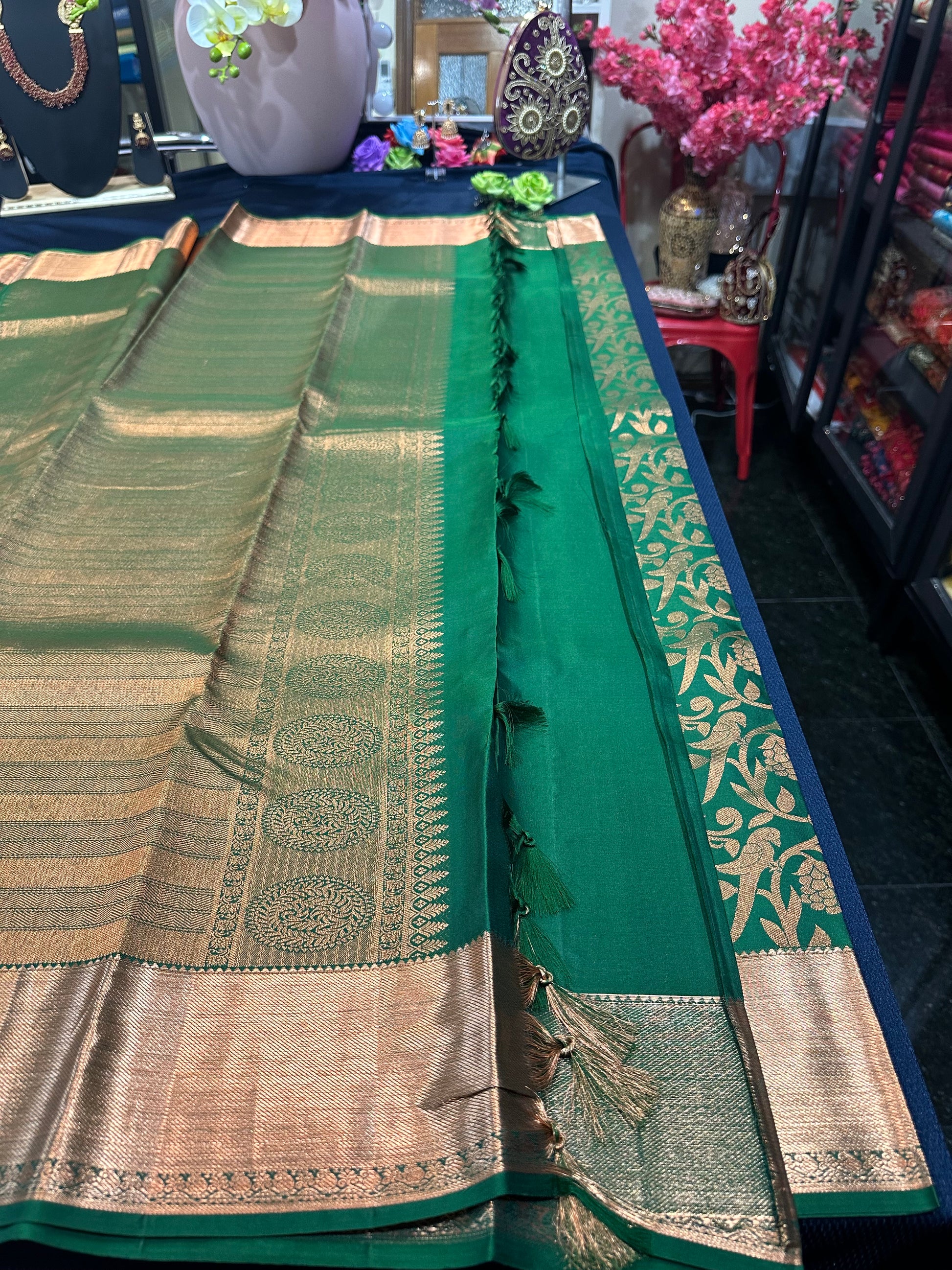 The luxurious silk body is enhanced by intricately designed borders and a richly woven pallu that shimmer with zari, creating a regal and sophisticated appeal. Known for its graceful drape and lasting quality, this saree is an ideal choice for weddings, bridal ceremonies, house warmings, puberty ceremonies and festive celebrations—designed to be cherished as an heirloom for generations.