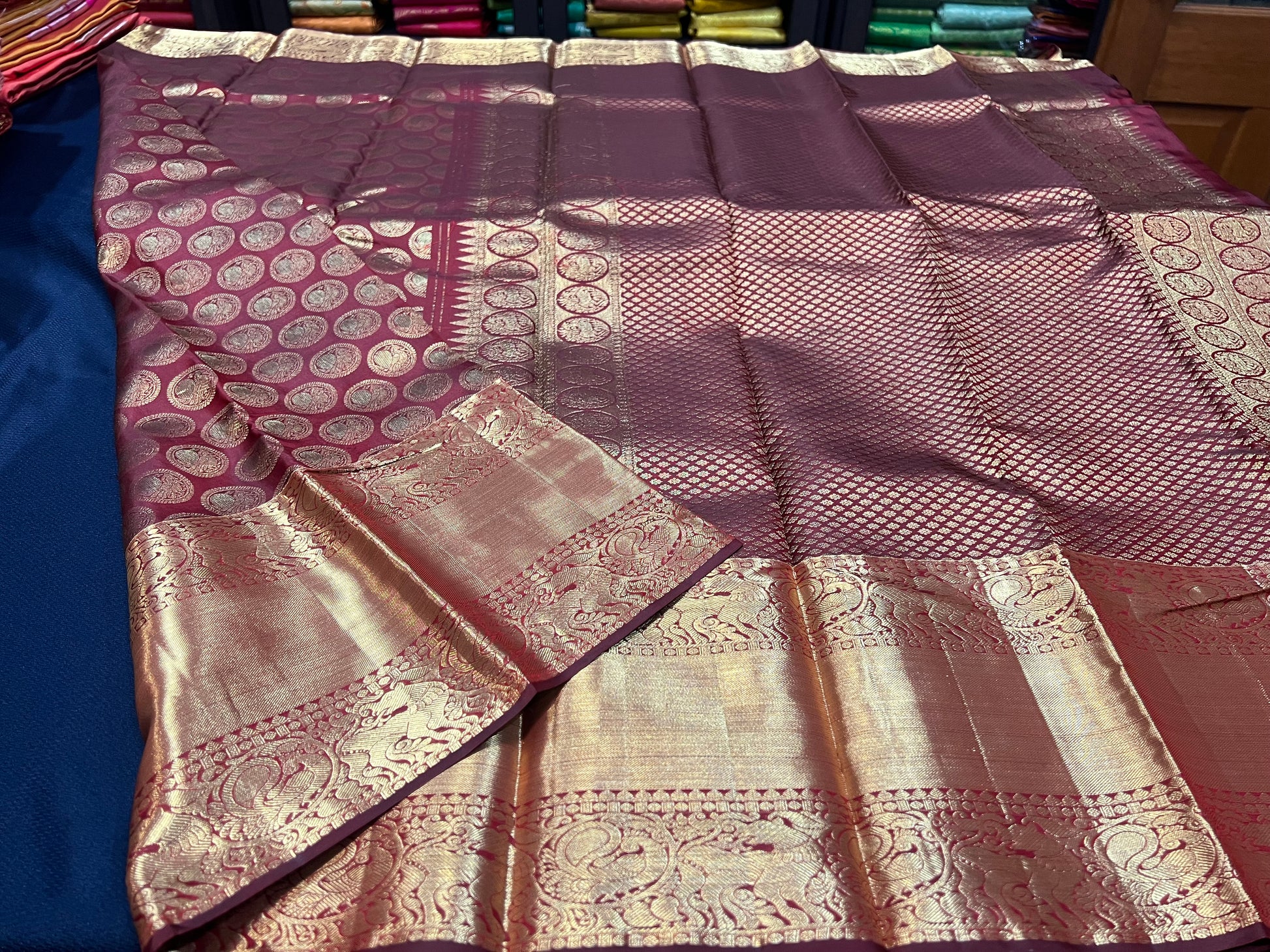 The luxurious silk body is enhanced by intricately designed borders and a richly woven pallu that shimmer with zari, creating a regal and sophisticated appeal. Known for its graceful drape and lasting quality, this saree is an ideal choice for weddings, bridal ceremonies, house warmings, puberty ceremonies and festive celebrations—designed to be cherished as an heirloom for generations.