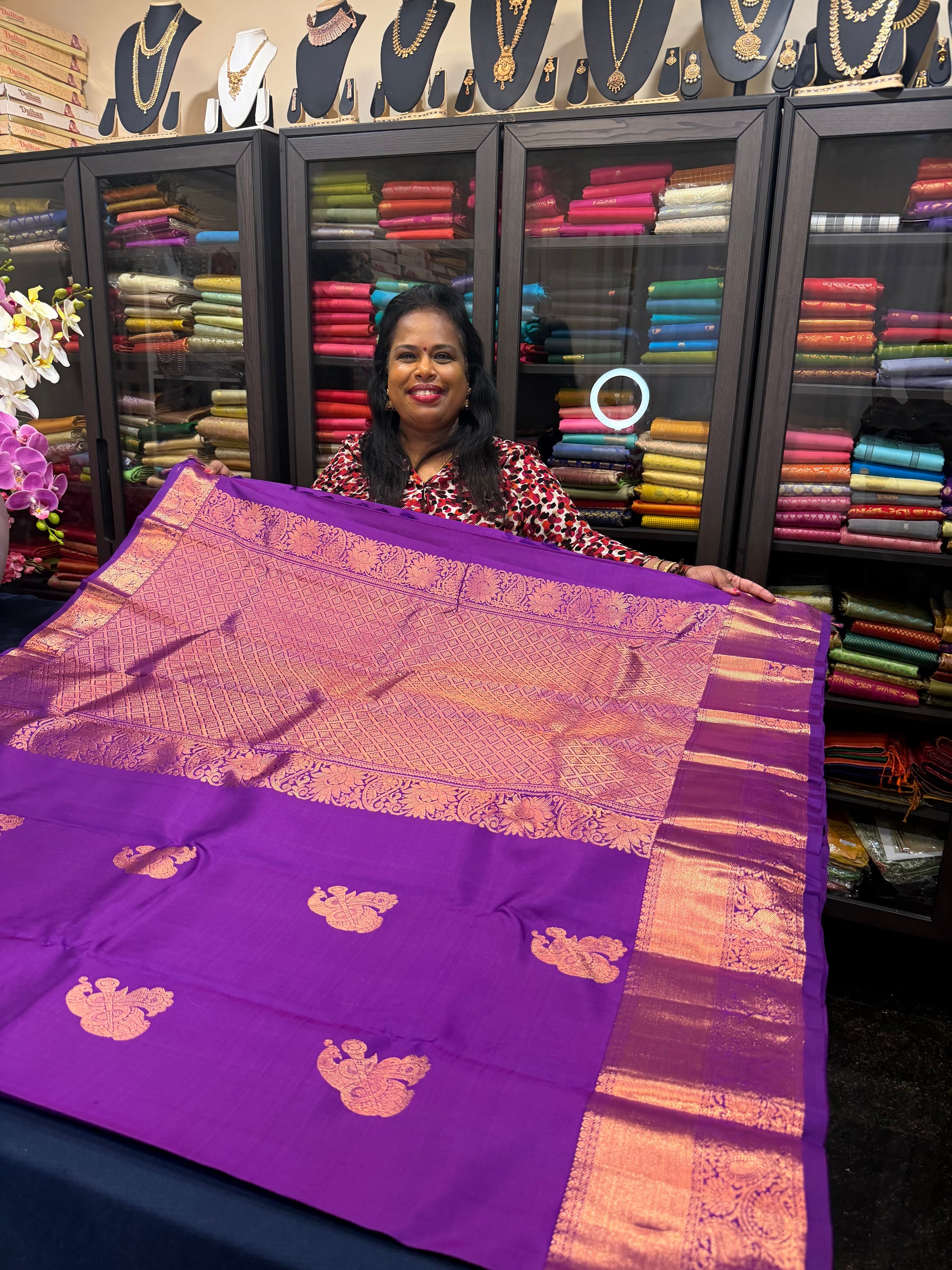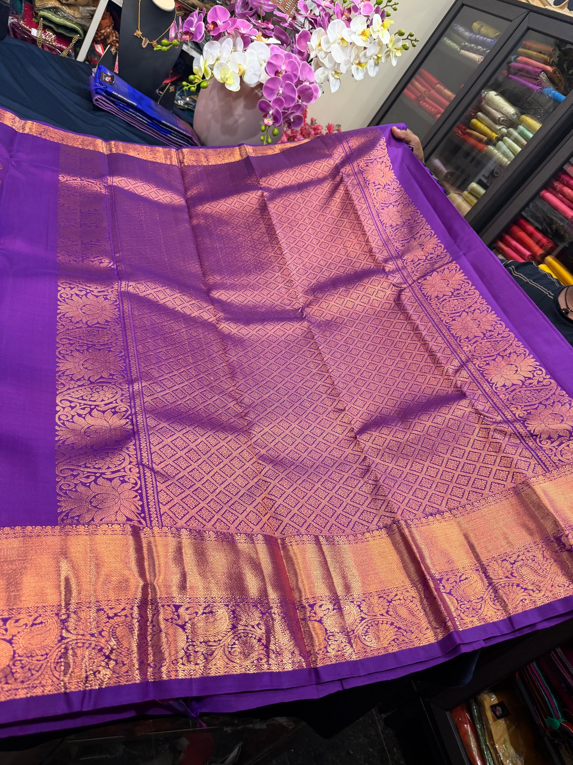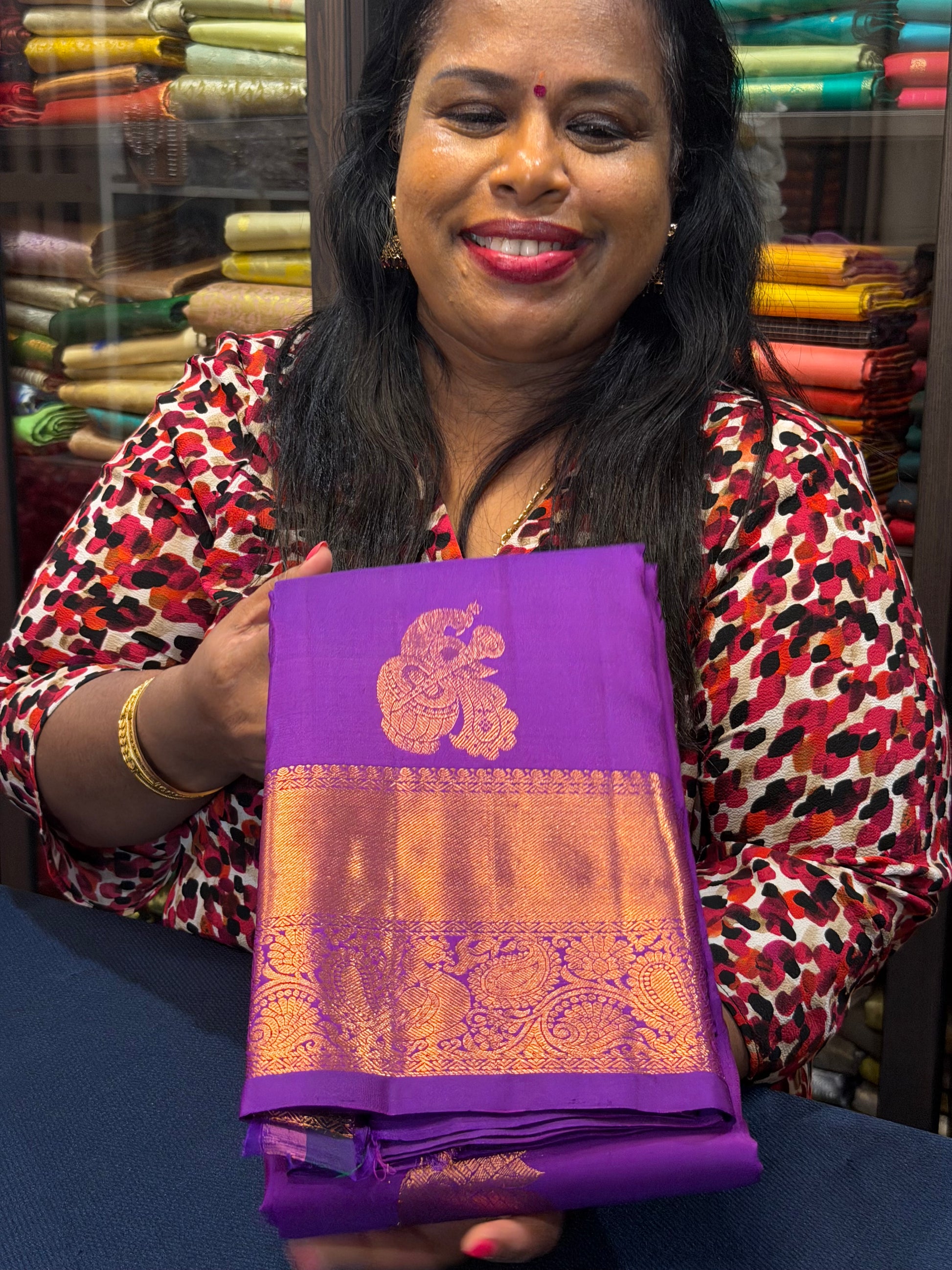 Prepare to turn heads with this exquisite sari in a breathtaking Purple colour with Copper Zari. Perfect for any occasion, this piece radiates elegance and sophistication! 😍💖