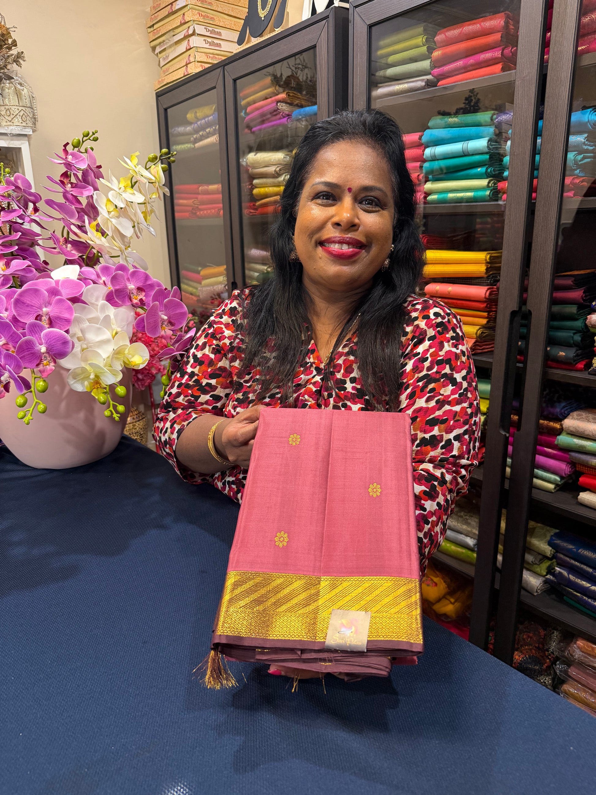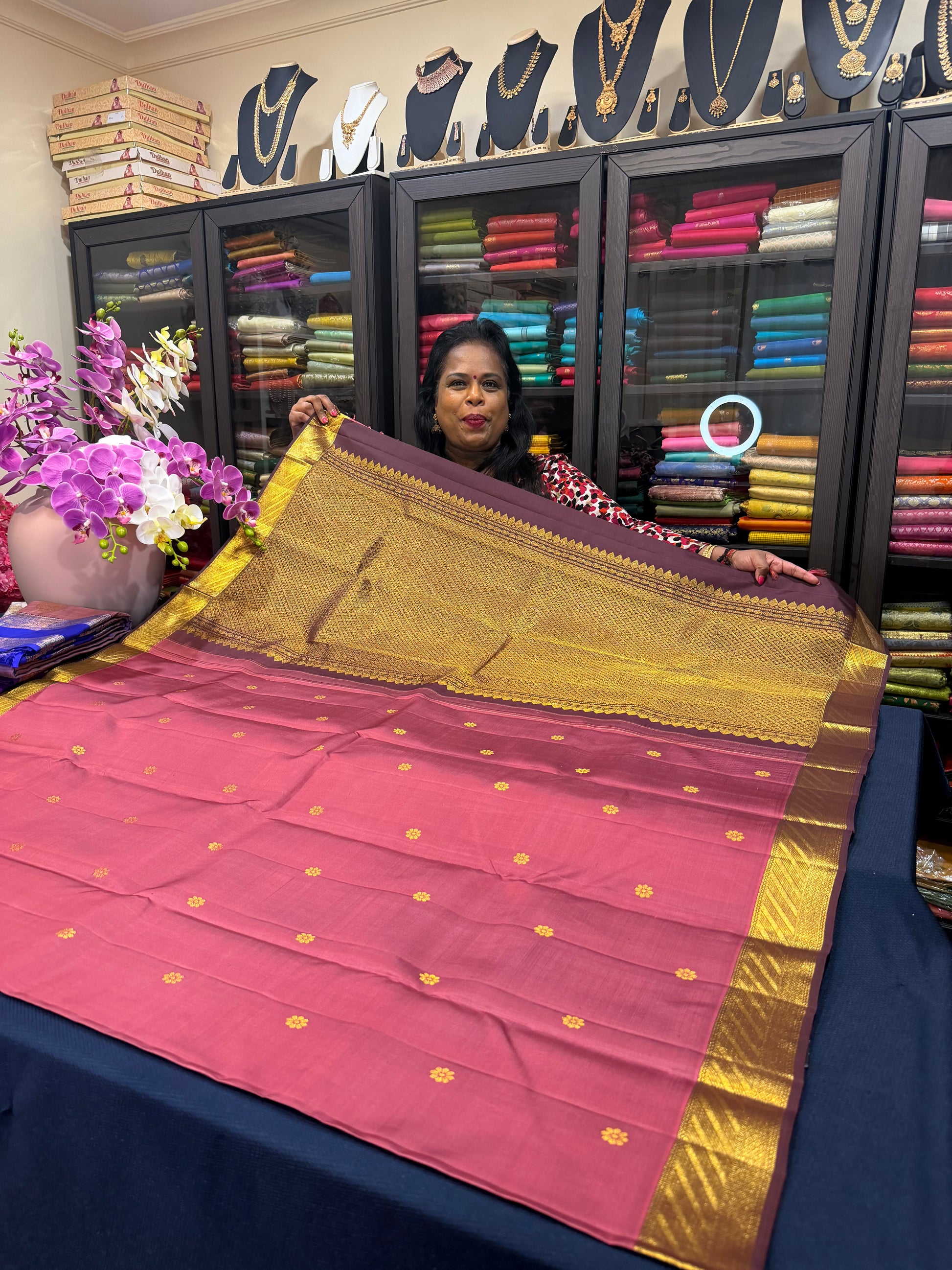 Prepare to turn heads with this exquisite sari in a breathtaking Rusty Pink and Deep wine (almost chocolate brown) colour with Gold Zari. Perfect for any occasion, this piece radiates elegance and sophistication! 😍💖