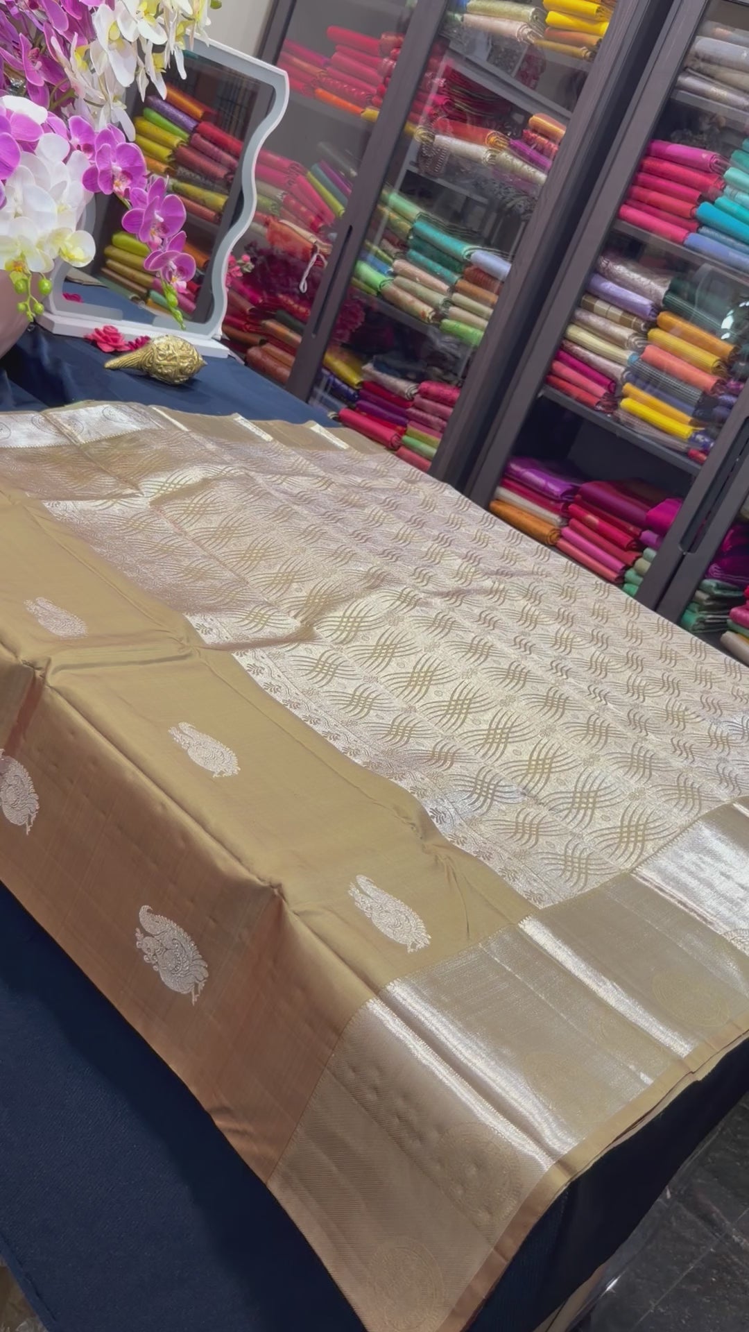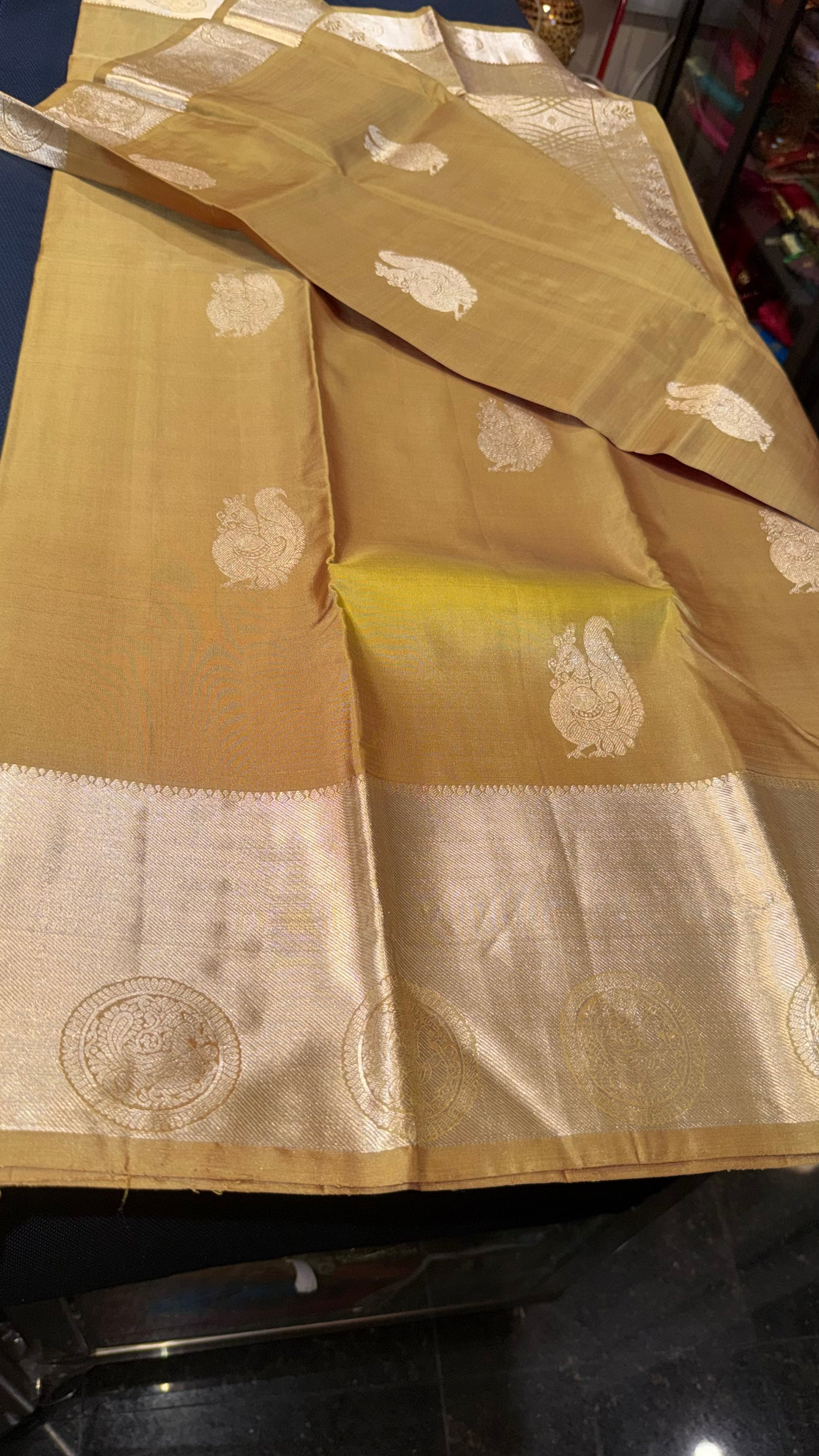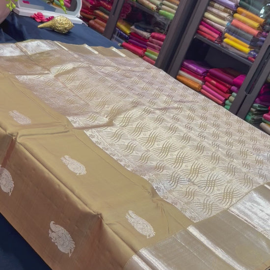 The luxurious silk body is enhanced by intricately designed borders and a richly woven pallu that shimmer with zari, creating a regal and sophisticated appeal. Known for its graceful drape and lasting quality, this saree is an ideal choice for weddings, bridal ceremonies, house warmings, puberty ceremonies and festive celebrations—designed to be cherished as an heirloom for generations.