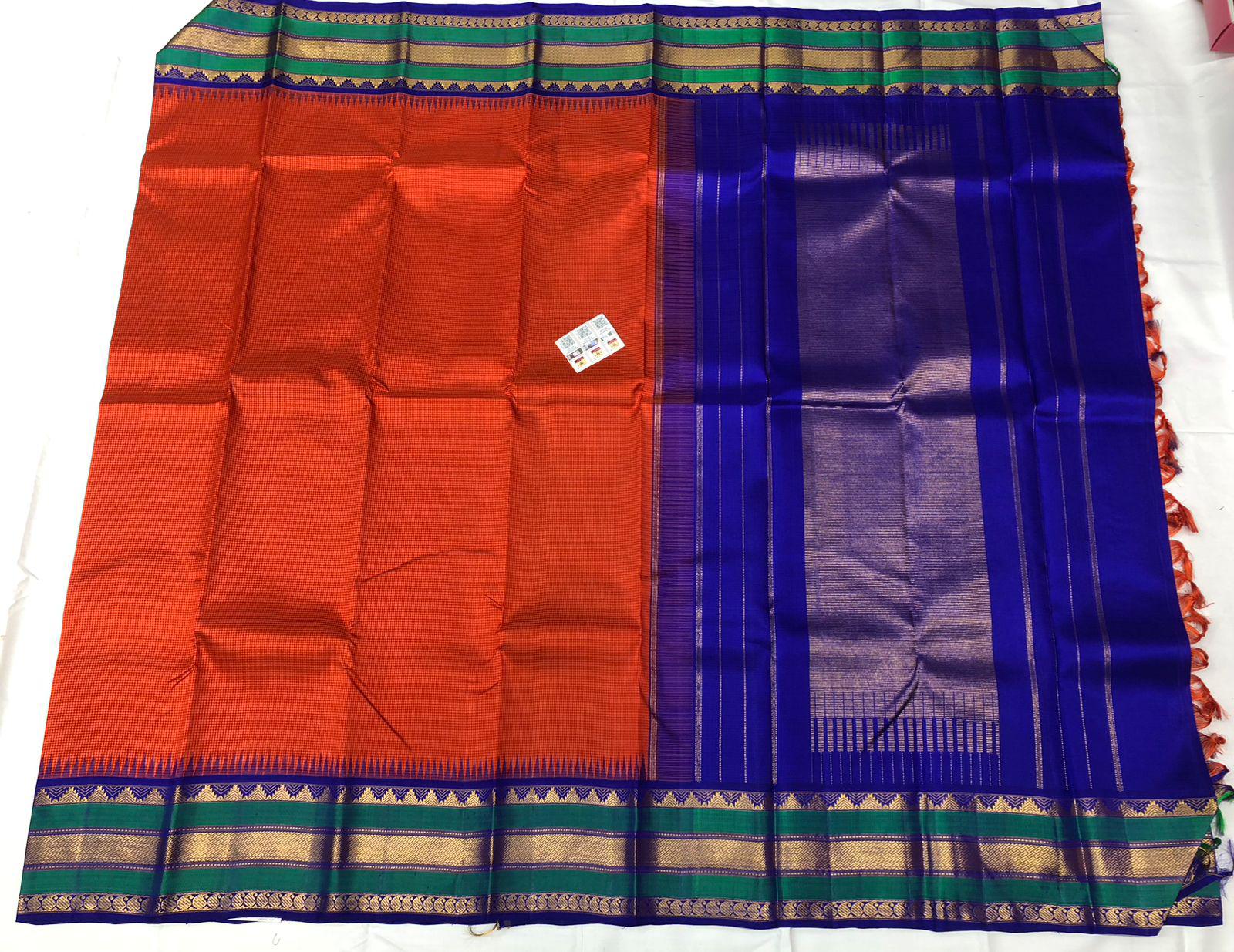Color: Bright orange body with royal blue pallu and Rama green-gold borders.