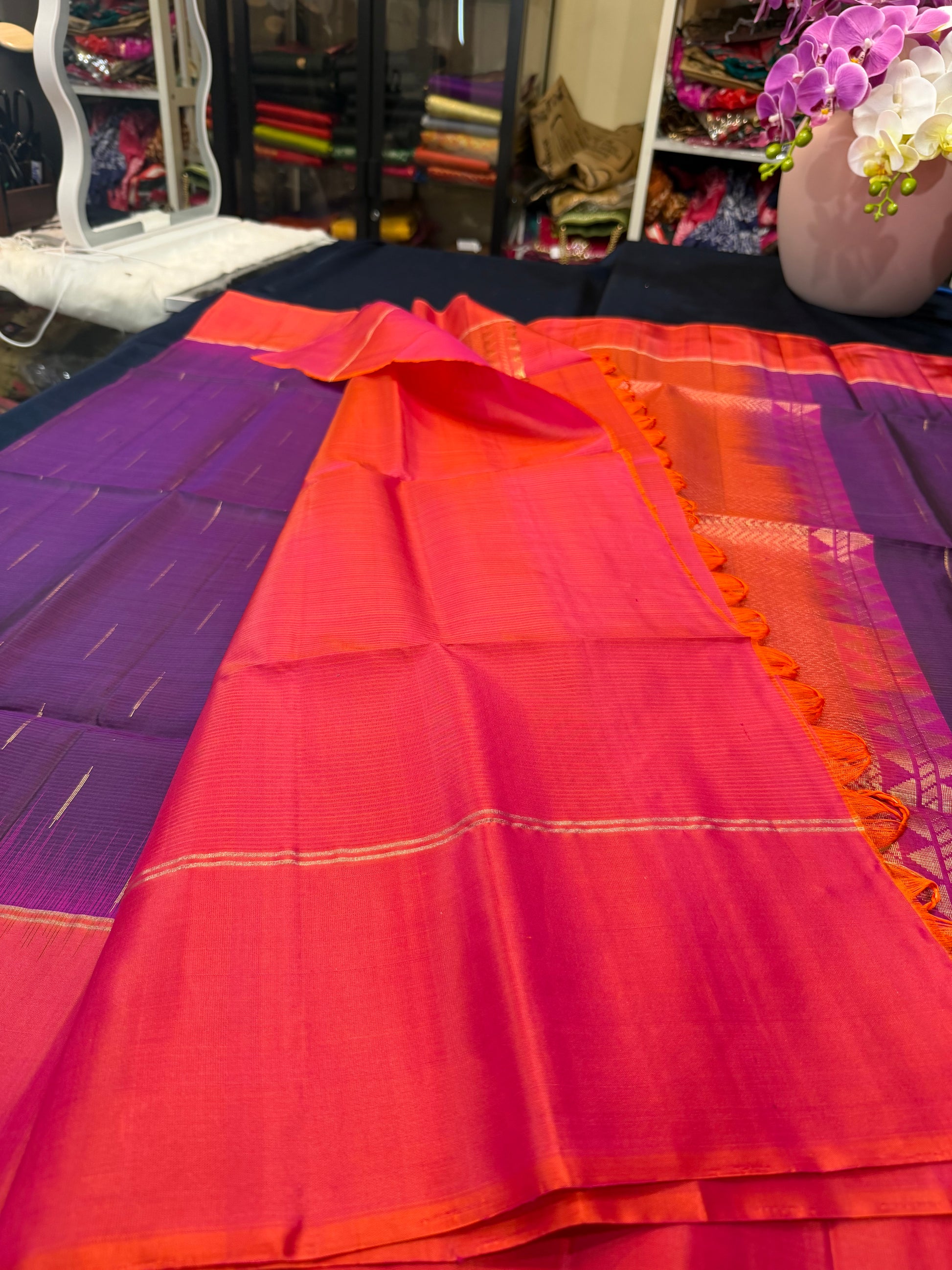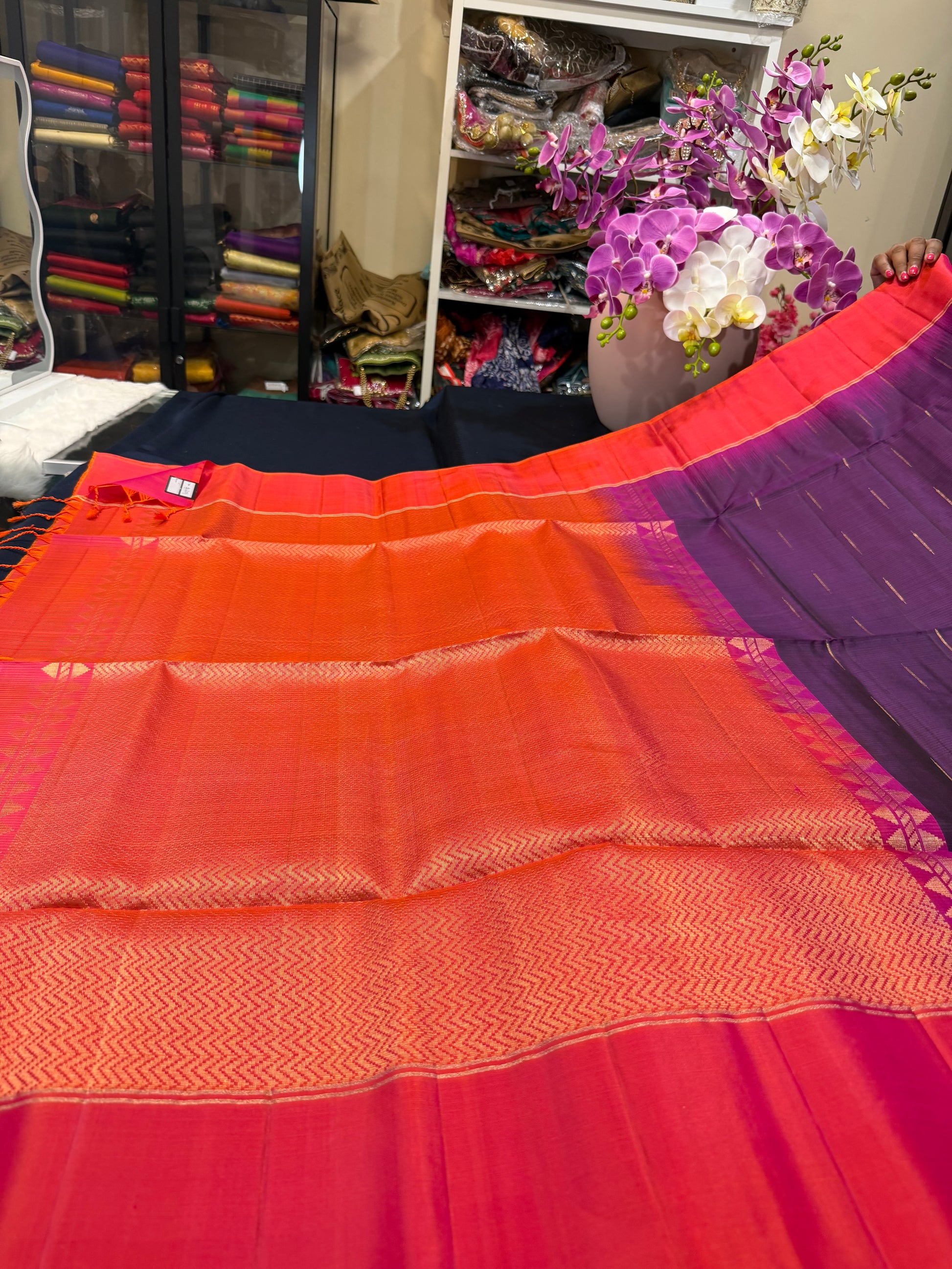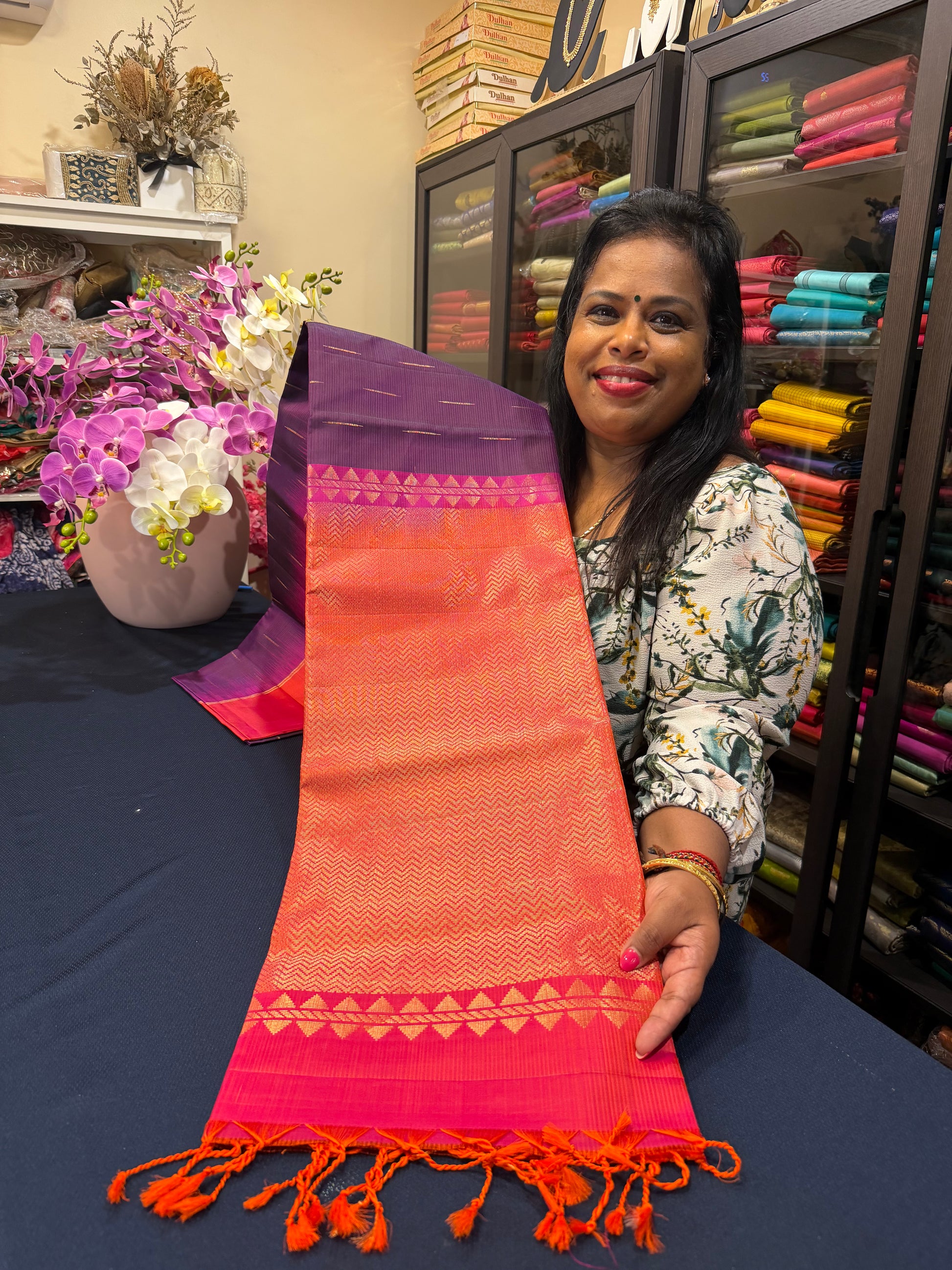Grace your wardrobe with this elegant Kanchipuram Soft Silk Saree, beautifully crafted in a rich purple body complemented by dual tone Orangish Pink accents. Woven with finesse using premium soft silk, this saree offers a smooth texture, gentle sheen, and effortless drape.