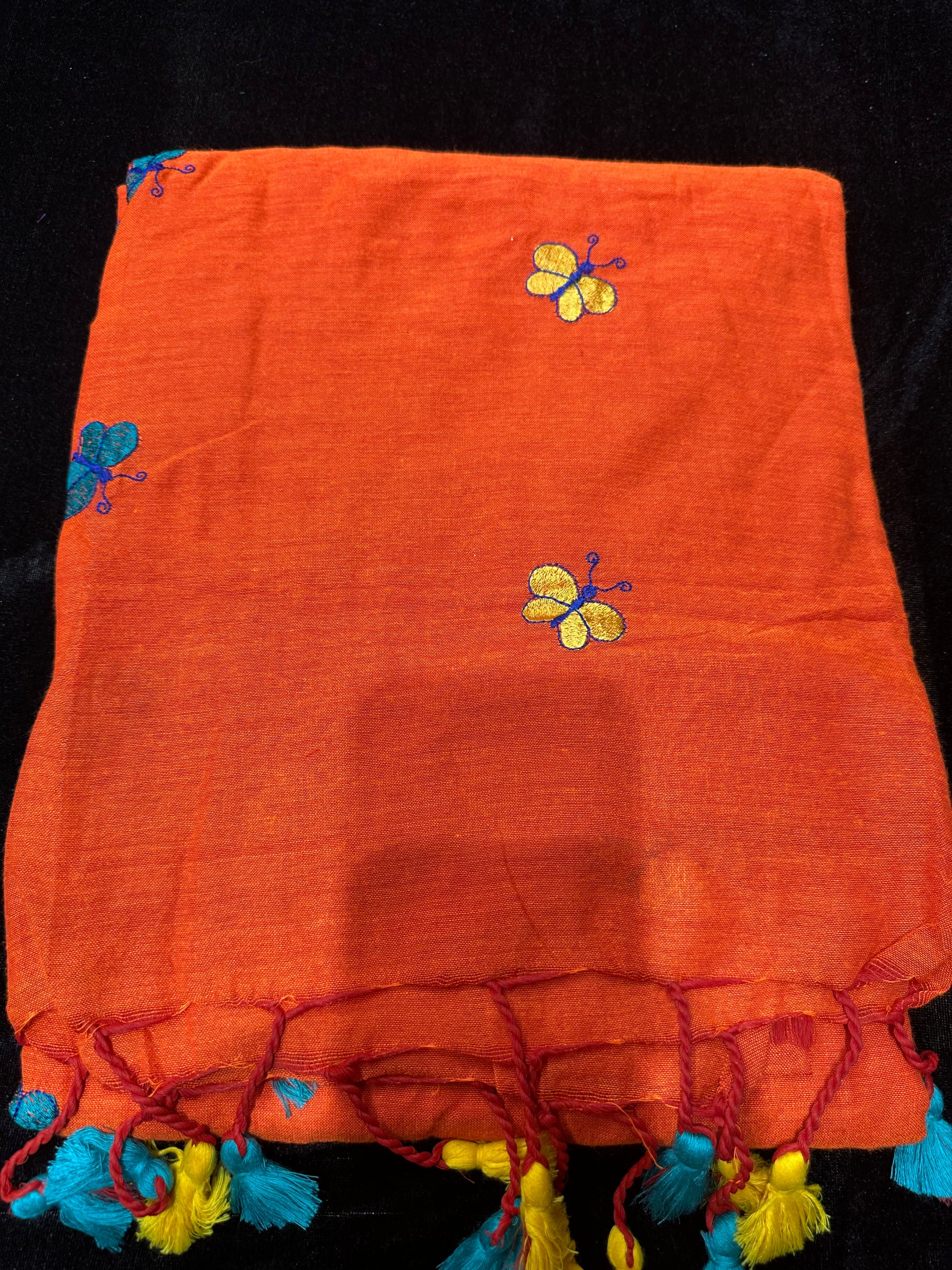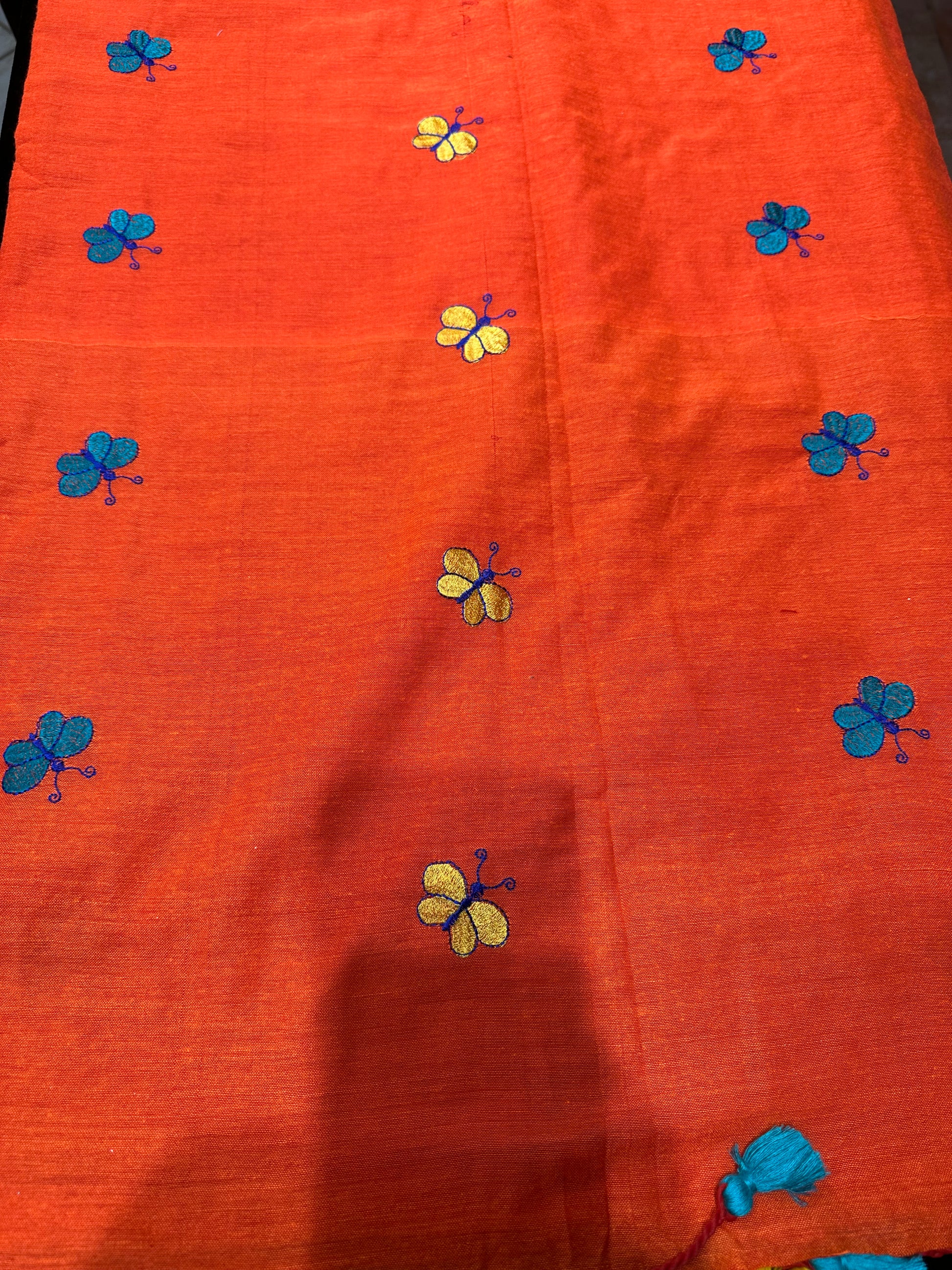 This is a Khadi cotton Sariย in an orange color, featuring embroidery of small yellow and blue butterfly motifs and yellow and blue tassels along the edge. The fabric has a distinct slubby, handloom texture, characteristic of khadi cotton.ย